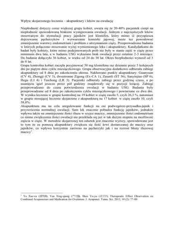 Wpływ skojarzonego leczenia – akupunktury i leków na owulację Niepłodność dotyczy coraz większej grupy kobiet, uważa się że 20-40% pacjentek cierpi na niepłodność spowodowaną brakiem występowania owulacji. Jednym z najczęstszych leków stosowanym do stymulacji pracy jajników jest klomifen, który mimo iż przyspiesza dojrzewanie pęcherzyków i wytwarzanie komórki jajowej, może tez powodować zmniejszenie warstwy endometrium i problem z utrzymaniem ciąży. Przeprowadzono badania w których połączono stosowanie wyżej wymienionego leku i akupunktury. Kandydatkami do badań były kobiety, które mimo podejmowanych prób nie były w stanie zajść w ciąże przez minimum dwa lata, a w badaniu USG wykazano brak owulacji przez ostatnie 2-3 miesiące. Do badania dołączyło 36 kobiet, w wieku od 24 do 38 lat. Okres bezpłodności wynosił od 3 do 8 lat. Grupa kontrolna kobiet zaczęła przyjmować 50 mg klomifenu raz dziennie przez 5 kolejnych dni po piątym dniu cyklu miesiączkowego. Grupa obserwacyjna dodatkowo odbierała zabiegi akupunktury od 8 dnia po zakończeniu okresu. Nakłuwano punkty akupunktury: Guanyuan (CV 4), Zhongji (CV 3), dwustronne Zigong (Ex-CA 1), Zusanli (ST 36), Sanyinjiao (SP 6), Hegu (LI 4) i Taichong (LR 3). Pacjentki odbierały zabiegi przez godzinę czasu, a po usunięciu igieł jeszcze przez pół godziny znajdowały się w pozycji leżącej. Zabiegi przeprowadzano do czasu potwierdzenia owulacji w badaniu USG. Badania były przeprowadzane od 8 dnia po zakończeniu cyklu miesiączkowego i powtarzane co dwa dni. W wyniku leczenia w grupie kontrolnej na 19 kobiet w ciążę zaszło 5, czyli 26,3 %, natomiast w grupie stosującej leczenie skojarzone z akupunkturą na 17 kobiet w ciążę zaszło 10, czyli 58,8%. Akupunktura ma na celu uregulowanie funkcji na osi podwzgórze-przysadka-jajnik i przywrócenia normalnej owulacji. Sam lek znacznie pobudza funkcję jajników, jednakże wpływa także na zmniejszenie ilości śluzu w szyjce macicy, zmniejszenie ilości endometrium co mimo zwiększenia ilości owulacji nie przekłada się już w tak dużym stopniu na możliwość zajścia w ciąże. W metodzie skojarzonej ten odsetek jest znacznie wyższy, spowodowane jest to tym że za pomocą akupunktury zwiększa się ilość krwi dostarczanej do macicy oraz jajników, co wpływa korzystnie zarówno na pęcherzyki jak i na rozrost błony śluzowej macicy1. 1 Yu Xue-su (虞雪素), Yan Xing-qiang (严兴强), Shen Yu-yu (沈玉宇); Therapeutic Effect Observation on Combined Acupuncture and Medication for Ovulation. J. Acupunct. Tuina. Sci. 2012, 10 (2): 77-80