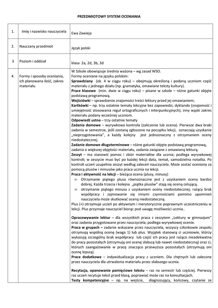 PRZEDMIOTOWY SYSTEM OCENIANIA 1. Imię i nazwisko nauczyciela Ewa Zawieja 2. Nauczany przedmiot Język polski 3 Poziom i oddział klasa 2a, 2d, 3b, 3d 4. Formy i sposoby oceniania, ich planowana ilość, zakres materiału W Szkole obowiązuje średnia ważona – wg zasad WSO. Formy oceniane na języku polskim: Sprawdziany (ok. 4 w ciągu roku) – obejmują określoną i podaną uczniom część materiału z jednego działu (np. gramatyka, omawiane teksty kultury). Prace klasowe (min. dwie w ciągu roku) – pisane w szkole – różne gatunki objęte podstawą programową. Wejściówki – sprawdzenie znajomości treści lektury przed jej omawianiem; Kartkówki – np. trzy ostatnie tematy lekcyjne bez zapowiedzi, dyktando (znajomość i umiejętność stosowania reguł ortograficznych i interpunkcyjnych), inny wąski zakres materiału podany wcześniej uczniom. Odpowiedź ustna – trzy ostatnie tematy Zadania domowe – wyrywkowa kontrola (zaliczenie lub ocena). Pierwsze dwa braki zadania w semestrze, jeśli zostaną zgłoszone na początku lekcji, oznaczają uzyskanie „nieprzygotowania”, a każdy kolejny jest jednoznaczny z otrzymaniem oceny niedostatecznej. Zadanie domowe długoterminowe – różne gatunki objęte podstawą programową, zadania o większej objętości materiału, zadania związane z omawianą lekturą. Zeszyt – ma stanowić pomoc i zbiór materiałów dla ucznia; podlega wyrywkowej kontroli; w zeszycie musi być po każdej lekcji data, temat, samodzielna notatka. Po kontroli uczeń uzupełnia zeszyt według zaleceń nauczyciela. Może zostać oceniony za pomocą plusów i minusów jako praca ucznia na lekcji. Praca i aktywność na lekcji – bieżąca ocena (plusy, minusy) • Otrzymanie piątego plusa równoznaczne jest z uzyskaniem oceny bardzo dobrej, Każda trzecia i kolejna „piątka plusów” stają się oceną celującą. • otrzymanie piątego minusa z uzyskaniem oceny niedostatecznej; rażący brak współpracy i zajmowanie się innymi czynnościami pomimo upomnień nauczyciela może skutkować oceną niedostateczną. Plus (+) otrzymuje uczeń po aktywnym i merytorycznie poprawnym uczestniczeniu w lekcji. Plus przyznaje nauczyciel biorąc pod uwagę możliwości ucznia.. Opracowywanie lektur – dla wszystkich praca z zeszytem „Lektury w gimnazjum” oraz zadania przygotowane przez nauczyciela; podlega wyrywkowej ocenie. Praca w grupach – zadanie wskazane przez nauczyciela, wszyscy członkowie zespołu otrzymują wspólną ocenę (waga 1) lub plus. Wyjątek stanowią ci uczniowie, którzy wykazują szczególny brak współpracy lub część ich pracy jest rażąco nieadekwatna do pracy pozostałych (otrzymują oni ocenę słabszą lub nawet niedostateczną) oraz ci, których zaangażowanie w pracę znacząco przewyższa pozostałych (otrzymują oni ocenę lepszą). Prace dodatkowe – indywidualizacja pracy z uczniem. Dla chętnych lub zalecone przez nauczyciela dla utrwalenia materiału przez słabszego ucznia. Recytacja, opanowanie pamięciowe tekstu – raz na semestr lub częściej. Pierwszy raz uczeń recytuje tekst przed klasą, poprawiać może raz na konsultacjach. Testy kompetencyjne – np. na wejście, diagnozujący, końcowy, czytanie ze zrozumieniem – w zależności od potrzeb uczniów, nie musi dotyczyć omawianego aktualnie materiału. 5. Dodatkowe zadania podlegające ocenie Okazjonalne prace wymagające twórczego myślenia np. plakaty, gazetki, wiersze, opowiadania, projekty – indywidualne i grupowe Referat na temat wybrany lub zaproponowany przez nauczyciela, Uczestnictwo w konkursach, olimpiadach, zawodach szkolnych, międzyszkolnych. Opracowanie i wykonanie pomocy naukowych. Czytanie i opracowywanie dodatkowych lektur (tytuły ustalone z nauczycielem). 6. 7. Termin wcześniejszego powiadomienia uczniów o kontroli i ocenie. Tryb oddawania prac pisemnych. 8. Sprawdziany pisemne, testy, prace klasowe, powtórzenia wiadomości – co najmniej tydzień przed terminem, Kartkówki, odpowiedź ustna, zadanie domowe, zeszyt – bez zapowiedzi, Referat - tydzień przed prezentacją, Recytacja – 2 tygodnie wcześniej Zadania domowe w formie wypracowania – tydzień wcześniej Wejściówki – pierwszy dzień omawiania lektury (termin omawiania zależy od objętości utworu) Zadania dodatkowe - termin wyznaczony przez nauczyciela. Nauczyciel poprawia krótkie formy sprawdzania wiadomości i umiejętności w ciągu tygodnia, a długie formy (sprawdziany, wypracowania itp.) w ciągu dwóch tygodni. W sytuacji nieobecności nauczyciela w pracy czas poprawy wydłuża się o odpowiednią liczbę dni. Po przekroczeniu przez nauczyciela terminu, uczeń ma prawo nie przyjąć oceny. Według zasad WSO. Kryteria poszczególnych ocen w przypadku punktowych form oceniania Dodatkowo: Celujący – uczeń opanował całość materiału, w sposób oryginalny przetwarza zdobyte informacje, charakteryzuje się twórczym myśleniem, wykonuje zadania dla chętnych, opracowuje dodatkowe lektury Bardzo dobry – uczeń pracuje bardzo dobrze, opanował materiał, wykonuje zadania dla chętnych, poznaje dodatkowe lektury (konkretne uzgodnione z nauczycielem) Dobry – uczeń pracuje w stopniu dobrym, poszerza wiedzę o lektury wskazane przez nauczyciela Dostateczny – uczeń podejmuje trud rozwoju w umiarkowany sposób. Dopuszczający – 1. uczeń, który mimo licznych deficytów i zaległości systematycznie próbuje rozwinąć wiedzę i umiejętności polonistyczne. 2. uczeń, który posiadając wrodzone możliwości nie podejmuje trudu rozwoju, nie czyta lektur, nie odrabia zadań domowych, nie pracuje na lekcji, ale bazując na wiedzy z lekcji umie rozwiązywać problemy Niedostateczny – uczeń nie wypełnia poleceń, nie czyta lektur, odmawia współpracy na lekcji, świadomie pogłębia zaległości programowe, lekceważy nadrabianie braków, nie korzysta z zajęć wyrównawczych. 9. Tryb poprawiania lub uzyskania ocen cząstkowych w prz
