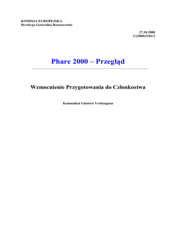 KOMISJA EUROPEJSKA Dyrekcja Generalna Rozszerzenie 27.10.2000 C(2000)3103/2 Phare 2000 – Przegląd __________________________________________________________________ Wzmocnienie Przygotowania do Członkostwa Komunikat Güntera Verheugena SPIS TREŚCI 3 STRESZCZENIE OGÓLNE................................................................................................................................ 2 1. WPROWADZENIE .................................................................................................................................... 44 2. POSTĘP WE WDRAŻANIU REFORM Z 1997 ROKU ......................................................................... 55 2.1. 2.2. EFEKTY POZYTYWNE ............................................................................................................................. 55 POZOSTAŁE PROBLEMY .......................................................................................................................... 66 3. WYZWANIA DO ROKU 2006 .................................................................................................................. 77 4. WPROWADZENIE REFORM Z 1997 ROKU. ....................................................................................... 77 4.1. ROZWÓJ INSTYTUCJONALNY I REFORMA ADMINISTRACJI PUBLICZNEJ. ....................................................... 88 4.1.1. Twinning średniookresowy.................................................................................................................. 88 4.1.2.Ogólna reforma administracji publicznej. ........................................................................................... 88 4.1.3 Programy wielonarodowe .................................................................................................................... 99 4.2. PODNIESIENIE EFEKTYWNOŚCI PROJEKTÓW PHARE................................................................................ 99 4.3. ZWIĘKSZENIE ZDOLNOŚCI ABSORPCYJNEJ KRAJÓW KANDYDUJĄCYCH ............................................... 1010 5.W STRONĘ FUNDUSZY STRUKTURALNYCH ................................................................................... 1212 5.1 EWOLUCJA WSPARCIA PROGRAMU PHARE W KIERUNKU SPÓJNOŚCI SPOŁECZNEJ I GOSPODARCZEJ. ........ 1212 5.1.1. Przedstawienie celów Phare w obszarze spójności społeczno – gospodarczej ............................... 1313 5.1.2. Przygotowanie strategii dla Spójności społeczno – gospodarczej. ................................................. 1414 5.1.3 Wdrożenie podejścia Celu 1 w Phare............................................................................................... 1515 5.1.4 Rozszerzanie podejścia programowego w Phare ............................................................................. 1515 5.1.5 Wzmocnienie Współpracy Przygranicznej Phare z programem Interreg......................................... 1717 5.2 WIELOLETNIE PROGRAMOWANIE INDYKATYWNE .............................................................................. 1919 5.3 ROZSZERZENIE DECENTRALIZACJI ..................................................................................................... 2121 5.4 PRZEKSZTAŁCENIE WSPARCIA DLA AGENCJI WDRAŻAJĄCEJ ................................................................... 2424 6. WDRAŻANIE I HARMONOGRAMY................................................................................................. 2424 Załącznik 1 Załącznik 2 Załącznik 3 Załącznik 4 Załącznik 5 Przegląd postępów od 1997 roku Wyciąg z Rozporządzenia 1299/99 Streszczenie działań krótko i długoterminowych Opracowywanie projektów i schematów Cykl programu Phare Phare 2000 Przegląd 2 Streszczenie ogólne Prezentowany Komunikat przedstawia wnioski z ostatniego przeglądu programu Phare, jednego z trzech instrumentów przedakcesyjnych, które wspomagają kraje kandydujące w przygotowaniu do członkostwa w Unii Europejskiej. Przegląd ten ocenił, czy orientacja Phare, wprowadzona w 1997 roku i uaktualniona w 1999, ciągle realizuje potrzeby krajów kandydujących i czy niezbędne są jakiekolwiek dalsze zmiany. W przeglądzie wzięto pod uwagę nową sytuację powstałą w wyniku przyjęcia Agendy 2000 w trakcie posiedzenia Rady Europejskiej w Berlinie, włącznie ze wzrostem budżetu Phare, a także postęp osiągnięty w negocjacjach akcesyjnych z dziesięcioma krajami, które korzystają z Phare od 2000 roku. W przeglądzie wykazano, że obecna orientacja Phare w dalszym ciągu wspiera realizację najważniejszych priorytetów krajów kandydujących. Kontynuowane powinno być programowanie rozwiązujące problemy przedakcesyjne, oparte na Partnerstwie dla Członkostwa, Narodowym Programie Przygotowania do Członkostwa, Raportach Okresowych oraz procesie negocjacyjnym. Najważniejszym celem Phare powinien pozostać rozwój instytucjonalny oraz promowanie wdrażania dorobku prawnego Wspólnoty, bezpośrednio pomagające krajom wypełnić kryteria polityczne, ekonomiczne oraz związane z wdrożeniem dorobku Wspólnotowego, przedstawione podczas Rady w Kopenhadze w 1993 roku. Przegląd zdefiniował dwa wyzwania dla Phare, które Komisja musi podjąć w okresie 20002006: (1) Wsparcie dokonanych reform. Obecnie powinien nastąpić okres stosunkowej stabilizacji, aby umocnić dokonania przeprowadzonych ostatnio reform i zagwarantować ich pełen sukces. Dodatkowo, niektóre z reform z roku 1997 powinny być poprawione zgodnie z krytycznymi uwagami Trybunału Audytorów oraz Parlamentu Europejskiego. Ponadto należy zwiększyć wysiłek zmierzający do wzmocnienia oraz poprawy możliwości absorpcyjnych krajów kandydujących. (2) Przesunięcie do funduszy strukturalnych. Celem jest przesunięcie połowy środków inwestycyjnych Phare z programów krajowych na ten cel. Celem Phare w tym obszarze jest: (a) Przygotowanie do wdrażania funduszy strukturalnych w krajach kandydujących poprzez stworzenie odpowi