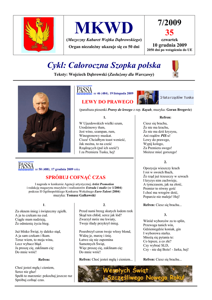 MKWD 7/2009 35 (Muzyczny Kabaret Wojtka Dąbrowskiego) czwartek Organ niezależny ukazuje się co 50 dni 10 grudnia 2009 2050 dni po wstąpieniu do UE Cykl: Całoroczna Szopka polska Teksty: Wojciech Dąbrowski (Zasłużony dla Warszawy) nr 46 (484), 19 listopada 2009 LEWY DO PRAWEGO (parafraza piosenki Prawy do lewego z rep. Kayah, muzyka: Goran Bregovic) 1. W Ujazdowskich wielki szum, Urodzinowy tłum, Jest wino, szampan, rum, Winogronowy muskat. Cisza! Chciałbym toast wznieść, Jak można, to na cześć Rządzących (pal ich sześć!) I za Premiera Tuska, hej! Refren: Ciesz się brachu, Że nie ma krachu, Że nie ma dziś kryzysu, Ani rządów PIS-u! Lewy do prawego, Wypij kolego, Za Premiera swego! Możesz mieć gorszego! 2. nr 50 (488), 17 grudnia 2009 roku SPRÓBUJ COFNĄĆ CZAS I nagroda w konkursie Agencji artystycznej Artist Promotion i redakcję magazynu muzyków i realizatorów Estrada i studio (nr 1/2004) podczas II Ogólnopolskiego Konkursu Wokalnego Euro-Talent (2004) muzyka: Tomasz Gałkowski 1. 2. Za oknem śnieg i świąteczny zgiełk. A ja tu czekam na cud. Ciągle mam nadzieję, Że odmienię życia bieg. Przed nami brzeg skutych lodem rzek Skąd ten chłód, serce jak lód? Zwarzył mróz me kwiaty, Twoje ślady przykrył śnieg. Już blisko Świąt, ty daleko stąd, A ja sam czekam i łkam. Teraz wiem, to moja wina, Lecz wybacz błąd. Ja proszę cię, zaklinam cię: Do mnie wróć! Posrebrzył szron twoje włosy blond, Widzę je, marzę i śnię. Łatwo się nie zapomina Samotnych Świąt, Więc proszę cię, zaklinam cię: Do mnie wróć! Refren: Choć jesteś mgłą i cieniem, Serce nie głaz! Spełń to marzenie: pokochaj jeszcze raz Spróbuj cofnąć czas. Refren: Choć jesteś mgłą i cieniem... Opozycja wieszczy krach I roi w swoich łbach, Że rząd już trzeszczy w szwach I kryzys nim zachwieje, A tymczasem, jak na złość, Premier to równy gość I choć ma wrogów dość, Poparcie nie maleje! Hej! Refren: Ciesz się brachu... 3. Wśród wyborców za to splin, Przewaga tanich win, Gdzieniegdzie koniak, gin I wyborowa starka. Mnożą się pytania te: Co lepsze, a co złe? Czy wybrać SLD, Czy - nie daj Boże! - Jarka, hej! Refren: Ciesz się brachu... str. 2 MKWD, nr 7 (35) /2009, Warszawa, czwartek, 10 grudnia 2009 roku (2050 dni po wstąpieniu do UE) nr 48 (486), 3 grudnia 2009 roku OBOWIĄZKOWA MATURA Z MATEMATYKI Tegoroczni maturzyści będą po raz pierwszy zdawać obowiązkową maturę z matematyki. Tu i ówdzie odzywają się głosy, że tematy egzaminacyjne powinny być jak najściślej powiązane z życiem i kłaść nacisk na zastosowania praktyczne matematyki. Przyłączam się do tego postulatu i przedstawiam poniżej kilka propozycji zadań maturalnych. Zadania rachunkowe: Budżet Kancelarii Prezydenta Lecha Kaczyńskiego wzrósł w ciągu trzech lat o 148% (budżet Biura Bezpieczeństwa Narodowego o 326%, a wydatki na odznaczenia o 177%) i wynosi obecnie 189 mln. zł. W kampanii wyborczej Lech Kaczyński zapowiadał zmniejszenie budżetu kancelarii o 20%. Jaki powinien być budżet kancelarii Prezydenta, gdyby Lech Kaczyński dotrzymał obietnicy wyborczej? Roczny budżet CBA wynosi 116 mln zł, biuro zatrudnia 780 funkcjonariuszy. Willa w Kazimierzu ma wartość 3 mln zł. Ilu agentów Tomków może dodatkowo zatrudnić i ile takich willi może jeszcze zakupić CBA? Zadanie praktyczne (z życia wzięte): Grupa wycieczkowa zakupiła bilety za przejazd pociągiem pospiesznym spółki IC relacji Świnoujście-Warszawa za kwotę 1400 zł. Przejazd na odcinku Świnoujście-Szczecin odbyła tańszym pociągiem osobowym prowadzonym przez spółkę Przewozy Regionalne. Za ten przejazd musiała dopłacić 280 zł (przy czym konduktor naliczył dodatkowo karę za jazdę bez ważnego biletu w wysokości 4000 zł). Spółka IC zwróciła nadwyżkę za niewykorzystany bilet na pociąg pospieszny na tym odcinku w kwocie 40 zł. Na ile złotych spółka IC każdorazowo rżnie swoich klientów? Trzymam kciuki za maturzystów i serdecznie pozdrawiam. Wojciech Dąbrowski (nauczyciel matematyki z 45-letnim stażem) ZNAJDŹ PTASZKA ZABAWA DLA MŁODSZYCH DZIECI Zadania otwarte: Zamierzasz ustawić przetarg lub starasz się o atrakcyjną działkę budowlaną np. na Helu lub w Mrągowie, albo lobbujesz na rzecz korzystnych zapisów w ustawie hazardowej. Jaką kwotą musisz dysponować w celu pomyślnego załatwienia powyższych spraw? Zbadaj zależność funkcyjną pomiędzy wartością transakcji a poniesionymi nakładami. WERSJA DLA STARSZYCH DZIEWCZYNEK Liczba zatrzymanych działaczy sportowych w kolejnych miesiącach tworzy ciąg geometryczny. Po ilu miesiącach zabraknie sędziów do prowadzenia spotkań ligowych i międzynarodowych? Zadanie z logiki matematycznej: Zdaniem posłanki Nelly Rokity niektórzy posłowie PiS mówią prawdę, za to niektórzy posłowie PO kłamią. Która z partii jest bardziej wiarygodna? Odpowiedź uzasadnij. Analiza danych statystycznych: Porównując wyniki ostatnich sondaży popularności poszczególnych partii politycznych, zbadaj czy spadek poparcia PiS odbywa się w postępie arytmetycznym czy już geometrycznym. MKWD na żywo: Giełda Satyry Politycznej Marka Majewskiego ul. Smolna 9 www.dks.art.pl poniedziałki, 14 grudnia 2009 roku, 25 stycznia 2010 roku, godz. 19 © MKWD (Muzyczny Kabaret Wojtka Dąbrowskiego) Warszawa, tel / fax (22) 641 64 40, 0-600 630 952 www.spotkaniazpiosenka.org Następny numer ukaże się 29 stycznia 2010 roku (2100 dni po wstąpieniu do UE) Sąsiad spod trójki, dodatek do MKWD, nr 7 (35) /2009, 10 grudnia 2009 roku I Właściciel magla wystawił na aukcji swoje wieczne pióro. Dziwnym zbiegiem okoliczności nabywcą okazał się facet, który stale robi mu koło pióra. środa, 4 listopada W obliczu nadciągającej grypy i zapowiedzi, że szczepionek nie będzie, sąsiad spod trójki postanowił sięgnąć po stare wypróbowane sposoby medycyny ludowej, stosowane przez żołnierzy syberyjsk