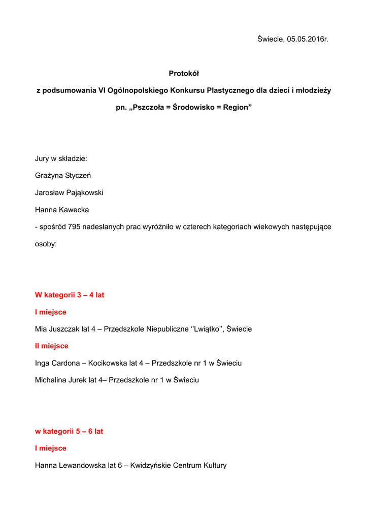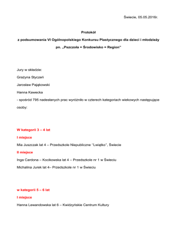 Świecie, 05.05.2016r. Protokół z podsumowania VI Ogólnopolskiego Konkursu Plastycznego dla dzieci i młodzieży pn. „Pszczoła = Środowisko = Region” Jury w składzie: Grażyna Styczeń Jarosław Pająkowski Hanna Kawecka - spośród 795 nadesłanych prac wyróżniło w czterech kategoriach wiekowych następujące osoby: W kategorii 3 – 4 lat I miejsce Mia Juszczak lat 4 – Przedszkole Niepubliczne ‘’Lwiątko’’, Świecie II miejsce Inga Cardona – Kocikowska lat 4 – Przedszkole nr 1 w Świeciu Michalina Jurek lat 4– Przedszkole nr 1 w Świeciu w kategorii 5 – 6 lat I miejsce Hanna Lewandowska lat 6 – Kwidzyńskie Centrum Kultury II miejsce Lenka Grzegorz lat 5 – Przedszkole Niepubliczne ‘’Lwiątko’’ w Świeciu Amelia Jastrzębska lat 6 – Młodzieżowy Dom Kultury im. Króla Maciusia Pierwszego w Płocku Kacper Zasadowski lat 6 – Młodzieżowy Dom Kultury im. Króla Maciusia Pierwszego w Płocku III miejsce Amelia Słomska lat 6 – Przedszkole nr 6 w Świeciu Jakub Porożyński lat 6 – Przedszkole nr 8 w Świeciu Julia Dorau lat 6 – Przedszkole nr 9 w Świeciu Eliza Stefan lat 6 – Przedszkole nr 8 w Świeciu kategoria 7 – 9 lat I miejsce Oliwia Topolińska lat 9 – Gminny Ośrodek Kultury w Cekcynie II miejsce Agata Gałuszkiewicz lat 9 – Zespół Szkół w Jeżewie Aleksandra Kasztelan lat 7 – Kwidzyńskie Centrum Kultury Maja Pieczka lat 8 – Szkoła Podstawowa nr 1 w Świeciu Lena Bień lat 7 – Chełmiński Dom Kultury III miejsce Oliwia Jelińska lat 7 – Gminny Ośrodek Kultury w Cekcynie Martyna Kochanowska lat 9 – Miejska Instytucja Kultury Dom Muz w Toruniu Marta Matyja lat 8 – Chełmiński Dom Kultury Anna Jeneralska lat 8 – Szkoła Podstawowa w Warlubiu kategoria 10 – 13 lat I miejsce Hanna Bałog lat 11- Kwidzyńskie Centrum Kultury Jagoda Wilamowicz lat 12– Miejska Instytucja Kultury Dom Muz w Toruniu II miejsce Kacper Jędrzejewski lat 11 – Szkoła Podstawowa w Lnianie Natalia Górka lat 12 – Gminny Ośrodek Kultury w Cekcynie Oliwia Raniszewska lat 11 – Szkoła Podstawowa nr 7 w Świeciu Wyróżnienie Agata Załęska lat 10 – Gminny Ośrodek Kultury Sportu i Rekreacji w Pruszczu Uwaga! Wręczenie nagród i wyróżnień nastąpi w czasie „Balu Pszczółek”, 19 maja br., w godz. 9.00-12.00, w HALI WIDOWISKOWO-SPORTOWEJ w Świeciu. Serdecznie zapraszamy laureatów konkursu wraz z opiekunami.