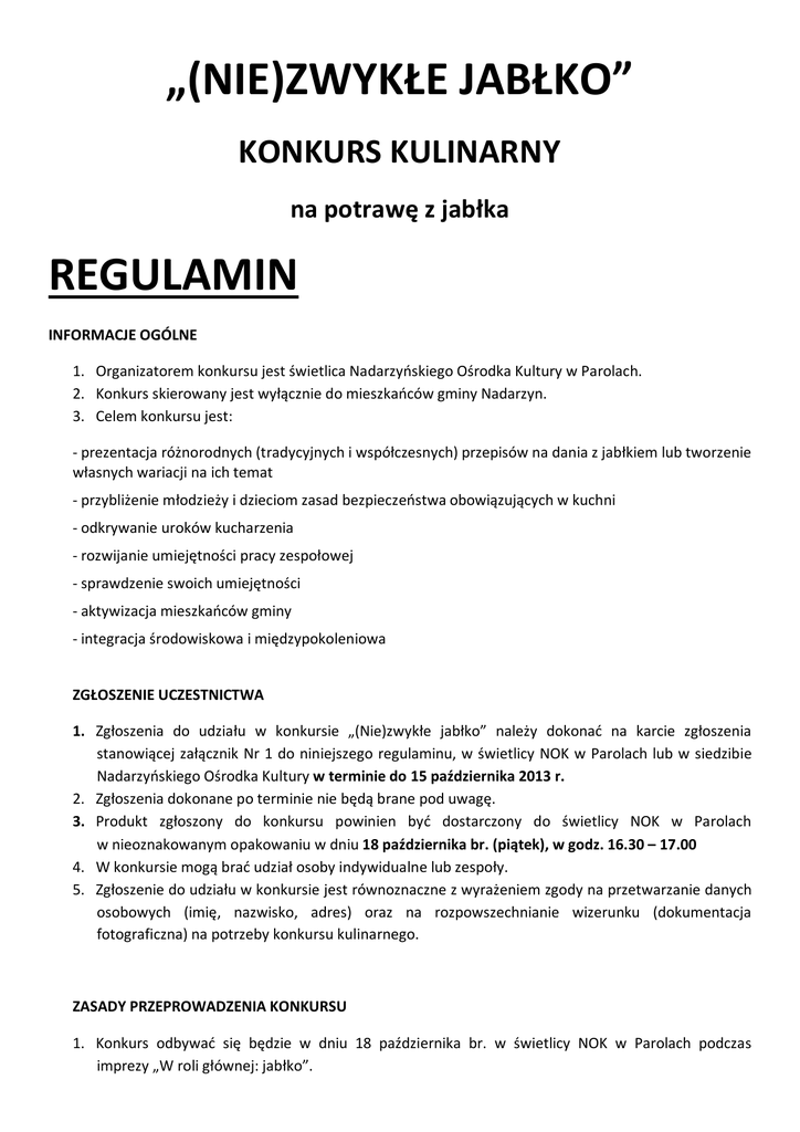 „(NIE)ZWYKŁE JABŁKO” KONKURS KULINARNY na potrawę z jabłka REGULAMIN INFORMACJE OGÓLNE 1. Organizatorem konkursu jest świetlica Nadarzyńskiego Ośrodka Kultury w Parolach. 2. Konkurs skierowany jest wyłącznie do mieszkańców gminy Nadarzyn. 3. Celem konkursu jest: - prezentacja różnorodnych (tradycyjnych i współczesnych) przepisów na dania z jabłkiem lub tworzenie własnych wariacji na ich temat - przybliżenie młodzieży i dzieciom zasad bezpieczeństwa obowiązujących w kuchni - odkrywanie uroków kucharzenia - rozwijanie umiejętności pracy zespołowej - sprawdzenie swoich umiejętności - aktywizacja mieszkańców gminy - integracja środowiskowa i międzypokoleniowa ZGŁOSZENIE UCZESTNICTWA 1. Zgłoszenia do udziału w konkursie „(Nie)zwykłe jabłko” należy dokonać na karcie zgłoszenia stanowiącej załącznik Nr 1 do niniejszego regulaminu, w świetlicy NOK w Parolach lub w siedzibie Nadarzyńskiego Ośrodka Kultury w terminie do 15 października 2013 r. 2. Zgłoszenia dokonane po terminie nie będą brane pod uwagę. 3. Produkt zgłoszony do konkursu powinien być dostarczony do świetlicy NOK w Parolach w nieoznakowanym opakowaniu w dniu 18 października br. (piątek), w godz. 16.30 – 17.00 4. W konkursie mogą brać udział osoby indywidualne lub zespoły. 5. Zgłoszenie do udziału w konkursie jest równoznaczne z wyrażeniem zgody na przetwarzanie danych osobowych (imię, nazwisko, adres) oraz na rozpowszechnianie wizerunku (dokumentacja fotograficzna) na potrzeby konkursu kulinarnego. ZASADY PRZEPROWADZENIA KONKURSU 1. Konkurs odbywać się będzie w dniu 18 października br. w świetlicy NOK w Parolach podczas imprezy „W roli głównej: jabłko”. 2. Danie biorące udział w konkursie musi być dostarczone w ilości pozwalającej na przygotowanie 43 niewielkich porcji do degustacji ( w tym 3 dla komisji konkursowej). 3. Jeżeli danie nie będzie podzielne na 43 porcje zostanie wykluczone z konkursu. 4. Zgłoszone do konkursu danie to własnoręczny wyrób osób zgłaszających. 5. Danie można dowolnie wzbogacić naturalnymi dodatkami spożywczymi, jednak jabłka muszą stanowić podstawowy składnik potrawy. 6. Uczestnik konkursu zobowiązany jest do prezentacji potrawy zgłoszonej i opisanej w karcie zgłoszeniowej. 7. Organizator zapewnia niezbędną do degustacji zastawę, sztućce, itp. 8. Uczestnik konkursu podaje do oceny komisji konkursowej 3 porcje potrawy. 9. Potrawy oceniać będzie powołana 3 osobowa komisja konkursowa. 10. Członkowie komisji oceniają potrawy zgłoszone do konkursu przyznając punkty na karcie oceny. 11. Wygrywają dania, którym przyznano największą liczbę punktów. Jeżeli taką samą liczbę punktów uzyskają dwie potrawy lub więcej głos decydujący ma przewodniczący Komisji biorąc pod uwagę przede wszystkim smak potrawy. 12. Ocenie podlegać będzie: - spełnienie wymogów określonych regulaminem i tematyką konkursu - wygląd potrawy i dekoracja - smak, zapach, konsystencja - oryginalność i pomysłowość 13. Rozstrzygnięcie konkursu nastąpi w dniu 18 października 2013 r. w świetlicy NOK w Parolach. 14. Decyzje komisji konkursowej są ostateczne. Nagrody Organizator przewiduje nagrody rzeczowe za trzy pierwsze miejsca. Załącznik Nr 1 do regulaminu konkursu kulinarnego KARTA ZGŁOSZENIA uczestnictwa w konkursie kulinarnym „(NIE)ZWYKŁE JABŁKO” Dane osobowe Imię i nazwisko (zgłoszenia indywidualne) Nazwa (koło gospodyń, świetlica, itp.) + nazwisko osoby odpowiedzialnej Adres zamieszkania Telefon kontaktowy Nazwa potrawy Przepis na potrawę (składniki, sposób wykonania) Oświadczam, że akceptuję regulamin konkursu kulinarnego „(NIE)ZWYKŁE JABŁKO”. ……………………………………………………………… (data i czytelny podpis)
