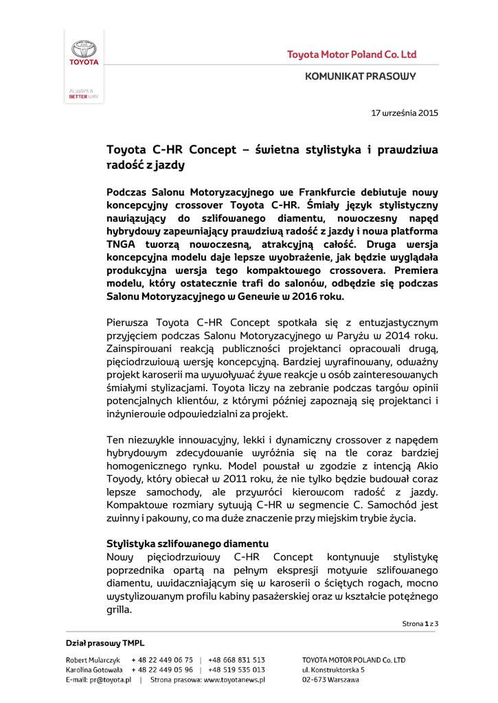 17 września 2015 Toyota C-HR Concept – świetna stylistyka i prawdziwa radość z jazdy Podczas Salonu Motoryzacyjnego we Frankfurcie debiutuje nowy koncepcyjny crossover Toyota C-HR. Śmiały język stylistyczny nawiązujący do szlifowanego diamentu, nowoczesny napęd hybrydowy zapewniający prawdziwą radość z jazdy i nowa platforma TNGA tworzą nowoczesną, atrakcyjną całość. Druga wersja koncepcyjna modelu daje lepsze wyobrażenie, jak będzie wyglądała produkcyjna wersja tego kompaktowego crossovera. Premiera modelu, który ostatecznie trafi do salonów, odbędzie się podczas Salonu Motoryzacyjnego w Genewie w 2016 roku. Pierwsza Toyota C-HR Concept spotkała się z entuzjastycznym przyjęciem podczas Salonu Motoryzacyjnego w Paryżu w 2014 roku. Zainspirowani reakcją publiczności projektanci opracowali drugą, pięciodrzwiową wersję koncepcyjną. Bardziej wyrafinowany, odważny projekt karoserii ma wywoływać żywe reakcje u osób zainteresowanych śmiałymi stylizacjami. Toyota liczy na zebranie podczas targów opinii potencjalnych klientów, z którymi później zapoznają się projektanci i inżynierowie odpowiedzialni za projekt. Ten niezwykle innowacyjny, lekki i dynamiczny crossover z napędem hybrydowym zdecydowanie wyróżnia się na tle coraz bardziej homogenicznego rynku. Model powstał w zgodzie z intencją Akio Toyody, który obiecał w 2011 roku, że nie tylko będzie budował coraz lepsze samochody, ale przywróci kierowcom radość z jazdy. Kompaktowe rozmiary sytuują C-HR w segmencie C. Samochód jest zwinny i pakowny, co ma duże znaczenie przy miejskim trybie życia. Stylistyka szlifowanego diamentu Nowy pięciodrzwiowy C-HR Concept kontynuuje stylistykę poprzednika opartą na pełnym ekspresji motywie szlifowanego diamentu, uwidaczniającym się w karoserii o ściętych rogach, mocno wystylizowanym profilu kabiny pasażerskiej oraz w kształcie potężnego grilla. Strona 1 z 3 Platforma TNGA (Toyota New Global Architecture) C-HR Concept w uderzający sposób demonstruje zalety programu Toyota New Global Architecture. Innowacyjne, zintegrowane podejście do rozwoju samochodów, wprowadzane do kolejnych modeli od tego roku, obejmuje przede wszystkim napędy, platformy oraz innowacyjny proces produkcji. Zastosowanie TNGA w C-HR Concept zaowocowało zwiększeniem sztywności nadwozia, ulepszeniami podwozia i zawieszenia oraz obniżeniem środka ciężkości. Nowa konstrukcja lepiej amortyzuje zderzenia, zapewniając wysoki poziom bezpieczeństwa pasażerom i przechodniom. Większa sztywność nadwozia i niższy środek ciężkości owocują stabilniejszym pokonywaniem zakrętów. Dzięki temu zawieszenie może być mniej sztywne, co podnosi komfort jazdy. Precyzyjne prowadzenie, zwrotność i stabilność dorównują, pomimo wyższego zawieszenia, najlepszym pod tym względem kompaktowym hatchbackom. Zastosowanie nowych technologii produkcji pozwoli szybciej przystosować linię produkcyjną do zmian designu i technicznych udoskonaleń. Strategia TNGA pozwala grupować samochody według podobnych cech i rozmiarów, aby mogły dzielić jak najwięcej strategicznych części i komponentów napędów. Takie podejście ograniczy zużycie zasobów o co najmniej 20%, uwalniając środki inwestycyjne na badania rozwojowe i doskonalenie produktów. Nowy, bardziej wydajny napęd hybrydowy C-HR wprowadza napęd hybrydowy do segmentu crossoverów. Bardziej kompaktowy układ hybrydowy nowej generacji pozwolił obniżyć masę samochodu. Zaawansowane, bardziej wydajne i kompaktowe baterie oraz niezwykle wydajny silnik spalinowy w znacznym stopniu ograniczyły zużycie paliwa i emisję CO2. Samochód hybrydowy to optymalny wybór przy dominujących obecnie warunkach drogowych. Silnik benzynowy wykazuje się najwyższą na świecie wydajnością cieplną przekraczającą 40%. Kompaktowy silnik elektryczny o zwiększonej gęstości mocy współpracuje z najwyższej jakości baterią nowej generacji. Nowy pełny napęd hybrydowy Toyoty został opracowany w technologii TNGA – jest teraz łatwiejszy i bardziej Strona 2 z 3 intuicyjny w prowadzeniu. O radości z jazdy decyduje także układ kierowniczy, który szybciej reaguje na ruchy kierowcy. Globalny projekt o europejskim pochodzeniu Nowy C-HR Concept jest kolejnym wytworem nowej wizji Toyoty, zakreślonej przez Akio Toyodę w 2011 roku. Toyota uważa Europę za najbardziej wymagający rynek małych i średnich samochodów, dlatego firma powierzyła swojemu europejskiemu oddziałowi rolę definiowania przyszłych globalnych modeli z segmentów A, B i C. Toyota Motor Europe (TME) stała się też głównym ośrodkiem rozwoju produktów w kierunku jakości postrzeganej przez użytkowników oraz dynamiki pojazdów. C-HR powstał w wyniku ścisłej współpracy projektantów z Japonii i Europy, która zapewniła dobre zrozumienie oczekiwań europejskich klientów i najnowszych trendów na Starym Kontynencie. Główną rolę odegrało tu studio ED2, europejskie centrum projektowe Toyoty pod Niceą. Entuzjastyczne przyjęcie pierwszego konceptu C-HR rok temu skłoniło Toyotę do kontynuowania prac nad przygotowaniem do rynkowej premiery nowoczesnego crossovera segmentu C. Strona 3 z 3