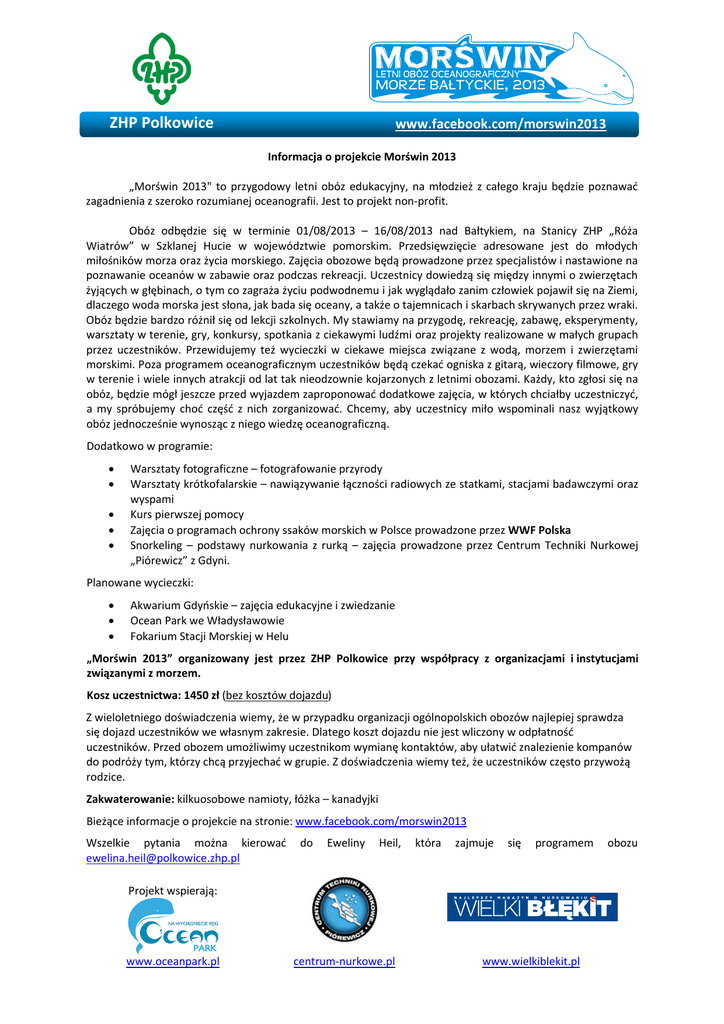 ZHP Polkowice www.facebook.com/morswin2013 Informacja o projekcie Morświn 2013 „Morświn 2013" to przygodowy letni obóz edukacyjny, na młodzież z całego kraju będzie poznawać zagadnienia z szeroko rozumianej oceanografii. Jest to projekt non‐profit. Obóz odbędzie się w terminie 01/08/2013 – 16/08/2013 nad Bałtykiem, na Stanicy ZHP „Róża Wiatrów” w Szklanej Hucie w województwie pomorskim. Przedsięwzięcie adresowane jest do młodych miłośników morza oraz życia morskiego. Zajęcia obozowe będą prowadzone przez specjalistów i nastawione na poznawanie oceanów w zabawie oraz podczas rekreacji. Uczestnicy dowiedzą się między innymi o zwierzętach żyjących w głębinach, o tym co zagraża życiu podwodnemu i jak wyglądało zanim człowiek pojawił się na Ziemi, dlaczego woda morska jest słona, jak bada się oceany, a także o tajemnicach i skarbach skrywanych przez wraki. Obóz będzie bardzo różnił się od lekcji szkolnych. My stawiamy na przygodę, rekreację, zabawę, eksperymenty, warsztaty w terenie, gry, konkursy, spotkania z ciekawymi ludźmi oraz projekty realizowane w małych grupach przez uczestników. Przewidujemy też wycieczki w ciekawe miejsca związane z wodą, morzem i zwierzętami morskimi. Poza programem oceanograficznym uczestników będą czekać ogniska z gitarą, wieczory filmowe, gry w terenie i wiele innych atrakcji od lat tak nieodzownie kojarzonych z letnimi obozami. Każdy, kto zgłosi się na obóz, będzie mógł jeszcze przed wyjazdem zaproponować dodatkowe zajęcia, w których chciałby uczestniczyć, a my spróbujemy choć część z nich zorganizować. Chcemy, aby uczestnicy miło wspominali nasz wyjątkowy obóz jednocześnie wynosząc z niego wiedzę oceanograficzną. Dodatkowo w programie: • • • • • Warsztaty fotograficzne – fotografowanie przyrody Warsztaty krótkofalarskie – nawiązywanie łączności radiowych ze statkami, stacjami badawczymi oraz wyspami Kurs pierwszej pomocy Zajęcia o programach ochrony ssaków morskich w Polsce prowadzone przez WWF Polska Snorkeling – podstawy nurkowania z rurką – zajęcia prowadzone przez Centrum Techniki Nurkowej „Piórewicz” z Gdyni. Planowane wycieczki: • • • Akwarium Gdyńskie – zajęcia edukacyjne i zwiedzanie Ocean Park we Władysławowie Fokarium Stacji Morskiej w Helu „Morświn 2013” organizowany jest przez ZHP Polkowice przy współpracy z organizacjami i instytucjami związanymi z morzem. Kosz uczestnictwa: 1450 zł (bez kosztów dojazdu) Z wieloletniego doświadczenia wiemy, że w przypadku organizacji ogólnopolskich obozów najlepiej sprawdza się dojazd uczestników we własnym zakresie. Dlatego koszt dojazdu nie jest wliczony w odpłatność uczestników. Przed obozem umożliwimy uczestnikom wymianę kontaktów, aby ułatwić znalezienie kompanów do podróży tym, którzy chcą przyjechać w grupie. Z doświadczenia wiemy też, że uczestników często przywożą rodzice. Zakwaterowanie: kilkuosobowe namioty, łóżka – kanadyjki Bieżące informacje o projekcie na stronie: www.facebook.com/morswin2013 Wszelkie pytania można kierować do Eweliny Heil, która zajmuje się programem obozu [email protected] Projekt wspierają: www.oceanpark.pl centrum‐nurkowe.pl www.wielkiblekit.pl