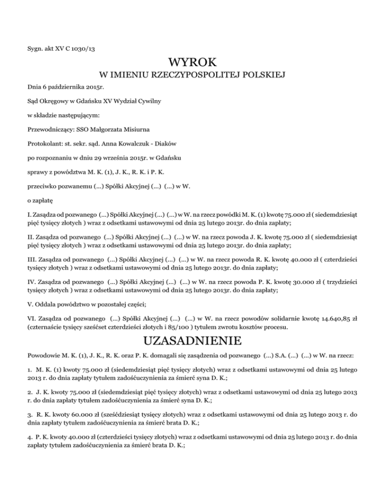 Sygn. akt XV C 1030/13 WYROK W IMIENIU RZECZYPOSPOLITEJ POLSKIEJ Dnia 6 października 2015r. Sąd Okręgowy w Gdańsku XV Wydział Cywilny w składzie następującym: Przewodniczący: SSO Małgorzata Misiurna Protokolant: st. sekr. sąd. Anna Kowalczuk - Diaków po rozpoznaniu w dniu 29 września 2015r. w Gdańsku sprawy z powództwa M. K. (1), J. K., R. K. i P. K. przeciwko pozwanemu (...) Spółki Akcyjnej (...) (...) w W. o zapłatę I. Zasądza od pozwanego (...) Spółki Akcyjnej (...) (...) w W. na rzecz powódki M. K. (1) kwotę 75.000 zł ( siedemdziesiąt pięć tysięcy złotych ) wraz z odsetkami ustawowymi od dnia 25 lutego 2013r. do dnia zapłaty; II. Zasądza od pozwanego (...) Spółki Akcyjnej (...) (...) w W. na rzecz powoda J. K. kwotę 75.000 zł ( siedemdziesiąt pięć tysięcy złotych ) wraz z odsetkami ustawowymi od dnia 25 lutego 2013r. do dnia zapłaty; III. Zasądza od pozwanego (...) Spółki Akcyjnej (...) (...) w W. na rzecz powoda R. K. kwotę 40.000 zł ( czterdzieści tysięcy złotych ) wraz z odsetkami ustawowymi od dnia 25 lutego 2013r. do dnia zapłaty; IV. Zasądza od pozwanego (...) Spółki Akcyjnej (...) (...) w W. na rzecz powoda P. K. kwotę 30.000 zł ( trzydzieści tysięcy złotych ) wraz z odsetkami ustawowymi od dnia 25 lutego 2013r. do dnia zapłaty; V. Oddala powództwo w pozostałej części; VI. Zasądza od pozwanego (...) Spółki Akcyjnej (...) (...) w W. na rzecz powodów solidarnie kwotę 14.640,85 zł (czternaście tysięcy sześćset czterdzieści złotych i 85/100 ) tytułem zwrotu kosztów procesu. UZASADNIENIE Powodowie M. K. (1), J. K., R. K. oraz P. K. domagali się zasądzenia od pozwanego (...) S.A. (...) (...) w W. na rzecz: 1. M. K. (1) kwoty 75.000 zł (siedemdziesiąt pięć tysięcy złotych) wraz z odsetkami ustawowymi od dnia 25 lutego 2013 r. do dnia zapłaty tytułem zadośćuczynienia za śmierć syna D. K.; 2. J. K. kwoty 75.000 zł (siedemdziesiąt pięć tysięcy złotych) wraz z odsetkami ustawowymi od dnia 25 lutego 2013 r. do dnia zapłaty tytułem zadośćuczynienia za śmierć syna D. K.; 3. R. K. kwoty 60.000 zł (sześćdziesiąt tysięcy złotych) wraz z odsetkami ustawowymi od dnia 25 lutego 2013 r. do dnia zapłaty tytułem zadośćuczynienia za śmierć brata D. K.; 4. P. K. kwoty 40.000 zł (czterdzieści tysięcy złotych) wraz z odsetkami ustawowymi od dnia 25 lutego 2013 r. do dnia zapłaty tytułem zadośćuczynienia za śmierć brata D. K.; oraz zasądzenie od pozwanego na rzecz powodów kosztów sądowych, w tym kosztów zastępstwa procesowego według norm prawem przepisanych. W dniu 24 czerwca 2012 roku w miejscowości P. gmina K. miał miejsce wypadek samochodowy, w wyniku którego pasażer samochodu osobowego marki P. (...) nr rej. (...) D. K. poniósł śmierć na miejscu. Pojazd marki P. (...) nr rej. (...) był ubezpieczony w zakresie OC w przedsiębiorstwie pozwanego. W wyniku przeprowadzonego postępowania likwidacyjnego decyzją z dnia 6 marca 2013 r. pozwany wypłacił na rzecz powodów M. K. (1) i J. K. kwoty po 25.000 zł, a na rzecz powodów R. K. i P. K. po 10.000 zł tytułem zadośćuczynienia. W ocenie powodów wypłacone im przez pozwanego zadośćuczynienie jest rażąco niskie i nieadekwatne do cierpienia oraz poniesionej krzywdy w związku z utratą przez nich ukochanej osoby. Powodowie wskazali, iż pomiędzy nimi a zmarłym istniały bardzo silne więzi emocjonalne, co sprawia, że skutki zdarzenia są dla nich wyjątkowo ciężkie, dotykając sfery emocjonalnej, powodując głęboki żal, poczucie pustki i tęsknoty za najbliższą osobą, która była wsparciem w trudach codziennego życia. D. K. mimo że miał 22 lata mieszkał z rodzicami, był z nimi bardzo związany. W ciągu dnia często dzwonił do rodziców, pomagał im czynnościach życia codziennego i w obowiązkach domowych, gotował najbliższym, dbał o nich. Z rodzicami spędzał weekendy jeżdżąc na wieś do rodziny. Poczucie beznadziejności powodów potęguje okoliczność, iż zmarły był ich najmłodszym synem i bratem, dbającym i pielęgnującym więzi rodzinne. Był wsparciem dla swoich najbliższych, zawsze służył dobrą radą, a rodzina mogła liczyć na jego pomoc. Cieszył się olbrzymią sympatią i zaufaniem wśród całej rodziny, był duszą towarzystwa. Nagła i niespodziewana śmierć D. K. była dla powodów przeżyciem traumatycznym, które zaburzyło ich dotychczasowe spokojne, ustabilizowane i szczęśliwe życie. Krzywda powodów wyraża się w postaci ujemnych przeżyć psychicznych, utraty radości życia i szeroko pojętego cierpienia związanego ze strata najważniejszej dla nich osoby. W odpowiedzi na pozew pozwany wniósł o oddalenie powództwa w całości oraz o zasądzenie od powodów na ich rzecz zwrotu kosztów procesu, w tym kosztów zastępstwa procesowego według norm przepisanych wraz z opłatą skarbową od pełnomocnictwa. W pierwszej kolejności pozwany podniósł zarzut przyczynienia się D. K. do powstania szkody w oparciu o art. 362 k.c. W jego ocenie treść uzasadnienia postanowienia z dnia 31 sierpnia 2012 r. w przedmiocie umorzenia śledztwa uzasadnia przypuszczenie, iż w chwili wypadku nie miał on zapiętych pasów bezpieczeństwa, co mogło się przyczynić do zwiększenia rozmiarów szkody nawet o 70 %. Na poparcie swoich twierdzeń w zakresie wysokości przyczynienia pozwany podał obszerne orzecznictwo sądów powszechnych. Następnie dokonując analizy przepisów prawa pozwany podniósł, iż żądane przez powodów kwoty zadośćuczynienia, w związku z dokonanymi już przez pozwanego wypłatami w toku przeprowadzonego postępowania likwidacyjnego doprowadziłyby do wzbogacenia powodów. Ponadto pozwany podniósł, iż poza opisem relacji łączących powodów ze zmarłym, w których skupili się oni na pokrewieństwie i bliskości miejsca zamieszkania, powodowie nie określili, co składa się na doznaną przez nich krzywdę, a tym samym nie