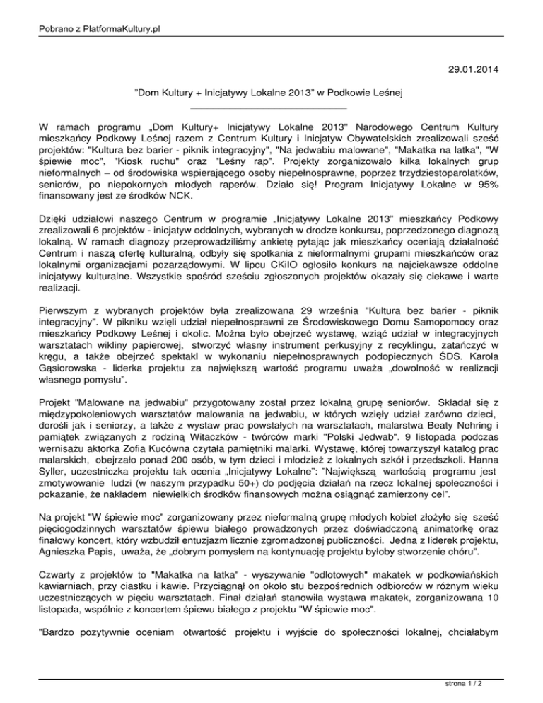 Pobrano z PlatformaKultury.pl 29.01.2014 ”Dom Kultury + Inicjatywy Lokalne 2013” w Podkowie Leśnej ____________________________ W ramach programu „Dom Kultury+ Inicjatywy Lokalne 2013" Narodowego Centrum Kultury mieszkańcy Podkowy Leśnej razem z Centrum Kultury i Inicjatyw Obywatelskich zrealizowali sześć projektów: "Kultura bez barier - piknik integracyjny", "Na jedwabiu malowane", "Makatka na latka", "W śpiewie moc", "Kiosk ruchu" oraz "Leśny rap". Projekty zorganizowało kilka lokalnych grup nieformalnych – od środowiska wspierającego osoby niepełnosprawne, poprzez trzydziestoparolatków, seniorów, po niepokornych młodych raperów. Działo się! Program Inicjatywy Lokalne w 95% finansowany jest ze środków NCK. Dzięki udziałowi naszego Centrum w programie „Inicjatywy Lokalne 2013” mieszkańcy Podkowy zrealizowali 6 projektów - inicjatyw oddolnych, wybranych w drodze konkursu, poprzedzonego diagnozą lokalną. W ramach diagnozy przeprowadziliśmy ankietę pytając jak mieszkańcy oceniają działalność Centrum i naszą ofertę kulturalną, odbyły się spotkania z nieformalnymi grupami mieszkańców oraz lokalnymi organizacjami pozarządowymi. W lipcu CKiIO ogłosiło konkurs na najciekawsze oddolne inicjatywy kulturalne. Wszystkie spośród sześciu zgłoszonych projektów okazały się ciekawe i warte realizacji. Pierwszym z wybranych projektów była zrealizowana 29 września "Kultura bez barier - piknik integracyjny". W pikniku wzięli udział niepełnosprawni ze Środowiskowego Domu Samopomocy oraz mieszkańcy Podkowy Leśnej i okolic. Można było obejrzeć wystawę, wziąć udział w integracyjnych warsztatach wikliny papierowej, stworzyć własny instrument perkusyjny z recyklingu, zatańczyć w kręgu, a także obejrzeć spektakl w wykonaniu niepełnosprawnych podopiecznych ŚDS. Karola Gąsiorowska - liderka projektu za największą wartość programu uważa „dowolność w realizacji własnego pomysłu”. Projekt "Malowane na jedwabiu" przygotowany został przez lokalną grupę seniorów. Składał się z międzypokoleniowych warsztatów malowania na jedwabiu, w których wzięły udział zarówno dzieci, dorośli jak i seniorzy, a także z wystaw prac powstałych na warsztatach, malarstwa Beaty Nehring i pamiątek związanych z rodziną Witaczków - twórców marki "Polski Jedwab". 9 listopada podczas wernisażu aktorka Zofia Kucówna czytała pamiętniki malarki. Wystawę, której towarzyszył katalog prac malarskich, obejrzało ponad 200 osób, w tym dzieci i młodzież z lokalnych szkół i przedszkoli. Hanna Syller, uczestniczka projektu tak ocenia „Inicjatywy Lokalne”: ”Największą wartością programu jest zmotywowanie ludzi (w naszym przypadku 50+) do podjęcia działań na rzecz lokalnej społeczności i pokazanie, że nakładem niewielkich środków finansowych można osiągnąć zamierzony cel”. Na projekt "W śpiewie moc" zorganizowany przez nieformalną grupę młodych kobiet złożyło się sześć pięciogodzinnych warsztatów śpiewu białego prowadzonych przez doświadczoną animatorkę oraz finałowy koncert, który wzbudził entuzjazm licznie zgromadzonej publiczności. Jedna z liderek projektu, Agnieszka Papis, uważa, że „dobrym pomysłem na kontynuację projektu byłoby stworzenie chóru”. Czwarty z projektów to "Makatka na latka" - wyszywanie "odlotowych" makatek w podkowiańskich kawiarniach, przy ciastku i kawie. Przyciągnął on około stu bezpośrednich odbiorców w różnym wieku uczestniczących w pięciu warsztatach. Finał działań stanowiła wystawa makatek, zorganizowana 10 listopada, wspólnie z koncertem śpiewu białego z projektu "W śpiewie moc". "Bardzo pozytywnie oceniam otwartość projektu i wyjście do społeczności lokalnej, chciałabym strona 1 / 2 Pobrano z PlatformaKultury.pl podkreślić ważność pierwszego spotkania informacyjnego, wspólne tworzenie regulaminu i formularza wniosku z wszystkimi zainteresowanymi, demokratyczne podejście do sposobu rozdzielenia środków na poszczególne projekty (…). Jest ogromne zapotrzebowanie społeczności lokalnej na tego typu działania, na spotykanie się i wspólne tworzenie rękodzieła, razem jest ludziom łatwiej sie zorganizować i wytrwać do końca projektu zakończonego wystawą i koncertem, bo w tym wypadku dwa projekty się połączyły i było duże grono odbiorców, co dało nam jako grupie organizującej ogromną satysfakcję” – mówi Anna Zych, liderka projektu „Makatka na latka”, oceniając jednocześnie „zaprzyjaźniony” projekt „W śpiewie moc”. "Kiosk ruchu" to międzypokoleniowy projekt warsztatów teatru ruchu, prowadzonych przez choreografa – psychologa, zakończony spektaklem pt. "Domknięcie", który uczestnicy projektu wystawili 16 listopada. Emilia Drzewicka, inicjatorka projektu, tak ocenia program „Inicjatywy Lokalne” i przeprowadzone w jego ramach działania: ”Za największą wartość uważamy dowolność w wyborze rodzaju aktywności, faktyczną oddolność inicjatyw, (…) jesteśmy naprawdę zadowoleni, że mogliśmy działać w naszym teatrze. CKiIO jest otwarte - to nie urząd w negatywnym tego słowa znaczeniu, ale osoby, którym zależy na tym, żeby się coś fajnego lokalnie działo. Nasze pomysły na kontynuowanie współpracy to nadal teatr ruchu. Udało nam się stworzyć zespół. Chcielibyśmy rozpropagować tę formę terapii”. Również 16 listopada odbył się finał ostatniego z projektów – „Leśnego rapu”. To przedsięwzięcie grupy młodzieży zainteresowanej hip-hopem, która zawiązała się przy okazji realizacji projektu Podkowa Freestyleśna, a następnie poszerzyła o nowych zainteresowanych. Hip-hopowcy przygotowali i nagrali w studiu muzycznym album "Leśny rap", związany tematycznie z lasem i Podkową Leśną. Miks i mastering płyty wykonał artysta muzyk, natomiast grafik - wolontariusz zaprojektował okładkę płyty, która została wydana