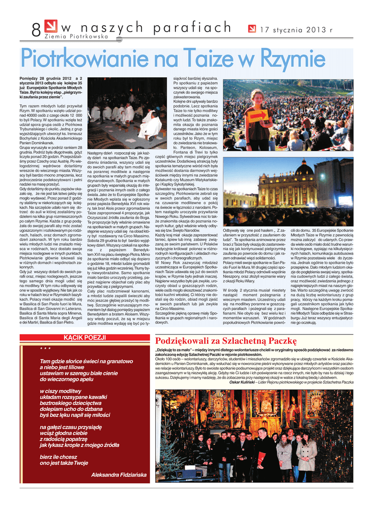 8 w naszych parafiach Ziemia Piotrkowska 17 stycznia 2013 r Piotrkowianie na Taize w Rzymie Pomiędzy 28 grudnia 2012 a 2 stycznia 2013 odbyło się kolejne 35 już Europejskie Spotkanie Młodych Taize. Był to kolejny etap „pielgrzymki zaufania przez ziemie”. Tym razem młodych ludzi przywitał Rzym. W spotkaniu wzięło udział ponad 40000 osób z czego około 12 000 to byli Polacy. W spotkaniu wzięła też udział spora grupa osób z Piotrkowa Trybunalskiego i okolic. Jedną z grup wyjeżdżających utworzył ks. Ireneusz Bochyński z Kościoła Akademickiego Panien Dominikanek. Grupa wyruszyła w podróż rankiem 28 grudnia. Podróż była długotrwała, gdyż liczyła ponad 20 godzin. Przejeżdżaliśmy przez Czechy oraz Austrię. Po wielogodzinnej wędrówce dotarliśmy wreszcie do wiecznego miasta. Wszyscy byli bardzo mocno zmęczenia, lecz jednocześnie podekscytowani i pełni nadziei na masę przeżyć. Gdy dotarliśmy do punktu zapisów okazało się, że nie jest tak łatwo jakby się mogło wydawać. Przez ponad 2 godziny staliśmy w niekończących się kolejkach. Na szczęście udało nam się dotrzeć do auli w której zostaliśmy podzieleni na kilka grup rozmieszczonych po całym Rzymie. Każda z grup podążała do swojej parafii aby móc zostać ugoszczonym i rozlokowanym po rodzinach, halach, oraz domach zgromadzeń zakonach. W tym roku bardzo wielu młodych ludzi nie znalazło miejsca w rodzinach, lecz dostało swoje miejsca noclegowe w innych punktach. Piotrkowianie głównie lokowali się w różnych domach i wspólnotach zakonnych. Gdy już wszyscy dotarli do swoich parafii oraz, miejsc noclegowych, jeszcze tego samego dnia mogli udać się na modlitwy. W tym roku odbywały się one w sposób wyjątkowy. Nie tak jak co roku w halach lecz w Rzymskich bazylikach. Polacy mieli okazje modlić się w Basilica di San Paolo fuori le Mura, Basilica di San Giovanni in Laterano, Basilica di Santa Maria sopra Minerva, Basilica di Santa Maria degli Angeli e dei Martiri, Basilica di San Pietro. Następny dzień rozpoczął się jak każdy dzień na spotkaniach Taize. Po zjedzeniu śniadania, wszyscy udali się do swoich parafii aby tam modlić się na porannej modlitwie a następnie na spotkania w małych grupach międzynarodowych. Spotkania w małych grupach były wspaniałą okazją do integracji i poznania innych osób z całego świata. Jako że to Europejskie Spotkanie Młodych wplata się w ogłoszony przez papieża Benedykta XVI rok wiary, tak brat Alois przeor zgromadzenia Taize zaproponował 4 propozycje, jak Oczyszczać źródła zaufania do Boga. Te propozycje były właśnie omawiane na spotkaniach w małych grupach. Następnie wszyscy udali się na obiad który był rozdawany na Circo Massimo. Sobota 29 grudnia to był bardzo wyjątkowy dzień.Wszyscy czekali na spotkanie z papieżem Benedyktem XVI na placu świętego Piotra.Mimo że spotkanie miało odbyć się dopiero o godzinie 18, młodzi ludzie gromadzili się już kilka godzin wcześniej.Tłumy były niewyobrażalne. Samo spotkanie miało bardzo uroczysty przebieg, papież najpierw objechał cały plac aby przywitać się z pielgrzymami. Cały plac rozbrzmiewał kanonami, a młodzi ludzie zapalili świeczki aby móc jeszcze głębiej przeżyć tę modlitwę. Szczególnie wzruszającym momentem był dialog pomiędzy papieżem Benedyktem a bratem Aloisem. Wszyscy wtedy poczuli, że są w miejscu gdzie modlitwa wydaję się być po ty- KĄCIK POEZJI *** Tam gdzie słońce świeci na granatowo a niebo jest liliowe ustawiam w szeregu białe cienie do wieczornego apelu w ciszy modlitwy układam rozsypane kawałki beztroskiego dziecięctwa dolepiam ucho do dzbana byś bez lęku napił się miłości na gałęzi czasu przysiądę wciąż głodna ciebie z radością popatrzę jak łykasz krople z mojego źródła bierz ile chcesz ono jest także Twoje Aleksandra Fidziańska siąckroć bardziej słyszalna. Po spotkaniu z papieżem wszyscy udali się na spoczynek do swojego miejsca zakwaterowania. Kolejne dni upływały bardzo podobnie. Lecz spotkania Taize to nie tylko modlitwy i możliwość poznania nowych ludzi. To także znakomita okazja do poznania danego miasta które gości uczestników. Jako że w tym roku był to Rzym, miejsc do zwiedzania nie brakowało. Panteon, Koloseum, Fontana di Trevi to tylko część głównych miejsc pielgrzymek uczestników. Dodatkową atrakcją były spotkania tematyczne wśród nich była możliwość dostania darmowych wejściówek między innymi na zwiedzanie Katakumb czy Muzeum Watykańskiego i Kaplicy Sykstyńskiej. Sylwester na spotkaniach Taize to czas szczególny, Piotrkowianie zebrali się w swoich parafiach, aby udać się na czuwanie modlitewne o pokój na świecie w łączności z narodami. Potem nastąpiło uroczyste przywitanie Nowego Roku. Sylwestrowa noc to także znakomita okazja do poznania nowych kultur, gdyż właśnie wtedy odbywa się tzw. Święto Narodów. Każdy kraj miał okazje zaprezentować taniec, śpiew lub inną zabawę związaną ze swoim państwem. U Polaków tradycyjnie królował polonez w różnorodnych konfiguracjach i układach muzycznych i choreograficznych. W Nowy Rok zazwyczaj młodzież uczestnicząca w Europejskich Spotkaniach Taize udawała się już do swoich krajów, w Rzymie było jednak inaczej. Najpierw wszystko było jak zwykle, uroczysty obiad u goszczących rodzin, wiele osób mogło skosztować znakomitości kuchni włoskiej. Ci którzy nie dostali się do rodzin, obiad mogli zjeść w swoich parafiach lub jak zwykle na Circo Massimo. Szczególnie piękną oprawę miały Spotkania w grupach regionalnych i narodowych. Odbywały się one pod hasłem „ Z zaufaniem w przyszłość z zaufaniem do ludzi”. Te spotkania animowane przez braci z Taize były okazją do zastanowienia się jak kontynuować pielgrzymkę zaufania po powrocie do domu i jak razem odnawiać więzi solidarności. Polacy mieli swoje spotkanie w San Paolo Fu