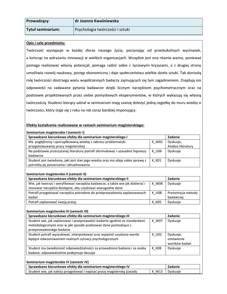 Prowadzący: dr Joanna Kwaśniewska Tytuł seminarium: Psychologia twórczości i sztuki Opis i cele przedmiotu: Twórczość występuje w każdej sferze naszego życia, poczynając od przedszkolnych wycinanek, a kończąc na wdrażaniu innowacji w wielkich organizacjach. Wszędzie jest ona równie ważna, ponieważ pomaga realizować własny potencjał, pomaga radzić sobie z życiowymi kryzysami, a z drugiej strony umożliwia rozwój naukowy, postęp ekonomiczny i daje społeczeństwu wielkie dzieła sztuki. Tak doniosłą rolę twórczości dostrzega wielu współczesnych badaczy zajmujących się tym zagadnieniem. Znajdują oni odpowiedzi na zadawane pytania badawcze dzięki licznym narzędziom psychometrycznym oraz na podstawie projektowanych przez siebie pomysłowych eksperymentów, w których wykazują się własną twórczością. Studenci biorący udział w seminarium mają szansę dołożyć jedną cegiełkę do muru wiedzy o twórczości, który staje się z roku na rok coraz bardziej imponujący. Efekty kształcenia realizowane w ramach seminarium magisterskiego: Seminarium magisterskie I (semestr I) Sprawdzane kierunkowe efekty dla seminarium magisterskiego I Ma pogłębioną i uporządkowaną wiedzę z zakresu problematyki przygotowywanej pracy magisterskiej Na podstawie przeczytanej literatury potrafi sformułować i uzasadnić hipotezy badawcze Student jest świadomy, jaki jest stan jego wiedzy oraz ma zdaje sobie sprawę z potrzeby jej poszerzania i aktualizowania Seminarium magisterskie II (semestr II) Sprawdzane kierunkowe efekty dla seminarium magisterskiego II Wie, jak tworzyć i weryfikować narzędzia badawcze, a także wie jak dobierać i stosować narzędzia dostępne, aby uzyskiwać wiarygodne dane Potrafi przygotować narzędzia potrzebne do przeprowadzenia zaplanowanych badań Potrafi zaplanować swoją pracę. Seminarium magisterskie III (semestr III) Sprawdzane kierunkowe efekty dla seminarium magisterskiego III Student wie, jak zaplanować i przeprowadzić badanie zgodnie ze standardami metodologicznymi oraz w jaki sposób analizować dane pochodzące z przeprowadzonego badania Student potrafi wyszukiwać, interpretować oraz wyjaśnić uzyskane wyniki będące odwzorowaniem realnych sytuacji psychologicznych Student ma świadomość odpowiedzialności za prowadzone badania i za osoby badane, odpowiedzialnie podejmuje decyzje Seminarium magisterskie IV (semestr IV) Sprawdzane kierunkowe efekty dla seminarium magisterskiego IV Student wie, jak należy przygotować i napisać pracę magisterską (zasady K_U06 Zadanie Dyskusje, Analiza literatury Dyskusje K_K01 Dyskusje K_W08 Zadanie Dyskusje K_W02 K_U08 K_K05 Prezentacja metody badawczej Dyskusje K_W07 Zadanie Dyskusje K_U02 K_K08 Dyskusje, omówienie wyników badań Dyskusje K_W13 Zadanie Dyskusje etyczne, formalne i merytoryczne) Student potrafi przeanalizować i zinterpretować uzyskane wyniki, przeprowadzić ich dyskusję zgodnie z obowiązującymi go zasadami etyki i względami formalnymi Potrafi napisać pracę magisterską Świadomie stosuje się do zasad etyki zawodowej i w ich świetle rozpatruje napotykane trudności w realizacji projektu K_U07 K_U12 K_K07 Napisanie i złożenie pracy magisterskiej Dyskusje Tematyka i przykładowe pytania badawcze: Przykładowe zagadnienia badawcze: Twórczość, jako droga wyjścia z kryzysu. Z jakich źródeł czerpią inspirację twórcy dojrzali i początkujący? Jak uprawianie hobbystycznych zajęć twórczych (np. fotografii) wpływa na samoocenę? Jak nagradzać, żeby nie zaszkodzić, czyli rola nagród zewnętrznych w twórczości. Jak fotografowanie zmienia percepcję obiektu? Pasja czy rzemiosło? – rola motywacji wewnętrznej w twórczości. Psychologiczne blokady w procesie twórczym. Czy sesje fotograficzne mogą leczyć? Rola fotografii w budowaniu samooceny. Wymagania wobec uczestników seminarium: Przede wszystkim wymagam od uczestników seminarium zaangażowania na każdym etapie procesu badawczego. Szczególnie mile widziana jest autentyczna ciekawość i głębokie zainteresowanie wybraną przez siebie tematyką badań – tematyka ta nie jest w żaden sposób narzucona, ograniczona jest jednak poprzez zakres merytoryczny społecznej psychologii twórczości. Jako, że duża część proponowanej literatury jest napisana w języku angielskim bardzo istotna podczas seminarium jest znajomość tego języka angielskiego w stopniu umożliwiającym zrozumienie tekstów naukowych. Moje zaangażowanie w projekty studenckie jest bardzo duże – w ramach licznych indywidualnych konsultacji pomagam sformułować tematykę pracy i zaprojektować metodę badawczą, ukierunkowuję studentów w poszukiwaniu odpowiedniej literatury i służę pomocą podczas analizy wyników i ich interpretacji. Studenci uczestniczący w seminarium mogą korzystać z wielu przygotowanych dla nich materiałów. Wstępny harmonogram pracy i warunki zaliczenia: 1. semestr – określenie problematyki badań – kończy się deklaracją każdego uczestnika, jakim tematem się zajmuje, który ze stworzonych projektów będzie realizować i za pomocą, jakiej metody. 2. semestr – ustalenie metody badań i przeprowadzenie badań pilotażowych. Koniecznym warunkiem zaliczenia semestru jest oddanie części teoretycznej pracy. 3. semestr – przeprowadzenie badań, liczenie wyników i ich opisywanie. 4. semestr – pisanie całej pracy magisterskiej, poprawki jej kolejnych wersji. Podstawowa literatura do zajęć: Amabile T.M. (1996). Creativity in context: Update to Social Psychology of Creativity. Boulder, CO: Westview Press. Cameron, J. (2013). Droga artysty. Jak wyzwolić w sobie twórcę? Warszawa: Wydawnictwo Szafa Lehrer, J. (2012). Imagine. How Creativity works? Toronto: Allen Lane Nęcka E. (2001). Psychologia twórczości. Gdańsk: GWP. Sternberg, R. J. (1999). Handbook of Creativity. Cambridge: Cambridge University Press Strzałecki A. (2003). Psychologia twórczości. M