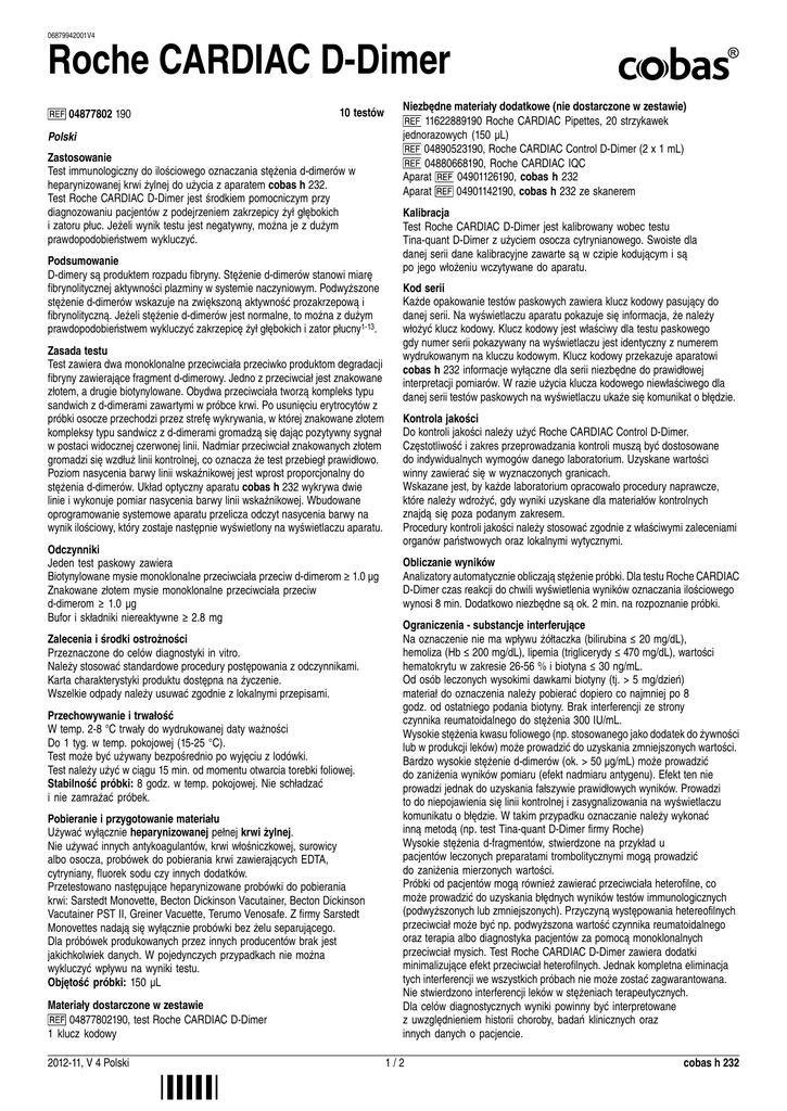 06879942001V4 Roche CARDIAC D-Dimer REF 04877802 190 10 testów Polski Zastosowanie Test immunologiczny do ilościowego oznaczania stężenia d-dimerów w heparynizowanej krwi żylnej do użycia z aparatem cobas h 232. Test Roche CARDIAC D-Dimer jest środkiem pomocniczym przy diagnozowaniu pacjentów z podejrzeniem zakrzepicy żył głębokich i zatoru płuc. Jeżeli wynik testu jest negatywny, można je z dużym prawdopodobieństwem wykluczyć. Podsumowanie D-dimery są produktem rozpadu fibryny. Stężenie d-dimerów stanowi miarę fibrynolitycznej aktywności plazminy w systemie naczyniowym. Podwyższone stężenie d-dimerów wskazuje na zwiększoną aktywność prozakrzepową i fibrynolityczną. Jeżeli stężenie d-dimerów jest normalne, to można z dużym prawdopodobieństwem wykluczyć zakrzepicę żył głębokich i zator płucny1-13. Zasada testu Test zawiera dwa monoklonalne przeciwciała przeciwko produktom degradacji fibryny zawierające fragment d-dimerowy. Jedno z przeciwciał jest znakowane złotem, a drugie biotynylowane. Obydwa przeciwciała tworzą kompleks typu sandwich z d-dimerami zawartymi w próbce krwi. Po usunięciu erytrocytów z próbki osocze przechodzi przez strefę wykrywania, w której znakowane złotem kompleksy typu sandwicz z d-dimerami gromadzą się dając pozytywny sygnał w postaci widocznej czerwonej linii. Nadmiar przeciwciał znakowanych złotem gromadzi się wzdłuż linii kontrolnej, co oznacza że test przebiegł prawidłowo. Poziom nasycenia barwy linii wskaźnikowej jest wprost proporcjonalny do stężenia d-dimerów. Układ optyczny aparatu cobas h 232 wykrywa dwie linie i wykonuje pomiar nasycenia barwy linii wskaźnikowej. Wbudowane oprogramowanie systemowe aparatu przelicza odczyt nasycenia barwy na wynik ilościowy, który zostaje następnie wyświetlony na wyświetlaczu aparatu. Odczynniki Jeden test paskowy zawiera Biotynylowane mysie monoklonalne przeciwciała przeciw d-dimerom ≥ 1.0 μg Znakowane złotem mysie monoklonalne przeciwciała przeciw d-dimerom ≥ 1.0 μg Bufor i składniki niereaktywne ≥ 2.8 mg Zalecenia i środki ostrożności Przeznaczone do celów diagnostyki in vitro. Należy stosować standardowe procedury postępowania z odczynnikami. Karta charakterystyki produktu dostępna na życzenie. Wszelkie odpady należy usuwać zgodnie z lokalnymi przepisami. Przechowywanie i trwałość W temp. 2-8 °C trwały do wydrukowanej daty ważności Do 1 tyg. w temp. pokojowej (15-25 °C). Test może być używany bezpośrednio po wyjęciu z lodówki. Test należy użyć w ciągu 15 min. od momentu otwarcia torebki foliowej. Stabilność próbki: 8 godz. w temp. pokojowej. Nie schładzać i nie zamrażać próbek. Pobieranie i przygotowanie materiału Używać wyłącznie heparynizowanej pełnej krwi żylnej. Nie używać innych antykoagulantów, krwi włośniczkowej, surowicy albo osocza, probówek do pobierania krwi zawierających EDTA, cytryniany, fluorek sodu czy innych dodatków. Przetestowano następujące heparynizowane probówki do pobierania krwi: Sarstedt Monovette, Becton Dickinson Vacutainer, Becton Dickinson Vacutainer PST II, Greiner Vacuette, Terumo Venosafe. Z firmy Sarstedt Monovettes nadają się wyłącznie probówki bez żelu separującego. Dla próbówek produkowanych przez innych producentów brak jest jakichkolwiek danych. W pojedynczych przypadkach nie można wykluczyć wpływu na wyniki testu. Objętość próbki: 150 μL Materiały dostarczone w zestawie REF 04877802190, test Roche CARDIAC D-Dimer 1 klucz kodowy 2012-11, V 4 Polski Niezbędne materiały dodatkowe (nie dostarczone w zestawie) REF 11622889190 Roche CARDIAC Pipettes, 20 strzykawek jednorazowych (150 μL) REF 04890523190, Roche CARDIAC Control D-Dimer (2 x 1 mL) REF 04880668190, Roche CARDIAC IQC Aparat REF 04901126190, cobas h 232 Aparat REF 04901142190, cobas h 232 ze skanerem Kalibracja Test Roche CARDIAC D-Dimer jest kalibrowany wobec testu Tina-quant D-Dimer z użyciem osocza cytrynianowego. Swoiste dla danej serii dane kalibracyjne zawarte są w czipie kodującym i są po jego włożeniu wczytywane do aparatu. Kod serii Każde opakowanie testów paskowych zawiera klucz kodowy pasujący do danej serii. Na wyświetlaczu aparatu pokazuje się informacja, że należy włożyć klucz kodowy. Klucz kodowy jest właściwy dla testu paskowego gdy numer serii pokazywany na wyświetlaczu jest identyczny z numerem wydrukowanym na kluczu kodowym. Klucz kodowy przekazuje aparatowi cobas h 232 informacje wyłączne dla serii niezbędne do prawidłowej interpretacji pomiarów. W razie użycia klucza kodowego niewłaściwego dla danej serii testów paskowych na wyświetlaczu ukaże się komunikat o błędzie. Kontrola jakości Do kontroli jakości należy użyć Roche CARDIAC Control D-Dimer. Częstotliwość i zakres przeprowadzania kontroli muszą być dostosowane do indywidualnych wymogów danego laboratorium. Uzyskane wartości winny zawierać się w wyznaczonych granicach. Wskazane jest, by każde laboratorium opracowało procedury naprawcze, które należy wdrożyć, gdy wyniki uzyskane dla materiałów kontrolnych znajdą się poza podanym zakresem. Procedury kontroli jakości należy stosować zgodnie z właściwymi zaleceniami organów państwowych oraz lokalnymi wytycznymi. Obliczanie wyników Analizatory automatycznie obliczają stężenie próbki. Dla testu Roche CARDIAC D-Dimer czas reakcji do chwili wyświetlenia wyników oznaczania ilościowego wynosi 8 min. Dodatkowo niezbędne są ok. 2 min. na rozpoznanie próbki. Ograniczenia - substancje interferujące Na oznaczenie nie ma wpływu żółtaczka (bilirubina ≤ 20 mg/dL), hemoliza (Hb ≤ 200 mg/dL), lipemia (triglicerydy ≤ 470 mg/dL), wartości hematokrytu w zakresie 26-56 % i biotyna ≤ 30 ng/mL. Od osób leczonych wysokimi dawkami biotyny (tj. > 5 mg/dzień) materiał do oznaczenia należy pobierać dopiero co najmniej po 8 godz. od ostatniego podania biotyny. Brak interfe