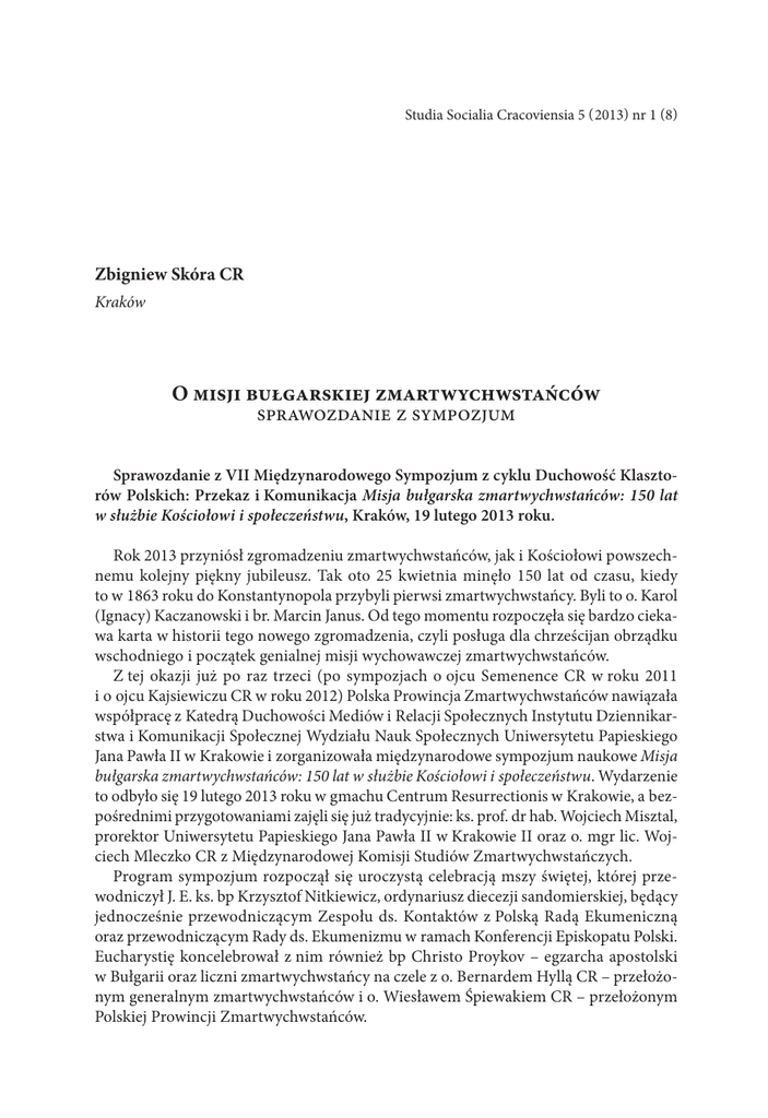 Studia Socialia Cracoviensia 5 ( 2013) nr 1 (8) Zbigniew Skóra CR Kraków O misji bułgarskiej zmartwychwstańców sprawozdanie z sympozjum Sprawozdanie z VII Międzynarodowego Sympozjum z cyklu Duchowość Klasztorów Polskich: Przekaz i Komunikacja Misja bułgarska zmartwychwstańców: 150 lat w służbie Kościołowi i społeczeństwu, Kraków, 19 lutego 2013 roku. Rok 2013 przyniósł zgromadzeniu zmartwychwstańców, jak i Kościołowi powszechnemu kolejny piękny jubileusz. Tak oto 25 kwietnia minęło 150 lat od czasu, kiedy to w 1863 roku do Konstantynopola przybyli pierwsi zmartwychwstańcy. Byli to o. Karol (Ignacy) Kaczanowski i br. Marcin Janus. Od tego momentu rozpoczęła się bardzo ciekawa karta w historii tego nowego zgromadzenia, czyli posługa dla chrześcijan obrządku wschodniego i początek genialnej misji wychowawczej zmartwychwstańców. Z tej okazji już po raz trzeci (po sympozjach o ojcu Semenence CR w roku 2011 i o ojcu Kajsiewiczu CR w roku 2012) Polska Prowincja Zmartwychwstańców nawiązała współpracę z Katedrą Duchowości Mediów i Relacji Społecznych Instytutu Dziennikarstwa i Komunikacji Społecznej Wydziału Nauk Społecznych Uniwersytetu Papieskiego Jana Pawła II w Krakowie i zorganizowała międzynarodowe sympozjum naukowe Misja bułgarska zmartwychwstańców: 150 lat w służbie Kościołowi i społeczeństwu. Wydarzenie to odbyło się 19 lutego 2013 roku w gmachu Centrum Resurrectionis w Krakowie, a bezpośrednimi przygotowaniami zajęli się już tradycyjnie: ks. prof. dr hab. Wojciech Misztal, prorektor Uniwersytetu Papieskiego Jana Pawła II w Krakowie II oraz o. mgr lic. Wojciech Mleczko CR z Międzynarodowej Komisji Studiów Zmartwychwstańczych. Program sympozjum rozpoczął się uroczystą celebracją mszy świętej, której przewodniczył J. E. ks. bp Krzysztof Nitkiewicz, ordynariusz diecezji sandomierskiej, będący jednocześnie przewodniczącym Zespołu ds. Kontaktów z Polską Radą Ekumeniczną oraz przewodniczącym Rady ds. Ekumenizmu w ramach Konferencji Episkopatu Polski. Eucharystię koncelebrował z nim również bp Christo Proykov – egzarcha apostolski w Bułgarii oraz liczni zmartwychwstańcy na czele z o. Bernardem Hyllą CR – przełożonym generalnym zmartwychwstańców i o. Wiesławem Śpiewakiem CR – przełożonym Polskiej Prowincji Zmartwychwstańców. 202 Zbigniew Skóra CR Kolejnym punktem było oficjalne otwarcie sympozjum i przywitanie zgromadzonych prelegentów, jak również słuchaczy, którego dokonał o. prowincjał – Wiesław Śpiewak CR. Wśród uczestników nie zabrakło przedstawicieli z Bułgarii oraz Italii, a prelegenci reprezentowali obrządki liturgiczne wschodni i zachodni oraz uczelnie takie, jak: Uniwersytet Papieski Jana Pawła II w Krakowie, Uniwersytet Jagielloński oraz Politechnika Białostocka. Na cykl sympozjalny złożyły się trzy sesje, którym przewodniczyli kolejno: o. prof. dr hab. Stefan Koperek CR, ks. prof. dr hab. Wojciech Misztal i o. prowincjał Wiesław Śpiewak CR. Całość objęła osiem referatów, dwie dyskusje panelowe, zwiedzanie kaplicy wschodniego obrządku w Centrum Resurrectionis, a zakończenie stanowiły uroczyste nieszpory sprawowane w obrządku wschodnim. Bardzo ciekawe okazały się wystąpienia prelegentów, które wypada pokrótce scharakteryzować. Ks. bp dr Krzysztof Nitkiewicz (Sandomierz) w referacie Bułgarski Kościół „sui iuris”, ukazał rys historyczny drogi bułgarskiego Kościoła prawosławnego do Unii z Rzymem. Dalej nakreślił charakterystykę prawną statusu Kościołów wschodnich, które Kodeks Kanonów Kościołów Wschodnich określa właśnie terminem sui iuris, co oznacza, że rządzą się one własnymi prawami i posiadają swoją autonomię, która jest jednakże odmienna od tej, jaką reprezentują prawosławne autokefalie. Kościoły te są sobie równe w zakresie godności, jednakże – jak to podkreślał – posiadają różne statusy prawne. W dalszej części swojego referatu przedstawił charakterystykę poszczególnych kategorii Kościołów wschodnich, skupiając się głównie na bułgarskim Kościele obrządku bizantyjsko-słowiańskiego. Był to referat niezwykle ciekawy i ubogacający w zakresie prawnym podejmowanej tematyki sympozjum. Korzenie katolickiej społeczności w Bułgarii sięgające Cyryla i Metodego przedstawił w swoim wystąpieniu egzarcha apostolski w Bułgarii bp Christo Proykov (Sofia). Nakreślił on historię wspomnianych świętych Cyryla i Metodego w optyce ich wkładu w tworzenie podwalin kościelnych na terenie ziem bułgarskich. Dalej ukazał znamienną rolę stworzenia i upowszechnienia cyrylicy, która i w obecnej dobie stanowi niezwykłe ubogacenie kultury europejskiej. Bp Proykov wskazywał, iż samo chrześcijaństwo rozpoczęło się w Bułgarii w roku 863, kiedy to ówczesna rodzina panująca (ród Kruma) przyjęła chrzest. W dalszej części swojego wystąpienia biskup bardzo barwnie ukazał dzieje Kościoła bułgarskiego, począwszy od wspomnianego chrztu aż po czasy wejścia do Unii z Kościołem zachodnim. Podkreślił także znacznie późniejsze wydarzenia na płaszczyźnie Wschodu i Zachodu w sferze Kościoła bułgarskiego, aż do czasów nam współczesnych. Ks. prof. dr hab. Wojciech Misztal (Uniwersytet Papieski Jana Pawła II w Krakowie) w swoim wystąpieniu pochylił się już konkretnie nad jednym ze zmartwychwstańców. W referacie Staranie o pomyślną przyszłość: rola duchowości w świetle wybranych kazań o. Łukasza Wronowskiego CR ukazał niektóre mowy i kazania o. Łukasza, wskazując na okoliczności ich powstania – Bułgaria targana rewolucjami i znajdująca się pod wpływem tureckim, ciągle dążąca do pełni wolności. Na tej bazie wskazał, jak kaznodzieja postrzegał historię, że jest to jedna, logiczna ciągłość, ale ciągłość, która domaga się odpowiedzialności i współpracy, zaangażowania ze strony współczesnego cz