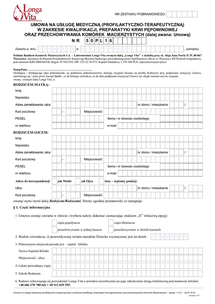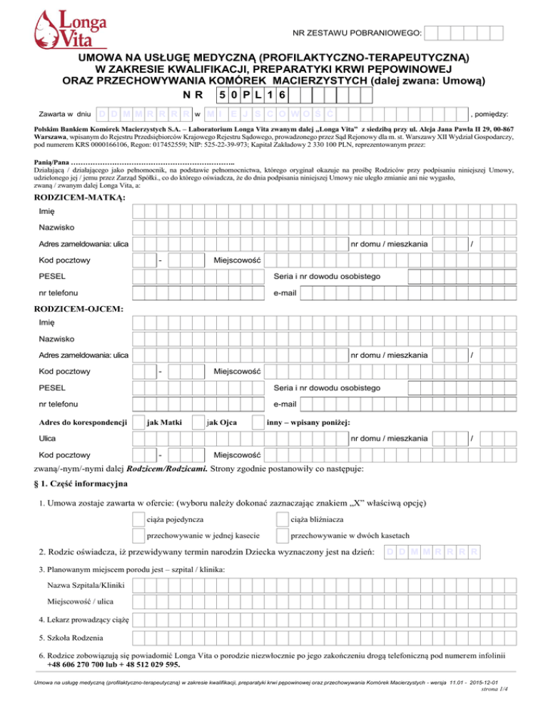 NR ZESTAWU POBRANIOWEGO: UMOWA NA USŁUGĘ MEDYCZNĄ (PROFILAKTYCZNO-TERAPEUTYCZNĄ) W ZAKRESIE KWALIFIKACJI, PREPARATYKI KRWI PĘPOWINOWEJ ORAZ PRZECHOWYWANIA KOMÓREK MACIERZYSTYCH (dalej zwana: Umową) NR 5 0 P L 1 6 Zawarta w dniu D D M M R R R R w M I E J S C O WO Ś Ć , pomiędzy: Polskim Bankiem Komórek Macierzystych S.A. – Laboratorium Longa Vita zwanym dalej „Longa Vita” z siedzibą przy ul. Aleja Jana Pawła II 29, 00-867 Warszawa, wpisanym do Rejestru Przedsiębiorców Krajowego Rejestru Sądowego, prowadzonego przez Sąd Rejonowy dla m. st. Warszawy XII Wydział Gospodarczy, pod numerem KRS 0000166106, Regon: 017452559; NIP: 525-22-39-973; Kapitał Zakładowy 2 330 100 PLN, reprezentowanym przez: Panią/Pana ………………………………………………………….. Działającą / działającego jako pełnomocnik, na podstawie pełnomocnictwa, którego oryginał okazuje na prośbę Rodziców przy podpisaniu niniejszej Umowy, udzielonego jej / jemu przez Zarząd Spółki., co do którego oświadcza, że do dnia podpisania niniejszej Umowy nie uległo zmianie ani nie wygasło, zwaną / zwanym dalej Longa Vita, a: RODZICEM-MATKĄ: Imię Nazwisko Adres zameldowania: ulica Kod pocztowy nr domu / mieszkania - / Miejscowość PESEL Seria i nr dowodu osobistego nr telefonu e-mail RODZICEM-OJCEM: Imię Nazwisko Adres zameldowania: ulica Kod pocztowy nr domu / mieszkania - Miejscowość PESEL Seria i nr dowodu osobistego nr telefonu e-mail Adres do korespondencji jak Matki jak Ojca inny – wpisany poniżej: Ulica Kod pocztowy nr domu / mieszkania - / / Miejscowość zwaną/-nym/-nymi dalej Rodzicem/Rodzicami. Strony zgodnie postanowiły co następuje: § 1. Część informacyjna 1. Umowa zostaje zawarta w ofercie: (wyboru należy dokonać zaznaczając znakiem „X” właściwą opcję) ciąża pojedyncza ciąża bliźniacza przechowywanie w jednej kasecie przechowywanie w dwóch kasetach 2. Rodzic oświadcza, iż przewidywany termin narodzin Dziecka wyznaczony jest na dzień: D D M M R R R R 3. Planowanym miejscem porodu jest – szpital / klinika: Nazwa Szpitala/Kliniki Miejscowość / ulica 4. Lekarz prowadzący ciążę 5. Szkoła Rodzenia 6. Rodzice zobowiązują się powiadomić Longa Vita o porodzie niezwłocznie po jego zakończeniu drogą telefoniczną pod numerem infolinii +48 606 270 700 lub + 48 512 029 595. Umowa na usługę medyczną (profilaktyczno-terapeutyczną) w zakresie kwalifikacji, preparatyki krwi pępowinowej oraz przechowywania Komórek Macierzystych - wersja 11.01 - 2015-12-01 strona 1/4 § 2. Definicje 2. W związku z charakterem niniejszej Umowy, Matka Dziecka upoważnia Ojca Dziecka do odbierania, przeglądania, zapoznawania się z wynikami badań jej krwi obwodowej. 1. Krew Pępowinowa zostanie poddana następującym badaniom: w kierunku ewentualnych zakażeń bakteriami tlenowymi, beztlenowymi, określona zostanie również żywotność i zawartość komórek WBC. Celem tych badań jest kwalifikacja Krwi Pępowinowej oraz wyizolowanej z niej frakcji Komórek Macierzystych. 2. Wyniki wszystkich badań zostaną Rodzicowi przedstawione nie później niż w ciągu 8 tygodni od porodu. 3. W przypadku, kiedy jeden z wyników badań Krwi Pępowinowej w kierunku zakażeń drobnoustrojami będzie dodatni, żywotność komórek WBC będzie poniżej 80% lub gdy z pozyskanej krwi pępowinowej możliwym będzie wyodrębnienie mniej niż 200 mln komórek WBC wówczas Rodzic ma prawo: Określenia użyte w Umowie rozumiane są jako: 1. Dziecko – osoba, dla której pobierana jest jej Krew Pępowinowa. 2. Rodzic – przedstawiciel ustawowy Dziecka zawierający niniejszą Umowę z Longa Vita na rzecz i w imieniu Dziecka. 3. Krew Pępowinowa – krew pępowinowo-łożyskowa pozyskana bezpośrednio po narodzinach Dziecka z odciętej części pępowiny oraz łożyska. 4. Komórki Macierzyste – komórki wyizolowane z Krwi Pępowinowej. § 3. Przedmiot Umowy 1. Na zasadach określonych w Umowie, Rodzic wyraża zgodę na wykonanie usługi medycznej (profilaktyczno-terapeutycznej) polegającej na pozyskaniu i przebadaniu Krwi Pępowinowej, wyizolowaniu z niej i przechowywaniu Komórek Macierzystych, i inne działania związane z nimi, w celu wykorzystania ich w przyszłości do przeszczepów autologicznych lub innych możliwych zastosowań medycznych. 2. Longa Vita zobowiązuje się dołożyć wszelkich starań w celu prawidłowego pozyskania Krwi Pępowinowej, wyizolowania oraz przechowywania otrzymanych z niej Komórek Macierzystych. 3. Rodzice wyrażają ponadto zgodę na powierzenie przez Longa Vita czynności określonych umową z wyjątkiem czynności przechowania osobom trzecim, które zawodowo w zakresie swojej działalności wykonują takie czynności. 4. Longa Vita zapewni wykonanie właściwego transportu zestawu do pozyskania krwi pępowinowej z miejsca pozyskania do miejsca preparatyki. 5. Rodzice oświadczają, że zawierają niniejszą umowę ze względów profilaktyki zdrowotnej i traktują usługi świadczone przez Longa Vita jako profilaktycznoterapeutyczne i stanowiące usługę pomocniczą w stosunku do usługi medycznej ratowania zdrowia lub życia według potrzeb wskazanych przez Rodzica. 6. W przypadku braku pozyskania krwi pępowinowej w terminie 2 miesięcy od daty wskazanej w § 1 ust. 2 Umowa zostaje uznana za niezawartą. § 6. Przedmiot Umowy a) zaniechać przechowywania wyizolowanych Komórek Macierzystych, b) potwierdzić przechowywanie wyizolowanych Komórek Macierzystych, z przyjęciem niepewności co do ich możliwości wykorzystania. 4. W przypadku, gdy zachodzi konieczność poddania matki Dziecka konsultacjom lekarskim w związku z dodatnim lub wątpliwym wynikiem badań wymienionych w § 5 ust. 1, Longa Vita powiadamia Rodziców o tych okolicznościach na piśmie w terminie 14 dni od dnia otrzymania wyników badań. Rodzice zobowiązują się do wykonania badań umożliwiających wykluczenie infekcji, wskazanych przez L