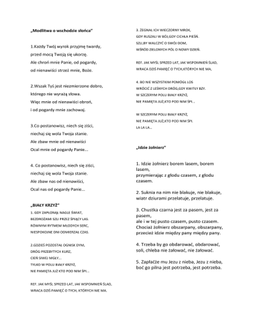 „Modlitwa o wschodzie słońca” 3. ŻEGNAŁ ICH WIECZORNY MROK, GDY RUSZALI W BÓJ,GDY CICHŁA PIEŚŃ. 1.Każdy Twój wyrok przyjmę twardy, SZLI,BY WALCZYĆ O SWÓJ DOM, WŚRÓD ZIELONYCH PÓL O NOWY DZIEŃ. przed mocą Twoją się ukorzę. Ale chroń mnie Panie, od pogardy, REF. JAK MYŚL SPRZED LAT, JAK WSPOMNIEŃ ŚLAD, od nienawiści strzeż mnie, Boże. WRACA DZIŚ PAMIĘĆ O TYCH,KTÓRYCH NIE MA, 4. BO NIE WSZYSTKIM POMÓGŁ LOS 2.Wszak Tyś jest niezmierzone dobro, WRÓCIĆ Z LEŚNYCH DRÓG,GDY KWITŁY BZY. którego nie wyrażą słowa. W SZCZERYM POLU BIAŁY KRZYŻ, Więc mnie od nienawiści obroń, NIE PAMIĘTA JUŻ,KTO POD NIM ŚPI... i od pogardy mnie zachowaj. W SZCZERYM POLU BIAŁY KRZYŻ, NIE PAMIĘTA JUŻ,KTO POD NIM ŚPI. 3.Co postanowisz, niech się ziści, LA LA LA… niechaj się wola Twoja stanie. Ale zbaw mnie od nienawiści Ocal mnie od pogardy Panie... 4. Co postanowisz, niech się ziści, niechaj się wola Twoja stanie. Ale zbaw nas od nienawiści, Ocal nas od pogardy Panie... „Idzie żołnierz” 1. Idzie żołnierz borem lasem, borem lasem, przymierając z głodu czasem, z głodu czasem. 2. Suknia na nim nie blakuje, nie blakuje, wiatr dziurami przelatuje, przelatuje. „BIAŁY KRZYŻ” 1. GDY ZAPŁONĄŁ NAGLE ŚWIAT, BEZDROŻAMI SZLI PRZEZ ŚPIĄCY LAS. RÓWNYM RYTMEM MŁODYCH SERC, NIESPOKOJNE DNI ODMIERZAŁ CZAS. 2.GDZIEŚ POZOSTAŁ OGNISK DYM, DRÓG PRZEBYTYCH KURZ, 3. Chustka czarna jest za pasem, jest za pasem, ale i w tej pusto czasem, pusto czasem. Chociaż żołnierz obszarpany, obszarpany, przecież idzie między pany między pany. 4. Trzeba by go obdarować, obdarować, soli, chleba nie żałować, nie żałować. CIEŃ SIWEJ MGŁY... TYLKO W POLU BIAŁY KRZYŻ, NIE PAMIĘTA JUŻ KTO POD NIM ŚPI... REF. JAK MYŚL SPRZED LAT, JAK WSPOMNIEŃ ŚLAD, WRACA DZIŚ PAMIĘĆ O TYCH, KTÓRYCH NIE MA. 5. Zapłaćże mu Jezu z nieba, Jezu z nieba, boć go pilna jest potrzeba, jest potrzeba. „Taki kraj” 1. Jest takie miejsce u zbiegu dróg, Gdzie się spotyka z zachodem wschód... Nasz pępek świata, nasz biedny raj... Jest takie miejsce, taki kraj. 2. Nad pastwiskami ciągnący dym, Wierzby jak mary w welonach mgły, Tu krzyż przydrożny, tam święty gaj... Jest takie miejsce, taki kraj. 3. Nadziei uczą ci, co na stos potrafią rzucić swój życia los. Za ojców groby, za Trzeci Maj... Jest takie miejsce, taki kraj. 4. Z pokoleń trudu, z ofiarnej krwi Zwycięskiej chwały nadeszły dni. Dopomóż Boże i wytrwać daj! Tu nasze miejsce, to nasz kraj!