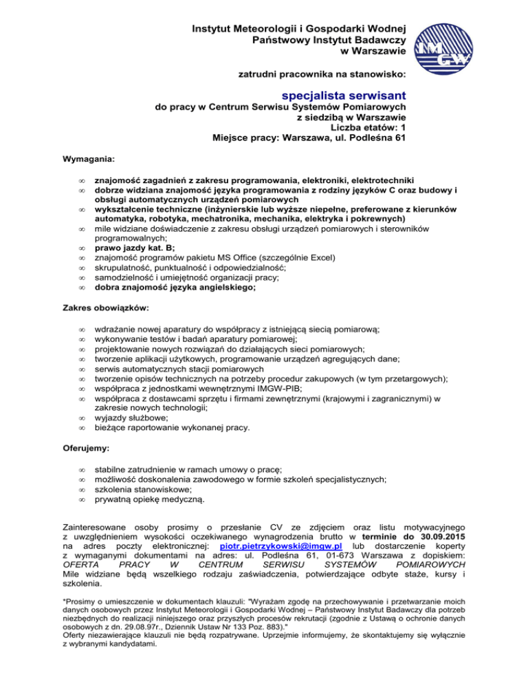 Instytut Meteorologii i Gospodarki Wodnej Państwowy Instytut Badawczy w Warszawie zatrudni pracownika na stanowisko: specjalista serwisant do pracy w Centrum Serwisu Systemów Pomiarowych z siedzibą w Warszawie Liczba etatów: 1 Miejsce pracy: Warszawa, ul. Podleśna 61 Wymagania: • • • • • • • • • znajomość zagadnień z zakresu programowania, elektroniki, elektrotechniki dobrze widziana znajomość języka programowania z rodziny języków C oraz budowy i obsługi automatycznych urządzeń pomiarowych wykształcenie techniczne (inżynierskie lub wyższe niepełne, preferowane z kierunków automatyka, robotyka, mechatronika, mechanika, elektryka i pokrewnych) mile widziane doświadczenie z zakresu obsługi urządzeń pomiarowych i sterowników programowalnych; prawo jazdy kat. B; znajomość programów pakietu MS Office (szczególnie Excel) skrupulatność, punktualność i odpowiedzialność; samodzielność i umiejętność organizacji pracy; dobra znajomość języka angielskiego; Zakres obowiązków: • • • • • • • • • • wdrażanie nowej aparatury do współpracy z istniejącą siecią pomiarową; wykonywanie testów i badań aparatury pomiarowej; projektowanie nowych rozwiązań do działających sieci pomiarowych; tworzenie aplikacji użytkowych, programowanie urządzeń agregujących dane; serwis automatycznych stacji pomiarowych tworzenie opisów technicznych na potrzeby procedur zakupowych (w tym przetargowych); współpraca z jednostkami wewnętrznymi IMGW-PIB; współpraca z dostawcami sprzętu i firmami zewnętrznymi (krajowymi i zagranicznymi) w zakresie nowych technologii; wyjazdy służbowe; bieżące raportowanie wykonanej pracy. Oferujemy: • • • • stabilne zatrudnienie w ramach umowy o pracę; możliwość doskonalenia zawodowego w formie szkoleń specjalistycznych; szkolenia stanowiskowe; prywatną opiekę medyczną. Zainteresowane osoby prosimy o przesłanie CV ze zdjęciem oraz listu motywacyjnego z uwzględnieniem wysokości oczekiwanego wynagrodzenia brutto w terminie do 30.09.2015 na adres poczty elektronicznej: [email protected] lub dostarczenie koperty z wymaganymi dokumentami na adres: ul. Podleśna 61, 01-673 Warszawa z dopiskiem: OFERTA PRACY W CENTRUM SERWISU SYSTEMÓW POMIAROWYCH Mile widziane będą wszelkiego rodzaju zaświadczenia, potwierdzające odbyte staże, kursy i szkolenia. *Prosimy o umieszczenie w dokumentach klauzuli: "Wyrażam zgodę na przechowywanie i przetwarzanie moich danych osobowych przez Instytut Meteorologii i Gospodarki Wodnej – Państwowy Instytut Badawczy dla potrzeb niezbędnych do realizacji niniejszego oraz przyszłych procesów rekrutacji (zgodnie z Ustawą o ochronie danych osobowych z dn. 29.08.97r., Dziennik Ustaw Nr 133 Poz. 883)." Oferty niezawierające klauzuli nie będą rozpatrywane. Uprzejmie informujemy, że skontaktujemy się wyłącznie z wybranymi kandydatami.