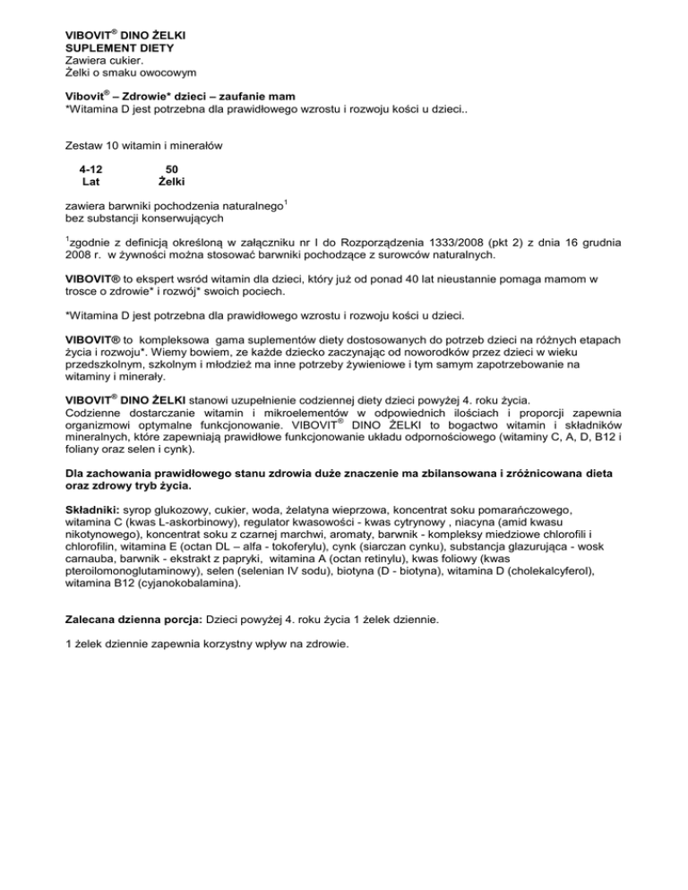 ® VIBOVIT DINO ŻELKI SUPLEMENT DIETY Zawiera cukier. Żelki o smaku owocowym ® Vibovit – Zdrowie* dzieci – zaufanie mam *Witamina D jest potrzebna dla prawidłowego wzrostu i rozwoju kości u dzieci.. Zestaw 10 witamin i minerałów 4-12 Lat 50 Żelki zawiera barwniki pochodzenia naturalnego bez substancji konserwujących 1 1 zgodnie z definicją określoną w załączniku nr I do Rozporządzenia 1333/2008 (pkt 2) z dnia 16 grudnia 2008 r. w żywności można stosować barwniki pochodzące z surowców naturalnych. VIBOVIT® to ekspert wsród witamin dla dzieci, który już od ponad 40 lat nieustannie pomaga mamom w trosce o zdrowie* i rozwój* swoich pociech. *Witamina D jest potrzebna dla prawidłowego wzrostu i rozwoju kości u dzieci. VIBOVIT® to kompleksowa gama suplementów diety dostosowanych do potrzeb dzieci na różnych etapach życia i rozwoju*. Wiemy bowiem, ze każde dziecko zaczynając od noworodków przez dzieci w wieku przedszkolnym, szkolnym i młodzież ma inne potrzeby żywieniowe i tym samym zapotrzebowanie na witaminy i minerały. ® VIBOVIT DINO ŻELKI stanowi uzupełnienie codziennej diety dzieci powyżej 4. roku życia. Codzienne dostarczanie witamin i mikroelementów w odpowiednich ilościach i proporcji zapewnia ® organizmowi optymalne funkcjonowanie. VIBOVIT DINO ŻELKI to bogactwo witamin i składników mineralnych, które zapewniają prawidłowe funkcjonowanie układu odpornościowego (witaminy C, A, D, B12 i foliany oraz selen i cynk). Dla zachowania prawidłowego stanu zdrowia duże znaczenie ma zbilansowana i zróżnicowana dieta oraz zdrowy tryb życia. Składniki: syrop glukozowy, cukier, woda, żelatyna wieprzowa, koncentrat soku pomarańczowego, witamina C (kwas L-askorbinowy), regulator kwasowości - kwas cytrynowy , niacyna (amid kwasu nikotynowego), koncentrat soku z czarnej marchwi, aromaty, barwnik - kompleksy miedziowe chlorofili i chlorofilin, witamina E (octan DL – alfa - tokoferylu), cynk (siarczan cynku), substancja glazurująca - wosk carnauba, barwnik - ekstrakt z papryki, witamina A (octan retinylu), kwas foliowy (kwas pteroilomonoglutaminowy), selen (selenian IV sodu), biotyna (D - biotyna), witamina D (cholekalcyferol), witamina B12 (cyjanokobalamina). Zalecana dzienna porcja: Dzieci powyżej 4. roku życia 1 żelek dziennie. 1 żelek dziennie zapewnia korzystny wpływ na zdrowie. Skład zalecanej dziennej porcji: % RWS** Ogół populacji 50 50 42 50 62,5 Kwas foliowy Selen Biotyna Zawartość w 1 żelku 40,00 mg 8,00 mg 5,00 mg 5,00 mg 500 g 150 g 27,5 g 25 g Witamina D 2,00 g 40 Witamina B12 1,25 g ** Referencyjne Wartości Spożycia 50 Składniki Witamina C Niacyna Witamina E Cynk Witamina A 75 50 50 Witamina C przyczynia się do prawidłowego funkcjonowania układu odpornościowego i nerwowego Witamina B12 przyczynia się do prawidłowego funkcjonowania układu nerwowego Witamina A, Cynk, Foliany przyczynia się do prawidłowego funkcjonowania układu odpornościowego Witamina D przyczynia się do utrzymania prawidłowej budowy kości i zębów Selen- pomaga w prawidłowym funkcjonowaniu tarczycy Najlepiej spożyć przed: data znajduje się na spodzie opakowania. Data jest równocześnie oznaczeniem partii. Przechowywanie: Preparat należy przechowywać w temperaturze 15 – 25°C, w suchym miejscu, w sposób niedostępny dla małych dzieci. Chronić przed bezpośrednim nasłonecznieniem. Ostrzeżenie: Nie należy przekraczać zalecanej porcji do spożycia w ciągu dnia. Suplement diety nie może być stosowany jako substytut zróżnicowanej diety. Nie stosować w przypadku uczulenia na którykolwiek ze składników produktu. Zawartość netto: 225 g (średnio 50 żelków w opakowaniu) Producent: Wyprodukowano przez Zakłady Przemysłu Cukierniczego „Otmuchów” S.A. dla: Teva Operations Poland Sp. z o.o. ul. Emilii Plater 53 00-113 Warszawa www.vibovit.pl Dołącz do nas na Facebooku https://www.facebook.com/VibovitPolska