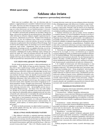 Widok spod wieży Szklane oko świata czyli rozprawa o powszechnej telewizacji Może nam się to podobać, albo i nie, ale telewizja stała się jednym z najpotężniejszych czynników kulturotwórczych końca XX wieku. Wywiera ona także niezaprzeczalny wpływ na duchowe oblicze chrześcijaństwa i to nie tylko tego z nazwy. Zjawiska tego nie wolno lekceważyć ani tym bardziej pomijać w rozważaniach nad postawą chrześcijanina wobec wyzwań współczesności. Wstydliwe przemilczanie problemu nie przybliży nikogo do Boga, a przyczyni się jedynie do utrwalenia pozycji, jaką zdobyła sobie telewizja na obszarze objętym niegdyś rygorystyczną koniecznością „odróżniania się od świata”. Bezpowrotnie minęły już (dobrze to, czy źle, nie wiadomo) czasy, kiedy to za posiadanie odbiornika radiowego (o telewizji nikomu się jeszcze nie śniło) wyłączano ze społeczności zborowej badaczy Pisma Świętego. Stąd też łatwiej dziś podjąć temat, nie narażając się na zarzut ulegania wpływom „tego świata”. Zagadnienie, które stoi przed naszym pokoleniem, nie polega na tym, czy oglądać telewizję, czy też nie. Ujmując problem w taki sposób stalibyśmy się faryzeuszami współczesności, wkładającymi na plecy bliźniego ciężar, którego ten unieść nie zdoła, bo i sami nie jesteśmy przecież tak mocni. Będziemy starali się raczej odpowiedzieć na pytanie: w jaki sposób oglądać telewizję, aby nie skalać sumienia wpływem ludzi, którzy wcale nie powinni być autorytetem dla szczerego chrześcijanina. CZY JEZUS OGLĄDAŁBY TELEWIZJĘ? Na tak śmiało postawione pytanie z całym przekonaniem odpowiadamy – TAK. Byłby do tego po prostu zmuszony. Wchodząc dziś w dom współczesnego celnika, grzesznika, faryzeusza, kapłana albo i niejednego ucznia ewangelicznej wszechnicy, zastałby włączony telewizor i chyba nie zdecydowałby się użyć swej cudownej mocy, aby uciszyć fale eteru opanowane wszechwładnym duchem telewizji. Chyba nie dążyłby do pozrywania gęstej pajęczyny łącz satelitarnych, oplatającej ziemię natłokiem wszędobylskiej informacji. Gdy Jezus znalazł się w domu weselnym, gdzie piło się wino, nie dążył wcale do tego, aby usunąć ze swego otoczenia trunek, który niejedno nieszczęście ściągnął już na rodzinę potomków Noego. Postąpił wręcz przeciwnie. Dał ludziom wino, wiele wina, ale za to najprzedniejszego gatunku. Nie powiedział: Zakazuję wam picia wina – tak postąpiłby pewnie nauczyciel Zakonu Mojżeszowego – ale: Pijcie wino, lecz tylko najlepsze. Wydaje się, że i dziś nie zmieniłby Jezus zasad swego nauczania. Zapewne nie zabraniałby nikomu oglądania telewizji, ale wskazał sposób, jak wykorzystać i to narzędzie dla realizacji jedynego sensownego celu życia człowieka: uwielbienia Boga. Warto może w tym kontekście przytoczyć też odpowiedź, jakiej udzielił brat Russell na pytanie, czy wolno palić cygara. Jego odpowiedź wcale nie była jednoznacznym zaprzeczeniem, ale brzmiała: „Jeżeli sądzisz, że możesz przez to uwielbić Boga, to pal cygara”. W takim też duchu postaramy się odpowiedzieć na pytanie, w jaki sposób oglądać telewizję, aby i przez tę czynność uwielbić Stworzyciela wszechrzeczy. KILKA UWAG OGÓLNIEJSZEJ NATURY 1. Bóg obdarzył człowieka co najmniej pięcioma zmysłami, ale wzrok i słuch są spośród nich najważniejsze, gdyż za ich pośrednictwem do naszego umysłu przedostaje się większość informacji służących do rozumowego poznania świata. Wzrok stawiamy na pierwszym miejscu, gdyż tak uczynił Pan Jezus: „Oko twoje jestci świecą ciała twego” – Mat. 6:22. Obydwa zmysły wyko- rzystuje telewizja i może stać się ona szklanym okiem chrześcijanina, oślepiającym jego ciało fałszywym światłem „tego świata”. 2. Człowiek, także chrześcijanin, potrzebuje rozrywki i kulturalnego wypoczynku. Potrzeby ciała nie kończą się na fizjologii. Rozwój wrażliwości na piękno w każdym z jego przejawów jest niezbędną kwalifikacją chrześcijańskiego życia. 3. Nadmiar informacji jest, jak się wydaje, równie szkodliwy co nadmiar jedzenia czy innych składników naszego życia fizycznego i duchowego. Witaminy są bardzo organizmowi potrzebne. Organizm umie sobie także na ogół poradzić z ich nadmiarem (w przypadku nadużywania witamin w postaci środków farmakologicznych), jednakże wydalanie niepotrzebnych substancji jest procesem trudnym i niezmiernie energochłonnym. Podobnie mózg radzi sobie z nadmiarem informacji, usuwając (zapominając) nieużyteczne. Proces ten pochłania jednak znaczną część możliwości intelektualnych. 4. Telewizja jest najpotężniejszym narzędziem propagandy. Wydawać by się mogło, że wraz z uwolnieniem jej ze szponów systemu totalitarnego stanie się obiektywnym nośnikiem informacji. Nic bardziej błędnego. Telewizja podporządkowana jest obecnie na całym świecie prawom ekonomii. Ten, kto finansuje jej działalność, decyduje o profilu programowym. Reguła ta rządzi zarówno działalnością telewizji publicznych, zależnych od rządów, jak i komercyjnych, uzależnionych od wpływów reklamowych. 5. Ze względu na komercyjne cele telewizji programy w niej pokazywane muszą się podobać jak największej liczbie widzów, najlepiej większości. Tak zatem przeciętny gust i przeciętne zapotrzebowania kształtują treść i formę programów telewizyjnych. Dokąd zaś Szatan i upadli aniołowie są książętami „tego świata”, dotąd większość na ogół nie miewa racji. Z problemem tym bezskutecznie usiłują się uporać twórcy ambitnych kierunków artystycznych, ale wszechwładna komercjalizacja życia dyktuje swoje warunki, doprowadzając do zalewu świata przeciętną „szmirą” i bezwartościowymi, tanimi „bublami”. Dotyczy to zarówno filmu, muzyki, plastyki, jak i produktów przemysłowych, których reklamowanie stało się podstawowym zad