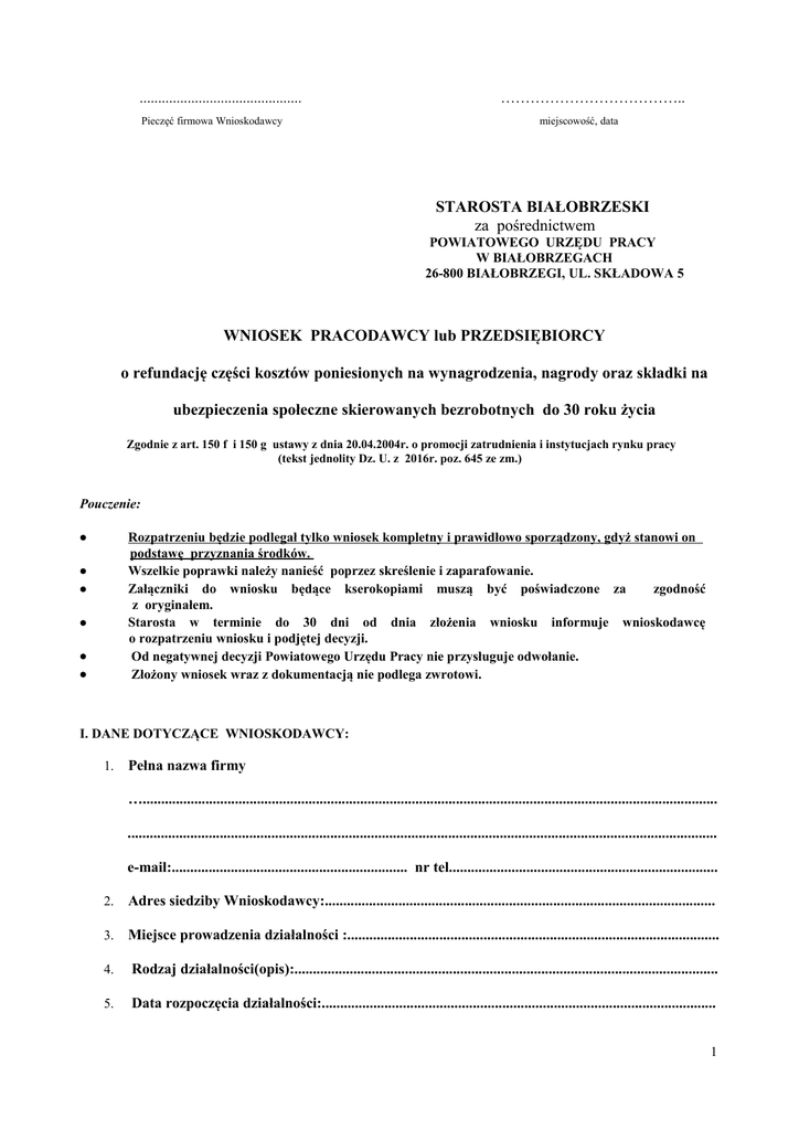 ............................................ Pieczęć firmowa Wnioskodawcy ……………………………….. miejscowość, data STAROSTA BIAŁOBRZESKI za pośrednictwem POWIATOWEGO URZĘDU PRACY W BIAŁOBRZEGACH 26-800 BIAŁOBRZEGI, UL. SKŁADOWA 5 WNIOSEK PRACODAWCY lub PRZEDSIĘBIORCY o refundację części kosztów poniesionych na wynagrodzenia, nagrody oraz składki na ubezpieczenia społeczne skierowanych bezrobotnych do 30 roku życia Zgodnie z art. 150 f i 150 g ustawy z dnia 20.04.2004r. o promocji zatrudnienia i instytucjach rynku pracy (tekst jednolity Dz. U. z 2016r. poz. 645 ze zm.) Pouczenie: Rozpatrzeniu będzie podlegał tylko wniosek kompletny i prawidłowo sporządzony, gdyż stanowi on podstawę przyznania środków. Wszelkie poprawki należy nanieść poprzez skreślenie i zaparafowanie. Załączniki do wniosku będące kserokopiami muszą być poświadczone za zgodność z oryginałem. Starosta w terminie do 30 dni od dnia złożenia wniosku informuje wnioskodawcę o rozpatrzeniu wniosku i podjętej decyzji. Od negatywnej decyzji Powiatowego Urzędu Pracy nie przysługuje odwołanie. Złożony wniosek wraz z dokumentacją nie podlega zwrotowi. I. DANE DOTYCZĄCE WNIOSKODAWCY: 1. Pełna nazwa firmy …............................................................................................................................................................ ................................................................................................................................................................ e-mail:................................................................ nr tel......................................................................... 2. Adres siedziby Wnioskodawcy:.......................................................................................................... 3. Miejsce prowadzenia działalności :..................................................................................................... 4. Rodzaj działalności(opis):................................................................................................................... 5. Data rozpoczęcia działalności:........................................................................................................... 1 6. Klasa i rodzaj działalności wg PKD /Rozporządzenie Rady Ministrów z dnia 24 grudnia 2007r. w sprawie Polskiej Klasyfikacji Działalności(Dz. U. Nr 251, poz.1885 z późn. zm.). …...................................….................................................................................................................. 7. NIP…………………………….............……… REGON………………….……………………. 8. Wysokość stopy procentowej składki na ubezpieczenie wypadkowe (%) : 9. Wielkość podmiotu ubiegającego się o pomoc (znakiem X proszę zaznaczyć wybrany wariant): Mikro1 Mały2 Średni3 …................... Inny4 1 mikroprzedsiębiorstwo to przedsiębiorstwo, które zatrudnia mniej niż 10 pracowników oraz jego roczny obrót nie przekracza 2 mln euro i/lub całkowity bilans roczny nie przekracza 2 mln euro; 2 małe przedsiębiorstwo to przedsiębiorstwo, które zatrudnia mniej niż 50 pracowników oraz jego roczny obrót nie przekracza 10 mln euro i/lub całkowity bilans roczny nie przekracza 10 mln euro; 3 średnie przedsiębiorstwo to przedsiębiorstwo, które zatrudnia mniej niż 250 pracowników oraz jego roczny obrót nie przekracza 50 mln euro i/lub całkowity bilans roczny nie przekracza 43 mln euro; 4 inne- nie mieszczące się w kategoriach wymienionych powyże j. 10. Forma opodatkowania: ................................................... stawka podatkowa.............................% 11. Osoba upoważniona do kontaktu z urzędem (nazwisko imię i stanowisko) …............................................................................................................................................................ 12. Nazwiska i imiona oraz zajmowane stanowiska służbowe osób upoważnionych do podpisywania umowy : ............................................................................................................................................................. ….......................................................................................................................................................... 13. Nawa banku :…….………………………..............................................................…… i numer rachunku bankowego pracodawcy: 14. Stan zatrudnienia w dniu składania wniosku (ilość osób) ….................. 15. Stan zatrudnienia w okresie ostatnich 6 miesięcy: miesiąc / rok Liczba pracowników zatrudnionych w oparciu o umowę o pracę 2 W przypadku zmniejszenia stanu zatrudnienia prosimy o podanie liczby osób z którymi rozwiązano umowę o pracę oraz przyczyny rozwiązania stosunku pracy, dołączając świadectwo pracy zwolnionego pracownika .................................................................................................................................. ............................................................................................................................................................................. ............................................................................................................................................................................. 16. Korzystałem ze środków Funduszu Pracy w okresie 2 poprzedzających lat (TAK/NIE)* , jeżeli TAK proszę uzupełnić poniższą tabelkę: Forma wsparcia Liczba osób skierowanych przez PUP w ramach zawartej umowy 2015r. Liczba osób zatrudnionych po zakończeniu umowy z PUP Liczba osób skierowanych przez PUP w ramach zawartej umowy 2016r. Liczba osób zatrudnionych po zakończeniu umowy z PUP * niewłaściwe skreślić II . DANE DOTYCZĄCE ORGANIZACJI PLANOWANEGO ZATRUDNIENIA dla skierowanego/yc