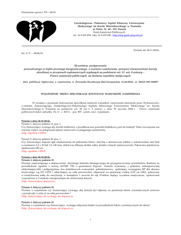 Oznaczenie sprawy: PN – 60/14 _________________________________________________________________________________________________________________ Ginekologiczno – Położniczy Szpital Kliniczny Uniwersytetu Medycznego im. Karola Marcinkowskiego w Poznaniu ul. Polna 33, 60 – 535 Poznań Dział Zamówień Publicznych tel. 61 8 419 294, faks 61 8 419 620, http://dzp.gpsk.ump.edu.pl Poznań, dn. 06.11.2014r. Dz. Z. P. – 60/36/14 Uczestnicy postępowania prowadzonego w trybie przetargu nieograniczonego o wartości zamówienia powyżej równowartości kwoty określonej w przepisach wykonawczych wydanych na podstawie art. 11 ust. 8 ustawy – Prawo zamówień publicznych na dostawę wyrobów medycznych. data publikacji Ogłoszenia o zamówieniu w Dzienniku Urzędowym Unii Europejskiej 15.10.2014r. nr 2014/S 198-349487 WYJAŚNIENIE TREŚCI SPECYFIKACJI ISTOTNYCH WARUNKÓW ZAMÓWIENIA W związku z pytaniami dotyczącymi specyfikacji istotnych warunków zamówienia złożonymi przez Wykonawców, w imieniu Zamawiającego, Ginekologiczno–Położniczego Szpitala Klinicznego Uniwersytetu Medycznego im. Karola Marcinkowskiego w Poznaniu, na podstawie art. 38 ust. 1, 2 ustawy z dnia 29 stycznia 2004 r. - Prawo zamówień publicznych (tekst jednolity Dz. U. z 2013 r. poz. 907 z późn. zm.) wyjaśniam: Pytania z dnia 20.10.2014r. Pytanie 1, dotyczy pakietu 11, poz. 1 Czy Zamawiający wymaga aby kranik trójdrożny z przedłużaczem posiadał dodatkowy port do iniekcji? Takie rozwiązanie ma znaczny wpływ na polepszenie jakości stosowania wymaganego asortymentu. Odp.: Zgodnie z SIWZ. Pytanie 2, dotyczy pakietu 26, poz. 1 Czy Zamawiający dopuści igłę cienkościenną do pobierania leków, sterylną z ołówkowym szlifem z zakończeniem luer-lock w rozmiarze 1,2 x 30 lub 1,2 x40 mm, efektywna filtracja drobin szkła, metalu i innych zanieczyszczeń. Pakowana pojedynczo, opakowania 100 szt. Odp.: zgodnie z SIWZ. Pytania z dnia 20.10.2014r. Pytanie 1, dotyczy pakietu 25 Prosimy zamawiającego o dopuszczenie sterylnego fartucha chirurgicznego do przygotowywania cytostatyków (badania na przenikalność zgodnie z normą ASTMF 739) o gramaturze 81g/cm². Fartuch wykonany z poliestru, mikroporowatej oddychającej folii i polipropylenu, bez dodatkowych wzmocnień pełnobarierowy, spełniający wymagania HP dla obszaru krytycznego wg EN 13795 i oddychający na całej powierzchni, odporność na penetrację wodną ≥170 cm H2O, pakowany w wentylowaną torbę do sterylizacji, w komplecie 1 serweta do rąk 37x69cm, będący wyrobem medycznym, opakowanie wyposażone w 3 etykiety samoprzylepne do archiwizacji danych. Odp.: Zamawiający dopuszcza. Pytanie 2, dotyczy pakietu 25 Prosimy o wyjaśnienie czy Zamawiający wymaga, aby fartuch był odporny na penetracje leków cytostatycznych zarówno z przodu jak i z tyłu, tj. na całej powierzchni ? Odp.: Zamawiający nie wymaga, ale dopuszcza. Pytanie 3, dotyczy pakietu 25 Prosimy o wyjaśnienie czy Zamawiający wymaga załączenia badań na przenikalność leków cytostatycznych do oferty? Odp.: Zamawiający nie wymaga, ale dopuszcza. 1 Oznaczenie sprawy: PN – 60/14 _________________________________________________________________________________________________________________ Pytanie 4, dotyczy pakietu 25 Prosimy o dopuszczenie informacji o przeznaczeniu fartucha do pracy z cytostatykami w postaci załączonego raportu z badań. Odp.: Zamawiający dopuszcza. Pytania z dnia 20.10.2014r. Pytanie 1, dotyczy części 33 Proszę o zgodę na zaoferowanie opatrunków zgodnych z opisem o wymiarach 10 x 25,5cm / 10 x 35cm. Odp.: Zamawiający wyraża zgodę. Pytania z dnia 20.10.2014r. Pytanie 1 Czy do pozycji w których Zamawiający wymaga zaoferowania produktów w określonym zakresie rozmiarów, np.: rurek intubacyjnych 5,0 – 8,0mm, w przypadku oferowania produktów tego samego producenta, oferent może dostarczyć 1szt próbki z dowolnego rozmiaru? Odp.: Zgodnie z SIWZ. Pytania z dnia 23.10.2014r. Pytanie 1, dotyczy części 11 Czy zamawiający wydzieli z części 11 pozycję 1 do oddzielnego pakietu? Odp.: Zgodnie z SIWZ. Pytanie 2, dotyczy części 15 Czy Zamawiający w części 15 dopuści filtr bakteryjny do płynów, noworodkowy, sterylny z membraną 0,2 m, przeznaczony na 96 godz. Zatrzymujący bakterie, grzyby, drożdże, cząstki nieorganiczne i endotoksyny z samoodpowietrzaczem. Liniami wykonanymi z PUR o długości 10 cm przed i 5 cm za filtrem, z dołączonymi na końcach linii różnoimiennymi łącznikami Luer. O małej objętości wypełnienia, do 0,9 ml, przepływie 0,8 ml/min cm2 psi. i powierzchni filtrowania 2,3cm2. Obudowa filtrakodowanie kolorem innym niż filtry do żywienia w celu ich rozróżnienia. Opakowanie typu papier-folia, zawierające informacje o nazwie i numerze katalogowym filtra, dacie przydatności, metodzie sterylizacji, nazwie i adresie producenta nadrukowane bezpośrednio na opakowaniu. Odp.: Zgodnie z SIWZ. Pytanie 3, dotyczy części 22 Czy Zamawiający w części 22 dopuści dwuświatłowy cewnik i.v. Wprowadzany metodą Seldingera wykonany z poliuretanu, prowadnik typu J, widoczny w Rtg, o rozmiarze 7,5 F (średnica zewnętrzna 2,5 mm) i długości 20 cm. Kanały 16G /18G. W skład zestawu dodatkowo wchodzi: skalpel, strzykawka 5ml, zatyczki, dylatator, igła wprowadzająca 70mm, 2 zatyczki do dostrzykiwania, skrzydełko mocujące? Odp.: Zgodnie z SIWZ. Pytanie 4, dotyczy części 28 Czy Zamawiający w części 28 dopuści cewnik do drenażu opłucnej umiejscawiany przez usuwalną wprowadzającą igłę z rękawem ochronnym. W skład zestawu wchodzi: igła 8 G x 77 mm, dren widoczny w rtg 10 Fr , perforowany, o średnicy zewnętrznej 3,3 mm i długości 50 cm, kranik i łącznik do drenu z silikonowym rękawem, dodatkowy stożkowy łącznik do podłączenia ssania? Odp.: Zgodnie z SIWZ. Pytania z dnia 23.10.2014r. Pytanie 1, dotyczy części nr 22 1. Prosimy o dopuszczenie w miejsce przedmiotu zamówienia zestaw do cew