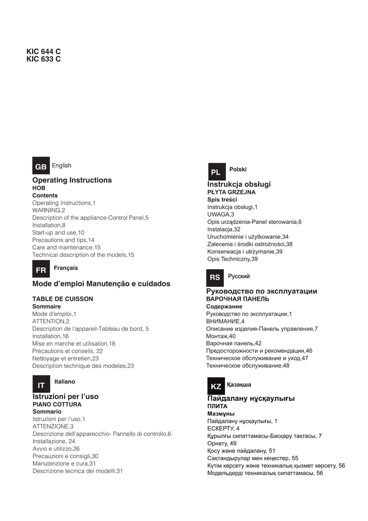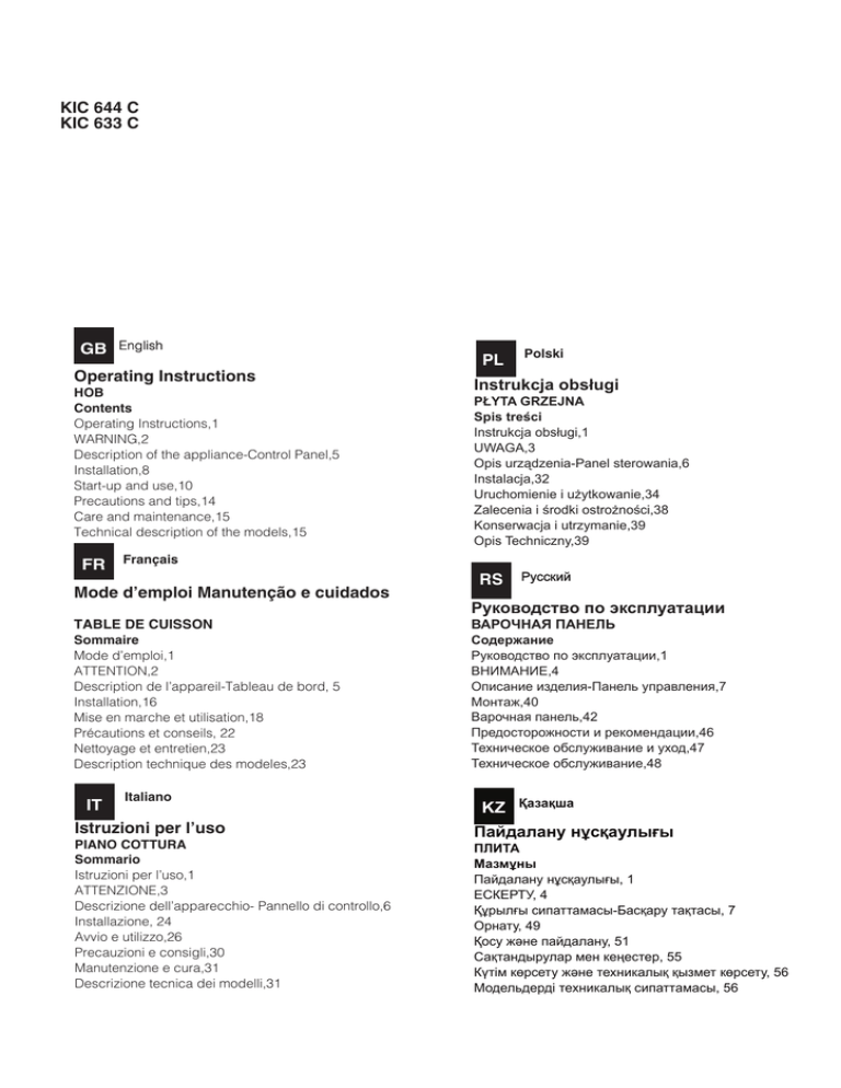 KIC 644 C KIC 633 C GB English PL Operating Instructions HOB Contents Operating Instructions,1 WARNING,2 Description of the appliance-Control Panel,5 Installation,8 Start-up and use,10 Precautions and tips,14 Care and maintenance,15 Technical description of the models,15 FR Polski Instrukcja obsáugi PàYTA GRZEJNA Spis treĞci Instrukcja obsáugi,1 UWAGA,3 Opis urządzenia-Panel sterowania,6 Instalacja,32 Uruchomienie i uĪytkowanie,34 Zalecenia i Ğrodki ostroĪnoĞci,38 Konserwacja i utrzymanie,39 Opis Techniczny,39 Français Mode d’emploi Manutenção e cuidados TABLE DE CUISSON Sommaire Mode d’emploi,1 ATTENTION,2 Description de l’appareil-Tableau de bord, 5 Installation,16 Mise en marche et utilisation,18 Précautions et conseils, 22 Nettoyage et entretien,23 Description technique des modeles,23 Italiano IT Istruzioni per l’uso PIANO COTTURA Sommario Istruzioni per l’uso,1 ATTENZIONE,3 Descrizione dell’apparecchio- Pannello di controllo,6 Installazione, 24 Avvio e utilizzo,26 Precauzioni e consigli,30 Manutenzione e cura,31 Descrizione tecnica dei modelli,31 RS Ɋɭɫɫɤɢɣ Ɋɭɤɨɜɨɞɫɬɜɨ ɩɨ ɷɤɫɩɥɭɚɬɚɰɢɢ ȼȺɊɈɑɇȺə ɉȺɇȿɅɖ ɋɨɞɟɪɠɚɧɢɟ Ɋɭɤɨɜɨɞɫɬɜɨ ɩɨ ɷɤɫɩɥɭɚɬɚɰɢɢ,1 ȼɇɂɆȺɇɂȿ,4 Ɉɩɢɫɚɧɢɟ ɢɡɞɟɥɢɹ-ɉɚɧɟɥɶ ɭɩɪɚɜɥɟɧɢɹ,7 Ɇɨɧɬɚɠ,40 Bɚɪɨɱɧɚɹ ɩɚɧɟɥɶ,42 ɉɪɟɞɨɫɬɨɪɨɠɧɨɫɬɢ ɢ ɪɟɤɨɦɟɧɞɚɰɢɢ,46 Ɍɟɯɧɢɱɟɫɤɨɟ ɨɛɫɥɭɠɢɜɚɧɢɟ ɢ ɭɯɨɞ,47 Ɍɟɯɧɢɱɟɫɤɨɟ ɨɛɫɥɭɠɢɜɚɧɢɟ,48 .= Ԕɚɡɚԕɲɚ ɉɚɣɞɚɥɚɧɭɧԝɫԕɚɭɥɵԑɵ ɉɅɂɌȺ Ɇɚɡɦԝɧɵ ɉɚɣɞɚɥɚɧɭɧԝɫԕɚɭɥɵԑɵ ȿɋɄȿɊɌɍ ԔԝɪɵɥԑɵɫɢɩɚɬɬɚɦɚɫɵȻɚɫԕɚɪɭɬɚԕɬɚɫɵ Ɉɪɧɚɬɭ Ԕɨɫɭɠԥɧɟɩɚɣɞɚɥɚɧɭ ɋɚԕɬɚɧɞɵɪɭɥɚɪɦɟɧɤɟԙɟɫɬɟɪ Ʉԛɬɿɦɤԧɪɫɟɬɭɠԥɧɟɬɟɯɧɢɤɚɥɵԕԕɵɡɦɟɬɤԧɪɫɟɬɭ Ɇɨɞɟɥɶɞɟɪɞɿɬɟɯɧɢɤɚɥɵԕɫɢɩɚɬɬɚɦɚɫɵ IT ATTENZIONE! • ATTENZIONE: Questo apparecchio e le sue parti accessibili diventano molto caldi durante l’uso. • Bisogna fare attenzione ed evitare di toccare gli elementi riscaldanti. • Tenere lontani i bambini inferiori agli 8 anni se non continuamente sorvegliati. • Il presente apparecchio puo’ essere utilizzato dai bambini a partire dagli 8 anni e da persone con ridotte capacita’ fisiche, sensoriali o mentali oppure con mancanza di esperienza e di conoscenza se si trovano sotto adeguata sorveglianza oppure se sono stati istruiti circa l’uso dell’apparecchio in modo sicuro e se si rendono conto dei pericoli correlati. I bambini non devono giocare con l’apparecchio. Le operazioni di pulizia e di manutenzione non devono essere effettuate dai bambini senza sorveglianza. • ATTENZIONE: Lasciare un fornello incustodito con grassi e olii puo’ essere pericoloso e puo’ provocare un incendio. • Non bisogna MAI tentare di spegnere una fiamma/incendio con acqua, bense bisogna spegnere l’apparecchio e coprire la fiamma per esempio con un coperchio o con una coperta ignifuga •ATTENZIONE: Rischio di incendio: non lasciare oggetti sulle superfici di cottura. •ATTENZIONE: Se la superficie vetroceramica e’ incrinata, spegnere l’apparecchio per evitare la possibilit? di scossa elettrica. •Non utilizzare mai pulitori a vapore o ad alta pressione per la pulizia dell’apparecchio. •L’apparecchio non e’ destinato a essere messo in funzione per mezzo di un temporizzatore esterno oppure di un sistema di comando a distanza separato. •Non posare oggetti metallici (coltelli, cucchiai, coperchi, ecc.) sul piano perche’ possono diventare caldi. •Dopo l’uso, spegnere il piano cottura per mezzo del suo dispositivo di comando e non fare affidamento sul rivelatore di pentole. PL UWAGA ! • UWAGA: To urządzenie oraz jego dostĊpne czĊĞci silnie siĊ rozgrzewają podczas uĪytkowania. • NaleĪy uwaĪaü, aby nie dotknąü elementów grzejnych. • Nie pozwalaü, aby dzieci poniĪej 8 roku Īycia zbliĪaáy siĊ do urządzenia, jeĞli nie są pod staáym nadzorem dorosáych. • Z niniejszego urządzenia mogą korzystaü dzieci powyĪej 8 roku Īycia i osoby o ograniczonych zdolnoĞciach Þzycznych, zmysáowych bądĨ umysáowych, jak równieĪ osoby nieposiadające doĞwiadczenia lub znajomoĞci urządzenia, jeĞli znajdują siĊ one pod nadzorem innych osób lub jeĞli zostaáy pouczone na temat bezpiecznego sposobu uĪycia urządzenia oraz zdają sobie sprawĊ ze związanych z nim zagroĪeĔ. Dzieci nie powinny bawiü siĊ urządzeniem. Prace związane z czyszczeniem i konserwacją nie mogą byü wykonywane przez dzieci, jeĞli nie są one nadzorowane. • UWAGA: Pozostawienie bez nadzoru na kuchence táuszczów i olejów moĪe byü niebezpieczne i moĪe spowodowaü poĪar. • Nie naleĪy NIGDY próbowaü ugasiü páomieni/poĪaru wodą; naleĪy wyáączyü urządzenie i przykryü páomieĔ np. pokrywką lub ognioodpornym kocem. • UWAGA: Ryzyko poĪaru: nie pozostawiaü przedmiotów na powierzchniach grzejnych. • UWAGA: JeĪeli powierzchnia ze szkáa ceramicznego jest pĊkniĊta, naleĪy wyáączyü urządzenie, aby uniknąü niebezpieczeĔstwa poraĪenia prądem elektrycznym. •Nie stosowaü nigdy oczyszczaczy parowych lub ciĞnieniowych do czyszczenia urządzenia. • Urządzenie nie jest przeznaczone do wáączania przy uĪyciu zewnĊtrznego przekaĨnika czasowego lub zdalnego systemu sterowania. • Po uĪyciu, naleĪy wyáączyü páytĊ grzejną przy uĪyciu jej sterownika, nie polegając na wykrywaczu obecnoĞci naczyĔ. • Na páycie nie naleĪy káaĞü metalowych przedmiotów (noĪy, áyĪek, pokrywek itp.), poniewaĪ mogą rozgrzaü. 3 13 14 53 1 9 15 10 6 7 Booster 12 2 4 IT Descrizione dell’apparecchio Pannello di controllo Il pannello di controllo che qui viene descritto è rappresentato a fini esemplificativi: può non essere una esatta riproduzio