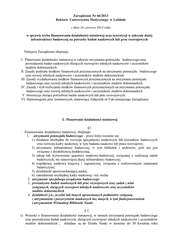 Zarządzenie Nr 66/2013 Rektora Uniwersytetu Medycznego w Lublinie z dnia 24 czerwca 2013 roku w sprawie trybu finansowania działalności statutowej oraz inwestycji w zakresie duŜej infrastruktury badawczej na potrzeby badań naukowych lub prac rozwojowych Niniejsze Zarządzenie obejmuje: I. Planowanie działalności statutowej w zakresie utrzymania potencjału badawczego oraz prowadzeniu badan naukowych słuŜących rozwojowi młodych naukowców i uczestników studiów doktoranckich II. Zasady podziału środków finansowych przeznaczonych na utrzymanie potencjału badawczego oraz rozwój młodych naukowców i uczestników studiów doktoranckich III. Zasady wydatkowania środków finansowych przeznaczonych na utrzymanie potencjału badawczego oraz rozwój młodych naukowców i uczestników studiów doktoranckich IV. Zasady i tryb rozliczania środków finansowych przeznaczonych na utrzymanie potencjału badawczego oraz rozwój młodych naukowców i uczestników studiów doktoranckich V. Inwestycje słuŜące potrzebom badań naukowych lub prac rozwojowych. VI. Harmonogram prac terminowych, stanowiący Załącznik nr 9 do niniejszego Zarządzenia I. Planowanie działalności statutowej §1 . Finansowanie działalności statutowej obejmuje: 1. utrzymanie potencjału badawczego – przez które rozumie się: 1) działania niezbędne do rozwoju specjalności naukowych lub kierunków badawczych oraz rozwoju kadry naukowej, w tym badania naukowe lub prace rozwojowe; 2) utrzymanie infrastruktury badawczej, w tym bibliotek i archiwów, jeśli nie jest związane z działalnością dydaktyczną; 3) zakup lub wytworzenie aparatury naukowo-badawczej, związanej z realizacją zadań badawczych, nie stanowiącej duŜej infrastruktury badawczej; 4) współpracę naukową krajową i zagraniczną, związaną z realizowanymi zadaniami badawczymi; 5) działalność upowszechniającą naukę; 6) zatrudnienie niezbędnej kadry naukowej i inŜ.-techn. 2. utrzymanie specjalnego urządzenia badawczego 3. prowadzenie badań naukowych lub prac rozwojowych oraz zadań z nimi związanych, słuŜących rozwojowi młodych naukowców oraz uczestników studiów doktoranckich 4. działalność j.n., uczelni lub innych uprawnionych podmiotów związaną z utrzymaniem i poszerzeniem naukowych baz danych, w tym funkcjonowaniem i utrzymaniem Wirtualnej Biblioteki Nauki § 2. 1) Wnioski o finansowanie działalności statutowej, w ramach utrzymania potencjału badawczego oraz prowadzeniu badań naukowych, słuŜących rozwojowi młodych naukowców i uczestników studiów doktoranckich , składane są do Działu Nauki w terminie do 30 kwietnia roku poprzedzającego rok finansowania zadania, wg załączników nr 1, 6, 7 do niniejszego Zarządzenia. 2) Wnioski o finansowanie zadań badawczych, w ramach dotacji na prowadzenie badań naukowych przez młodych pracowników nauki oraz uczestników studiów doktoranckich, mogą być składane przez pracowników naukowo-dydaktycznych i naukowo-technicznych, którzy w roku rozpoczęcia badań nie ukończyli 35 roku Ŝycia oraz przez uczestników studiów doktoranckich. § 3. 1. Podstawą przyjęcia do finansowania zadania badawczego jest pozytywna ocena złoŜonego wniosku. 2. Oceny wniosku dokonuje dwóch recenzentów powołanych przez Prorektora ds. Nauki spośród profesorów i doktorów habilitowanych z danej dyscypliny lub dyscyplin pokrewnych będących członkami Komisji Ekspertów przy Senackiej Komisji ds. Badań Naukowych i Wydawnictw lub/i Senackiej Komisji ds. Badań Naukowych i Wydawnictw. 3. Do finansowania, po zaopiniowaniu przez Senacką Komisję ds. Badan Naukowych i Wydawnictw i zatwierdzeniu przez Prorektora ds. Nauki, przyjmowane są wnioski, które uzyskały najwyŜszą punktację, obliczoną jako średnia ocen recenzentów. § 4. Wniosek o finansowanie zadania badawczego ocenia się, uwzględniając następujące kryteria: 1) trafność podjętej problematyki i jej oryginalność, wybór metod i narzędzi badawczych; 2) znaczenie naukowe lub praktyczne wyników zadania badawczego; 3) dorobek naukowy i doświadczenie kierownika zadania badawczego i zespołu wykonawców oraz moŜliwość wykonania zadania badawczego; 4) zasadność planowanych kosztów badań przedstawionych w kosztorysie 1. 2. § 5. Wnioski na zadania badawcze, finansowane w ramach dotacji podmiotowej na utrzymanie potencjału badawczego, mogą być składane przez samodzielnych pracowników nauki oraz przez pracowników niesamodzielnych pełniących obowiązki kierowników jednostek organizacyjnych. Kierownik jednostki organizacyjnej sprawuje kontrolę nad zasadnością i celowością wydatkowania przyznanych środków finansowych na zadania badawcze realizowane w jednostce organizacyjnej. 3. § 6. Wnioski, mające w załoŜeniu badania na ludziach, zwierzętach i organizmach genetycznie modyfikowanych, wymagają dołączenia zgody Komisji Bioetycznej przy UM lub/i I Lokalnej Komisji ds. Doświadczeń na Zwierzętach § 7. 1. 2. Okres realizacji planowanego zadania badawczego nie moŜe być dłuŜszy niŜ 36 miesięcy. Dopuszczalne jest kierowanie jednym zadaniem badawczym. § 8. 1. Lista wniosków przyjętych do finansowania jest przekazywana do ogólnej wiadomości w ramach Wydziału. 2. Prorektor ds. Nauki zawiadamia równieŜ pisemnie wnioskodawcę o wynikach oceny. 2 3. Od uzyskanej oceny przysługuje odwołanie do Prorektora ds. Nauki w terminie 7 dni od daty zawiadomienia. § 9. 1. Wniosek na działalność upowszechniającą naukę składa kierownik jednostki organizacyjnej, w Dziale Nauki, w terminie do 30 kwietnia roku poprzedzającego rok finansowania zadania, według załącznika nr 3 do niniejszego zarządzenia. 2. Wniosek o finansowanie współpracy naukowej krajowej lub zagranicznej, niezbędnej do realizacji zadań, związanych z rozwojem specjalności naukowych lub kierunków badawczych oraz rozwojem kadry naukowej, w tym badania naukowe lub prace rozwojowe ujęte w planie finan