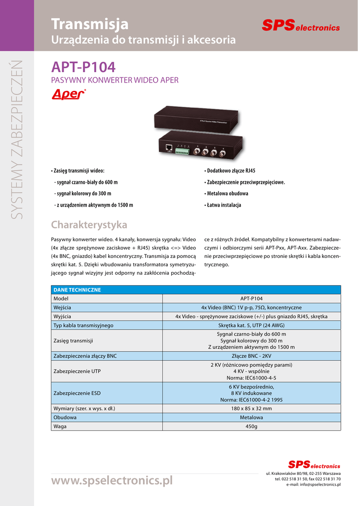 Transmisja SYSTEMY ZABEZPIECZEŃ Urządzenia do transmisji i akcesoria APT-P104 PASYWNY KONWERTER WIDEO APER • Zasięg transmisji wideo: • Dodatkowo złącze RJ45 - sygnał czarno-biały do 600 m • Zabezpieczenie przeciwprzepięciowe. - sygnał kolorowy do 300 m • Metalowa obudowa - z urządzeniem aktywnym do 1500 m • Łatwa instalacja Charakterystyka Pasywny konwerter wideo. 4 kanały, konwersja sygnału: Video ce z różnych źródeł. Kompatybilny z konwerterami nadaw- (4x złącze sprężynowe zaciskowe + RJ45) skrętka <=> Video czymi i odbiorczymi serii APT-Pxx, APT-Axx. Zabezpiecze- (4x BNC, gniazdo) kabel koncentryczny. Transmisja za pomocą nie przeciwprzepięciowe po stronie skrętki i kabla koncen- skrętki kat. 5. Dzięki wbudowaniu transformatora symetryzu- trycznego. jącego sygnał wizyjny jest odporny na zakłócenia pochodząDANE TECHNICZNE Model APT-P104 Wejścia 4x Video (BNC) 1V p-p, 75Ω, koncentryczne Wyjścia 4x Video - sprężynowe zaciskowe (+/-) plus gniazdo RJ45, skrętka Typ kabla transmisyjnego Zasięg transmisji Zabezpieczenia złączy BNC Skrętka kat. 5, UTP (24 AWG) Sygnał czarno-biały do 600 m Sygnał kolorowy do 300 m Z urządzeniem aktywnym do 1500 m Złącze BNC - 2KV Zabezpieczenie UTP 2 KV (różnicowo pomiędzy parami) 4 KV - wspólnie Norma: IEC61000-4-5 Zabezpieczenie ESD 6 KV bezpośrednio, 8 KV indukowane Norma: IEC61000-4-2 1995 Wymiary (szer. x wys. x dł.) Obudowa Waga www.spselectronics.pl 180 x 85 x 32 mm Metalowa 450g ul. Krakowiaków 80/98, 02-255 Warszawa tel. 022 518 31 50, fax 022 518 31 70 e-mail: [email protected]