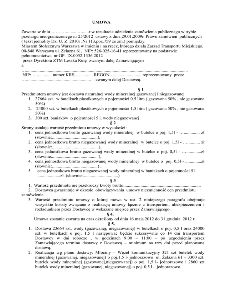UMOWA Zawarta w dniu …… …......... …......r w rezultacie udzielenia zamówienia publicznego w trybie przetargu nieograniczonego nr 25/2012 ustawy z dnia 29.01.2009r. Prawo zamówień publicznych ( tekst jednolity Dz. U. Z 2010r .Nr 113,poz.759 ze zm.) pomiędzy: Miastem Stołecznym Warszawa w imieniu i na rzecz, którego działa Zarząd Transportu Miejskiego, 00-848 Warszawa ul. Żelazna 61, NIP: 526-025-16-41 reprezentowany na podstawie pełnomocnictwa nr GP- IX.0052.1336.2012 przez Dyrektora ZTM Leszka Rutę zwanym dalej Zamawiającym a ….............................................................................................................................................. NIP: …............. numer KRS …........... REGON …....................... reprezentowany przez …......................................................... – zwanym dalej Dostawcą. §1 Przedmiotem umowy jest dostawa naturalnej wody mineralnej gazowanej i niegazowanej 1. 27664 szt. w butelkach plastikowych o pojemności 0.5 litra ( gazowana 50% , nie gazowana 50%) 2. 24000 szt. w butelkach plastikowych o pojemności 1,5 litra ( gazowana 50% , nie gazowana 50%) 3. 300 szt. baniaków o pojemności 5 l. wody niegazowanej §2 Strony ustalają wartość przedmiotu umowy w wysokości: 1. cena jednostkowa brutto gazowanej wody mineralnej w butelce o poj. 1,5l - ….............. zł (słownie:........................................), 2. cena jednostkowa brutto niegazowanej wody mineralnej w butelce o poj. 1,5l - …........... zł (słownie:.........................................), 3. cena jednostkowa brutto gazowanej wody mineralnej w butelce o poj. 0,5l - ….............zł (słownie:....................................... ), 4. cena jednostkowa brutto niegazowanej wody mineralnej w butelce o poj. 0,5l - ..............zł (słownie:........................................) , 5. cena jednostkowa brutto niegazowanej wody mineralnej w baniakach o pojemności 5 l ....................zł. (słownie:...............................) §3 1. Wartość przedmiotu nie przekroczy kwoty brutto:................................................................... 2. Dostawca gwarantuje w okresie obowiązywania umowy niezmienność cen przedmiotu zamówienia. 3. Wartość przedmiotu umowy o której mowa w ust. 2 niniejszego paragrafu obejmuje wszystkie koszty związane z realizacją umowy łącznie z transportem, ubezpieczeniem i rozładunkiem przez Dostawcę w wskazane miejsce przez Zamawiającego. § 4. Umowa zostanie zawarta na czas określony od dnia 16 maja 2012 do 31 grudnia 2012 r § 5. 1. Dostawa 23664 szt. wody (gazowanej, niegazowanej) w butelkach o poj. 0,5 l oraz 24000 szt. w butelkach o poj. 1,5 l następować będzie sukcesywnie co 14 dni transportem Dostawcy w dni robocze , w godzinach 9:00 – 11:00 – po uzgodnieniu przez Zamawiającego terminu dostawy z Dostawcą – minimum na trzy dni przed planowaną dostawą. 2. Realizacja wg planu dostawy: Młociny – Węzeł komunikacyjny 321 szt butelek wody mineralnej (gazowanej, niegazowanej) o poj.1,5 l- jednorazowo ul. Żelazna 61 – 3300 szt. butelek wody mineralnej (gazowanej,niegazowanej) o poj. 1,5 l- jednorazowo i 2860 szt butelek wody mineralnej (gazowanej, niegazowanej) o poj. 0,5 l – jednorazowo. 3. Powyższa dostawa będzie realizowana w okresie od 16 maja 2012 r. do 15 września 2012 r. 4. Dostawa 4000 szt. wody mineralnej (gazowanej, niegazowanej) w butelkach o poj. 0,5 l oraz 300 szt. wody niegazowanej w baniakach o poj. 5 l będzie następować raz w miesiącu transportem Dostawcy w dni robocze po uzgodnieniu przez Zamawiającego z Dostawcą ilości i terminu dostawy – minimum trzy dni przed planowaną dostawą . Miejsce dostawy ul. Żelazna 61. 5. Dostawa wody mineralnej określonej w pkt.4 następować będzie sukcesywnie w terminie od 16 maja 2012 r. do 17 grudnia 2012 r. 6. Zamawiający ma prawo odmówić przyjęcia dostawy, której termin nie był z nim wcześniej uzgodniony. 7. Pierwsza dostawa wody nastąpi w dniu 16 maja 2012r. § 6. W przypadku dostarczenia wody złej jakości lub innej niż mineralna (np. źródlana , stołowa itp.) albo posiadającego inne odstępstwa od obowiązujących norm lub warunków umowy Wykonawca w terminie – 7 dni od daty zawiadomienia przez Zamawiającego – dokona na własny koszt i ryzyko wymiany zareklamowanej partii dostawy na wolną od wad. § 7. Należność za każdą partię dostarczonej wody zgodnie z planem zamówienia § 5 ust. 2 oraz § 5 ust. 4 będzie regulowana przelewem na wskazane przez Dostawcę konto w ciągu 21 dni od otrzymania prawidłowo wystawionych osobnych faktur. W raz ostatnią partią wody zostanie dostarczona faktura VAT. § 8. Zamawiający zastrzega sobie prawo do zmiany wielkości przedmiotu umowy w granicach +/-20% w ogólnej wielkości przedmiotu zamówienia w przypadku wystąpienia: - istotnych zmian organizacyjnych i ekonomicznych, których Zamawiający nie mógł przewidzieć w chwili zawarcia umowy. - warunków pogodowych a w tym temperatury powietrza znacznie odbiegającej w okresie letnim od temperatury właściwej. § 9. W razie uchybienia w terminie dostawy określonej w § 4 i § 5 niniejszej umowy Zamawiający może nałożyć na Dostawcę karę umowną na każdy rozpoczęty dzień opóźnienia dostawy w wysokości 1,0% wartości brutto nierealizowanej dostawy. § 10. Wykonawca oświadcza,że znany jest mu fakt, iż treść niniejszej umowy, a w szczególności dotyczące go dane identyfikujące, przedmiot umowy i wysokość wynagrodzenia, stanowią informację publiczną w rozumieniu art. 1 ust. 1 ustawy z dnia 6 września 2001r o dostępie informacji publicznej Dz. U. Z 2001r. Nr 112 poz. 1198 z późn. zm., która podlega udostępnieniu w trybie przedmiotowej ustawy. § 11. Ewentualne spory na tle realizacji niniejszej umowy rozstrzygane będą przez sąd powszechny właściwy dla siedziby Zamawiającego. § 12. W sprawach nie uregulowanych ni