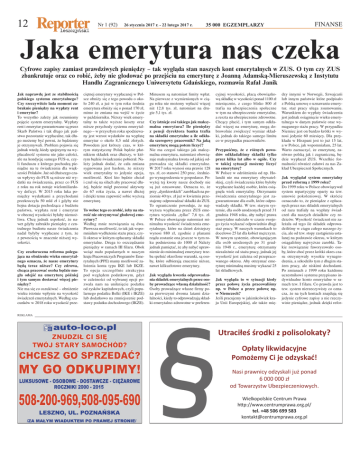 12 Jaka emerytura nas czeka Nr 1 (92) 26 stycznia 2017 r. - 22 lutego 2017 r. FINANSE 35 000 EGZEMPLARZY Cyfrowe zapisy zamiast prawdziwych pieniędzy – tak wygląda stan naszych kont emerytalnych w ZUS. O tym czy ZUS zbankrutuje oraz co robić, żeby nie głodować po przejściu na emeryturę z Joanną Adamską-Mieruszewską z Instytutu Handlu Zagranicznego Uniwersytetu Gdańskiego, rozmawia Rafał Janik Jak naprawdę jest ze stabilnością polskiego systemu emerytalnego? Czy rzeczywiście lada moment zabraknie pieniędzy na wypłaty rent i emerytur? To wszystko zależy jak rozumiemy pojęcie system emerytalny. Wypłaty rent i emerytur gwarantowane są przez Skarb Państwa i tak długo jak państwo pozostanie wypłacalne, tak długo możemy być pewni, że będziemy je otrzymywali. Problem pojawia się jednak wtedy, kiedy spojrzymy na wypłacalność systemu nie jako całości, ale na kondycję samego FUS-u, czyli funduszu z którego pochodzą pieniądze na te świadczenia dla większości Polaków. Już od dłuższego czasu wpływy do FUS są niższe niż wydatki na świadczenia, przez co FUS z roku na rok notuje wielomiliardowy deficyt. W 2015 roku luka pomiędzy wydatkami a przychodami przekroczyła 50 mld zł i gdyby nie hojna dotacja pochodząca z budżetu państwa, wypłata rent i emerytur w obecnej wysokości byłaby niemożliwa. Chcę jednak uspokoić, że nawet gdyby zabrakło pieniędzy z centralnego budżetu nasze świadczenia nadal byłyby wypłacane z tym, że z pewnością w znacznie niższej wysokości. Czy zeszłoroczna reforma polegająca na obniżeniu wieku emerytalnego oznacza, że nasze emerytury będą teraz niższe? Czy zdrowa, chcąca pracować osoba będzie mogła odejść na emeryturę później i tym samym dostawać więcej pieniędzy? Nie ma się co oszukiwać – obniżenie wieku istotnie wpłynie na wysokość świadczeń emerytalnych. Według szacunków w 2018 roku wysokość przeREKLAMA ciętnej emerytury wypłacanej w Polsce obniży się z tego powodu o około 240 zł, a już w tym roku średnia emerytura obniży się o ponad 170 zł, mimo że zmiana ma wejść w życie w październiku. Niższy wiek emerytalny to także wyższe koszty oraz niższe przychody systemu emerytalnego – w przyszłym roku spodziewany jest wzrost wydatków na wypłatę emerytur o około 8,5 mld złotych. Powodem jest krótszy czas, w którym statystyczny Polak będzie płatnikiem składek oraz dłuższy, w którym będzie świadczenie pobierał. Należy jednak dodać, że cała zmiana sygnowana jest hasłem, że niższy wiek emerytalny to jedynie opcja, możliwość. Ktoś kto będzie chciał i czuł się na siłach aby pracować dłużej, będzie mógł pozostać aktywny do 67 roku życia, a nawet dłużej i dzięki temu zapewnić sobie wyższą emeryturę. To wobec tego co zrobić, żeby na starość nie otrzymywać głodowej emerytury? Według mnie rozwiązania są dwa. Pierwsza możliwość, to tak jak wspomniałam wydłużenie stażu pracy, czyli okresu w którym opłacamy składki emerytalne. Druga to oszczędzanie pieniędzy w ramach III filaru. Obok wciąż mało popularnych w naszym kraju Pracowniczych Programów Emerytalnych (PPE) mamy możliwość założenia konta typu IKE lub IKZE. To opcja szcze gól nie atrakcyj na pod względem podatkowym, gdyż w zależności od wybranej opcji pozwala nam na uniknięcie podatku od zysków kapitałowych, czyli popularnego podatku Belki (IKE i IKZE) lub dodatkowo na zmniejszenie podstawy podatku dochodowego (IKZE). Minusem są natomiast limity wpłat. Na pierwsze z wymienionych w ciągu roku nie możemy wpłacić więcej niż 12,8 tys. zł, natomiast na drugie 5,1 tys. zł. Czy istnieje coś takiego jak maksymalna emerytura? Ile pieniędzy z pensji dyrektora banku trafia na składki emerytalne a ile odkłada szeregowy pracownik? Na jaką emeryturę mogą potem liczyć? Nie ma czegoś takiego jak maksymalna emerytura, natomiast obowiązuje maksymalna kwota od jakiej odprowa dza się skład ki eme ry tal ne. W 2017 roku wynosi ona prawie 128 tys. zł, co stanowi 250 proc. średniego wynagrodzenia w gospodarce. Powyżej tej kwoty nasze dochody nie są już ozusowane. Oznacza to, że przy „dyrektorskich” zarobkach na poziomie 40 tys. zł już w kwietniu przestajemy odprowadzać składki do ZUS. To ograniczenie powoduje, że najwyższa wypłacana przez ZUS emerytura wyniosła „tylko” 7,6 tys. zł. W Polsce obowiązuje natomiast minimalna wysokość świadczenia emerytalnego, które na dzień dzisiejszy wynosi 880 zł, zgodnie z planami rządu zostanie ona jeszcze w tym roku podniesiona do 1000 zł Należy jednak pamiętać, że aby nabyć uprawnienie do minimalnej emerytury trzeba spełnić określone warunki, są osoby, które odbierają znacznie niższe, nawet kilkuzłotowe emerytury. Jak wygląda kwestia odprowadzania składek emerytalnych przez osoby prowadzące własną działalność? Osoby prowadzące własne firmy poza pierwszymi dwoma latami działalności, kiedy to odprowadzają składki emerytalno-zdrowotne w preferen- cyjnej wysokości, płacą obowiązkową składkę w wysokości ponad 1100 zł miesięcznie, z czego blisko 800 zł trafia na ubezpieczenia społeczne w tym na ubezpieczenie emerytalne, a reszta na ubezpieczenie zdrowotne. Chcący płacić, i tym samym odkładać więcej na emeryturę, mogą dobrowolnie zwiększyć wymiar składki, jednak do takiego samego limitu co w przypadku pracowników. Przypuśćmy, że z różnych powodów odkładaliśmy składki tylko przez kilka lat albo w ogóle. Czy w takiej sytuacji możemy liczyć na emeryturę? W Polsce w odróżnieniu od np. Holandii nie ma emerytury obywatelskiej, czyli świadczenia które byłoby wypłacane każdej osobie, która osiągnęła wiek emerytalny. Otrzymanie świadczenia emerytalnego jest zagwarantowane dla osób, które odprowadzały składki. W tzw. starym systemie, dla osób urodzonych przed 31 grudnia 1948 roku, aby nabyć prawa emery