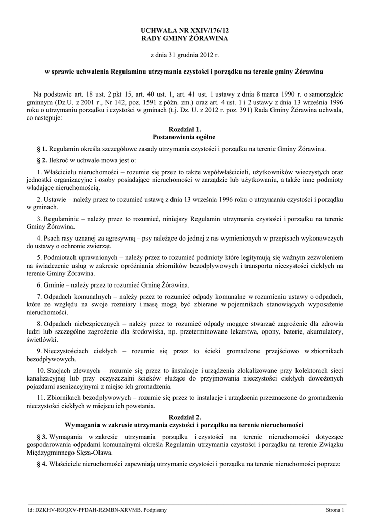 UCHWAŁA NR XXIV/176/12 RADY GMINY ŻÓRAWINA z dnia 31 grudnia 2012 r. w sprawie uchwalenia Regulaminu utrzymania czystości i porządku na terenie gminy Żórawina Na podstawie art. 18 ust. 2 pkt 15, art. 40 ust. 1, art. 41 ust. 1 ustawy z dnia 8 marca 1990 r. o samorządzie gminnym (Dz.U. z 2001 r., Nr 142, poz. 1591 z późn. zm.) oraz art. 4 ust. 1 i 2 ustawy z dnia 13 września 1996 roku o utrzymaniu porządku i czystości w gminach (t.j. Dz. U. z 2012 r. poz. 391) Rada Gminy Żórawina uchwala, co następuje: Rozdział 1. Postanowienia ogólne § 1. Regulamin określa szczegółowe zasady utrzymania czystości i porządku na terenie Gminy Żórawina. § 2. Ilekroć w uchwale mowa jest o: 1. Właścicielu nieruchomości – rozumie się przez to także współwłaścicieli, użytkowników wieczystych oraz jednostki organizacyjne i osoby posiadające nieruchomości w zarządzie lub użytkowaniu, a także inne podmioty władające nieruchomością. 2. Ustawie – należy przez to rozumieć ustawę z dnia 13 września 1996 roku o utrzymaniu czystości i porządku w gminach. 3. Regulaminie – należy przez to rozumieć, niniejszy Regulamin utrzymania czystości i porządku na terenie Gminy Żórawina. 4. Psach rasy uznanej za agresywną – psy należące do jednej z ras wymienionych w przepisach wykonawczych do ustawy o ochronie zwierząt. 5. Podmiotach uprawnionych – należy przez to rozumieć podmioty które legitymują się ważnym zezwoleniem na świadczenie usług w zakresie opróżniania zbiorników bezodpływowych i transportu nieczystości ciekłych na terenie Gminy Żórawina. 6. Gminie – należy przez to rozumieć Gminę Żórawina. 7. Odpadach komunalnych – należy przez to rozumieć odpady komunalne w rozumieniu ustawy o odpadach, które ze względu na swoje rozmiary i masę mogą być zbierane w pojemnikach stanowiących wyposażenie nieruchomości. 8. Odpadach niebezpiecznych – należy przez to rozumieć odpady mogące stwarzać zagrożenie dla zdrowia ludzi lub szczególne zagrożenie dla środowiska, np. przeterminowane lekarstwa, opony, baterie, akumulatory, świetlówki. 9. Nieczystościach ciekłych – rozumie się przez to ścieki gromadzone przejściowo w zbiornikach bezodpływowych. 10. Stacjach zlewnych – rozumie się przez to instalacje i urządzenia zlokalizowane przy kolektorach sieci kanalizacyjnej lub przy oczyszczalni ścieków służące do przyjmowania nieczystości ciekłych dowożonych pojazdami asenizacyjnymi z miejsc ich gromadzenia. 11. Zbiornikach bezodpływowych – rozumie się przez to instalacje i urządzenia przeznaczone do gromadzenia nieczystości ciekłych w miejscu ich powstania. Rozdział 2. Wymagania w zakresie utrzymania czystości i porządku na terenie nieruchomości § 3. Wymagania w zakresie utrzymania porządku i czystości na terenie nieruchomości dotyczące gospodarowania odpadami komunalnymi określa Regulamin utrzymania czystości i porządku na terenie Związku Międzygminnego Ślęza-Oława. § 4. Właściciele nieruchomości zapewniają utrzymanie czystości i porządku na terenie nieruchomości poprzez: ————————————————————————————————————————————————————————— Id: DZKHV-ROQXV-PFDAH-RZMBN-XRVMB. Podpisany Strona 1 1. Odprowadzanie nieczystości ciekłych do kanalizacji sanitarnej lub jeżeli brak jest technicznej lub ekonomicznej możliwości, do szczelnego zbiornika bezodpływowego lub do przydomowej oczyszczalni ścieków bytowych. 2. Obowiązek utrzymania czystości i porządku w odniesieniu do dróg należy do zarządcy danej drogi. 3. Właściciele nieruchomości zobowiązani są do utrzymania czystości i porządku w częściach nieruchomości służących do użytku publicznego, poprzez: 1) gromadzenie uprzątniętych z chodników położonych wzdłuż nieruchomości błota, śniegu i lodu, na skraju chodnika od strony jezdni, z zachowaniem możliwości odpływu wody do kanalizacji w sposób niezagrażający istniejącej zieleni, 2) usunięcie z miejsc zagrażających bezpieczeństwu ruchu pojazdów i pieszych uprzątniętego błota, śniegu i lodu z chodników położonych wzdłuż nieruchomości, z dróg publicznych, z przystanków komunikacyjnych, 3) usunięcie sopli lodowych i nawisów śniegu z dachów i gzymsów budynku niezwłocznie po ich pojawieniu się, 4) niezwłoczne usuwanie odpadów powstałych w wyniku remontu i modernizacji lokali (np. gruzu itp.), 5) utrzymanie w należytym stanie sanitarnym, porządkowym i technicznym placów zabaw, dokonywanie wymiany piasku w piaskownicach dla dzieci z częstotliwością co najmniej 1 raz w roku, a w razie potrzeby częściej, 6) umieszczenie informacji o warunkach prowadzenia handlu przez zarządców targowisk i giełd. § 5. Na terenie gminy zabrania się: 1. wykorzystywania nieczynnych studni przydomowych do gromadzenia nieczystości ciekłych, 2. mycia pojazdów samochodowych jeżeli brak jest możliwości odprowadzenia ścieków do kanalizacji lub zbiorników bezodpływowych, 3. naprawy pojazdów samochodowych poza warsztatami samochodowymi mogą odbywać się na terenie nieruchomości pod warunkiem, że nie są uciążliwe dla sąsiednich nieruchomości i ich mieszkańców, a powstające odpady będą gromadzone w sposób umożliwiający ich usunięcie zgodnie z przepisami ustawy o odpadach, 4. składowania odpadów w miejscach do tego nieprzeznaczonych,zgodnie z ustawą z dnia 27 kwietnia 2001r. prawo ochrony środowiska (Dz.U. z 2008r., nr 25 poz.150 z póżn. zm). § 6. 1. Na terenie nieruchomości zabrania się spalania odpadów takich jak: tworzywa sztuczne, guma, odzież oraz innych odpadów komunalnych, poza odpadami dopuszczonymi do spalania w domowych instalacjach i urządzeniach centralnego ogrzewania, kuchniach i piecach. Do odpadów dopuszczonych do spalania należą: trociny, wióry, ścinki, drewno, korek i kora oraz pap
