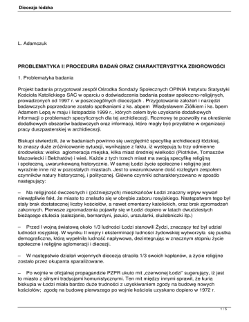 Diecezja łódzka L. Adamczuk PROBLEMATYKA I PROCEDURA BADAŃ ORAZ CHARAKTERYSTYKA ZBIOROWOŚCI 1. Problematyka badania Projekt badania przygotował zespół Ośrodka Sondaży Społecznych OPINIA Instytutu Statystyki Kościoła Katolickiego SAC w oparciu o doświadczenia badania postaw społeczno-religijnych, prowadzonych od 1997 r. w poszczególnych diecezjach . Przygotowanie założeń i narzędzi badawczych poprzedzone zostało spotkaniami z ks. abpem Władysławem Ziółkiem i ks. bpem Adamem Lepą w maju i listopadzie 1999 r., których celem było uzyskanie dodatkowych informacji o problemach specyficznych dla tej archidiecezji. Rozmowy te pozwoliły na określenie dodatkowych obszarów badawczych oraz informacji, które mogły być przydatne w organizacji pracy duszpasterskiej w archidiecezji. Biskupi stwierdzili, że w badaniach powinno się uwzględnić specyfikę archidiecezji łódzkiej, to znaczy duże zróżnicowanie sytuacji, wynikające z faktu, iż występują tu trzy odmienne środowiska: wielka aglomeracja miejska, kilka miast średniej wielkości (Piotrków, Tomaszów Mazowiecki i Bełchatów) i wieś. Każde z tych trzech miast ma swoją specyfikę religijną i społeczną, uwarunkowaną historycznie. W samej Łodzi życie społeczne i religijne jest wyraźnie inne niż w pozostałych miastach. Jest to uwarunkowane dość rozległym zespołem czynników natury historycznej, i politycznej. Główne czynniki scharakteryzowano w sposób następujący: – Na religijność ówczesnych i (późniejszych) mieszkańców Łodzi znaczny wpływ wywarł niewątpliwie fakt, że miasto to znalazło się w obrębie zaboru rosyjskiego. Następstwem tego był stały brak dostatecznej liczby kościołów, a nawet cmentarzy katolickich, oraz brak zgromadzeń zakonnych. Pierwsze zgromadzenia pojawiły się w Łodzi dopiero w latach dwudziestych bieżącego stulecia (salezjanie, bernardyni, jezuici, urszulanki, służebniczki itp.) – Przed I wojną światową około 1/3 ludności Łodzi stanowili Żydzi, znaczący też był udział ludności rosyjskiej. W wyniku II wojny i eksterminacji ludności żydowskiej wytworzyła się pustka demograficzna, którą wypełniła ludność napływowa, dezintegrując w znacznym stopniu życie społeczne i religijne aglomeracji i diecezji. – W następstwie działań wojennych diecezja straciła 1/3 swoich kapłanów, a życie religijne zostało przez okupanta sparaliżowane. – Po wojnie w oficjalnej propagandzie PZPR ukuto mit „czerwonej Łodzi” sugerujący, iż jest to miasto z silnymi tradycjami komunistycznymi. Ten mit między innymi sprawił, że kuria biskupia w Łodzi miała bardzo duże trudności z uzyskiwaniem zgody na budowę nowych kościołów; zgodę na budowę pierwszego po wojnie kościoła uzyskano dopiero w 1972 r. 1/5 Diecezja łódzka W Łodzi zamknięto też wszystkie szkoły i redakcje pism katolickich. – Znaczny wpływ na rodzinę, a zwłaszcza na jej działalność wychowawczą, wywiera rodzaj pracy matki. Do roku 1990 Łódź była największym w Europie środkowej i wschodniej skupiskiem kobiet pracujących w nocy (na trzy zmiany). Gdy łódzki przemysł włókienniczy stracił rynek zbytu na Wschodzie (głównie w ZSRR), dziesiątki tysięcy kobiet w Łodzi pozbawionych zostało pracy. Zwiększa się liczba matek samotnie wychowujących dzieci. Stanowią one 20% wszystkich rodzin w archidiecezji. – Oprócz patologii, które są typowe dla wielkich aglomeracji, w Łodzi występuje dość wysoki procent ludzi nadużywających alkoholu oraz znaczna liczba małżeństw rozwiedzionych. Te zjawiska można wiązać z takimi faktami, jak trudne warunki mieszkaniowe, praca matki poza domem, niskie płace, bezrobocie itp. Od wielu lat odnotowuje się w mieście spadek przyrostu naturalnego ludności. – Z pozytywnych czynników, wpływających na życie w mieszkańców aglomeracji łódzkiej, które trzeba podkreślić, należy tolerancja religijna. W zgodzie żyli tu ze sobą nie tylko przedstawiciele trzech wyznań chrześcijańskich (katolicy, protestanci i prawosławni), lecz również chrześcijanie i żydzi. Przejawem tych postaw był fakt, że po odzyskaniu niepodległości w 1918 r. nie zburzono w Łodzi żadnej cerkwi (a tak było w wielu miastach w Polsce, m. in. w Warszawie). – Jedną z bardzo wyraźnych cech religijności mieszkańców w aglomeracji łódzkiej jest ich maryjność. Uroczystości i święta ku czci Matki Bożej obchodzone są z wyjątkową frekwencją. W samej Łodzi aż 17 parafii dedykowanych jest Matce Najświętszej. Przez długie lata wierni z archidiecezji łódzkiej zajmowali pierwsze miejsce wśród pielgrzymów nawiedzających sanktuarium na Jasnej Górze. – Na specjalną mentalność lodzermenscha, kształtowaną przez dziesięciolecia wieku XIX i XX, wpłynął nadmiemy kult dwóch wartości: pracy i pieniądza. Powodowało to stosunkowo małą wrażliwość na historię narodową i związaną z nią kulturę i sztukę. Było to zrozumiałe w wielkim „łódzkim tyglu”, w którym czynnikiem najważniejszym była rosnąca stale gorączka Ziemi Obiecanej. To również formowało hierarchię wartości mieszkańców miasta – w przeszłości i w czasach najnowszych. Stałą troską biskupów archidiecezji jest młodzież szkolna i akademicka: katecheci stwierdzają, iż jest ona wyraźnie trudniejsza do wdrożenia w aktywne życie religijne niż w innych rejonach archidiecezji. W tej sytuacji oprócz badania postaw społeczno-religijnych diecezjan, potrzebne jest bardziej szczegółowe rozpoznania postaw, poglądów i wartości istniejących wśród młodzieży łódzkiej. Biskupi stwierdzili, iż potrzebne są badania socjologiczne, które powinny przynieść odpowiedzi na pytania: „Jaka jest dusza młodych? Jakie są oczekiwania dorosłych i młodych na nowe tysiąclecie? Czym żyją diecezjanie dziś i czym chcieliby żyć jutro – w najbliższej przyszłości?” W wyniku ty
