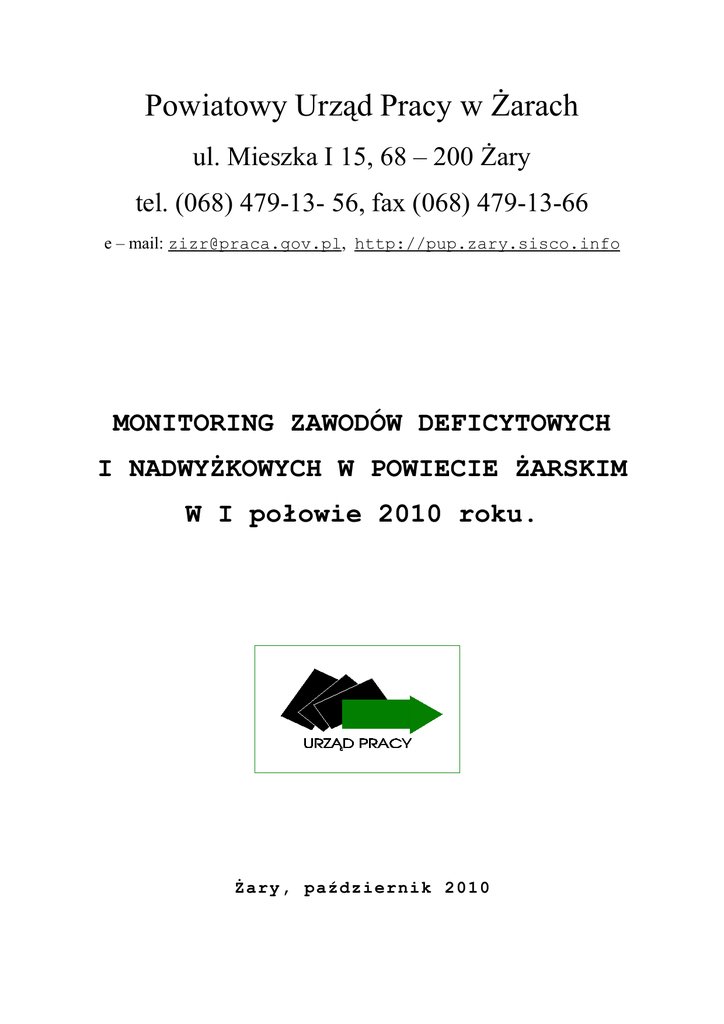 Powiatowy Urząd Pracy w Żarach ul. Mieszka I 15, 68 – 200 Żary tel. (068) 479-13- 56, fax (068) 479-13-66 e – mail: [email protected], http://pup.zary.sisco.info MONITORING ZAWODÓW DEFICYTOWYCH I NADWYŻKOWYCH W POWIECIE ŻARSKIM W I połowie 2010 roku. Żary, październik 2010 Monitoring zawodów deficytowych i nadwyżkowych w 2007 roku I. Wstęp Prowadzenie monitoringu zawodów deficytowych i nadwyżkowych przez Powiatowy Urząd Pracy w Żarach jest jedną z głównych metod obserwacji oraz analizy lokalnego rynku pracy. Analiza ta pozwala na porównanie ofert pracy zgłaszanych do powiatowego urzędu pracy oraz osób zarejestrowanych według zawodów, oraz na tej podstawie tworzenie rankingów , pozwalających na formułowanie ocen i wniosków dla systemu kształcenia zawodowego oraz dla potrzeb szkoleniowych osób bezrobotnych. Monitoring ten ma służyć lepszemu dopasowaniu kwalifikacji osób poszukujących pracy do potrzeb pracodawców. Na żarskim rynku pracy na zasadzie przeciwności współwystępują praca oraz bezrobocie. „Praca” stanowi ważną oraz poszukiwaną wartość pozwalającą na realizację podstawowych i ważnych potrzeb, a bezrobocie pociąga za sobą poważne zagrożenie w sferze ekonomicznej, społecznej i moralnej. Instytucje rynku pracy starają się wykorzystać wszystkie instrumenty i środki, którymi dysponują, by przeciwdziałać bezrobociu. Do obowiązków instytucji zajmujących się problemami rynku pracy ( nie tylko publicznych służb zatrudnienia) należy skuteczne prognozowanie zawodów przyszłościowych. Powiatowy Urząd Pracy w Żarach prowadzi systematyczną obserwację lokalnego rynku pracy pod względem kształtowania się podaży i popytu na siły robocze. Monitoring zawodów deficytowych i nadwyżkowych poprawia planowanie szkoleń bezrobotnych pod potrzeby żarskiego rynku pracy. Opracowany raport wzbogaca informacje o kierunkach kształcenia w powiecie żarskim oraz o najbliższych prognozach, potrzeb pracodawców na pracowników Informacje zawarte w opracowaniu mogą być użyteczne dla: • lokalnych władz oświatowych oraz dyrekcji szkół ponadgimnazjalnych; • lokalnych organów rządowych oraz samorządowych; • instytucji i organizacji społeczno-politycznych z terenu powiatu żarskiego zainteresowanych współdziałaniem na rynku pracy. 2 Monitoring zawodów deficytowych i nadwyżkowych w 2007 roku II. Podstawa opracowania Opracowywanie analiz rynku pracy, w tym prowadzenie monitoringu zawodów deficytowych i nadwyżkowych, jest jednym z zadań samorządu powiatu i województwa w zakresie polityki rynku pracy. Zadanie to wynika z zapisów Ustawy z dnia 20 kwietnia 2004 r. o promocji zatrudnienia i instytucjach rynku pracy ( Dz. U. Nr 99 poz. 1001) art. 9, ust. 1 pkt. 9 i art. 8, ust. 1 pkt.3). Ponadto podstawą opracowania jest:: • Rozporządzenie Rady Ministrów z dnia 19 lipca 2005 r. w sprawie programu badań statystycznych statystyki publicznej na rok 2006 (Dz.U. Nr 178, poz. 1482 z późn. zm.) • Rozporządzenie Ministra Gospodarki i Pracy z dnia 8 grudnia 2004 r. w sprawie klasyfikacji zawodów i specjalności dla potrzeb rynku pracy oraz zakresu jej stosowania (Dz. U. Nr 265, poz. 2644) • Rozporządzenie Rady Ministrów z dnia 20 stycznia 2004 r. w sprawie Polskiej Klasyfikacji Działalności (PKD)(Dz. U. Nr 33, poz. 289 z późn. zm.). III. Cel opracowania Celem analizy dotyczącej osób bezrobotnych i ofert pracy według zawodów jest sporządzenie diagnozy zawodów deficytowych i nadwyżkowych na rynku pracy w powiecie żarskim w I- wszej połowie 2010 roku. Informacje te mogą być pomocne dla: Regionalnych władz oświatowych oraz dyrekcji szkół ponadgimnazjalnych, jako niezbędna informacja w korekcie poziomu, struktury i treści kształcenia młodzieży jak i bieżących potrzeb rynku, Prowadzenia racjonalnej polityki ryku pracy, jak i kierowaniu środkami Funduszu Pracy, w zakresie aktywnych form przeciwdziałania bezrobociu, Doskonalenia jakości usług rynku pracy w zakresie pośrednictwa i poradnictwa zawodowego, poprzez dostarczanie szczegółowej informacji w zakresie zawodów poszukiwanych przez pracodawców oraz zawodów, na które zmniejsza się zapotrzebowanie na rynku pracy, 3 Monitoring zawodów deficytowych i nadwyżkowych w 2007 roku Określenie odpowiednich kierunków szkoleń osób bezrobotnych, Planowania poziomu i kierunków kształcenia zawodowego, dostosowanego do potrzeb rynku pracy w powiecie żarskim. Jednocześnie zakłada się, iż głównymi użytkownikami informacji wynikowych monitoringu zawodów deficytowych i nadwyżkowych będą organy i instytucje zainteresowane problematyką rynku pracy. IV. Metodologia opracowania W celu prawidłowego zrozumienia zagadnień związanych z bilansem zawodów deficytowych i nadwyżkowych, konieczne jest przybliżenie podstawowych pojęć owej tematyki. Monitoring zawodów deficytowych i nadwyżkowych jest to proces systematycznego obserwowania zjawisk zachodzących na rynku pracy, dotyczących kształtowania popytu na pracę i podaży zasobów pracy w przekroju terytorialno – zawodowym oraz formułowania na tej podstawie ocen, wnisków i krótkotrwałych prognoz niezbędnych dla prawidłowego funkcjonowania systemów: szkolenia bezrobotnych oraz kształcenia zawodowego. Opracowanie jest wypełnione wnioskami odnoszącymi się do zawodów, które można określić, w zależności od wskaźnika jako deficytowe i nadwyżkowe. Zawód deficytowy należy rozumieć zawód, na który występuje na rynku pracy wyższe zapotrzebowanie niż liczba osób poszukujących pracy w tym zawodzie. Zawód nadwyżkowy oznacza taki, na który występuje na rynku pracy mniejsze zapotrzebowanie niż liczba poszukujących pracy w tym zawodzie. Monitoring jest prowadzony w układzie trójszczeblowym obejmującym powiat, województwo i kraj w postaci raportów. Raport jest sporządzony przez powiatowe (z terenu każdego powiatu) i wojewódzkie (z terenu 