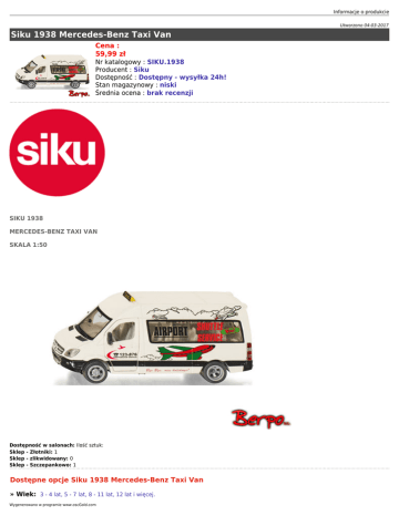 Informacje o produkcie Utworzono 04-03-2017 Siku 1938 Mercedes-Benz Taxi Van Cena : 59,99 zł Nr katalogowy : SIKU.1938 Producent : Siku Dostępność : Dostępny - wysyłka 24h! Stan magazynowy : niski Średnia ocena : brak recenzji SIKU 1938 MERCEDES-BENZ TAXI VAN SKALA 1:50 Dostępność w salonach: Ilość sztuk: Sklep - Złotniki: 1 Sklep - zlikwidowany: 0 Sklep - Szczepankowo: 1 Dostępne opcje Siku 1938 Mercedes-Benz Taxi Van » Wiek: 3 - 4 lat, 5 - 7 lat, 8 - 11 lat, 12 lat i więcej. Wygenerowano w programie www.oscGold.com