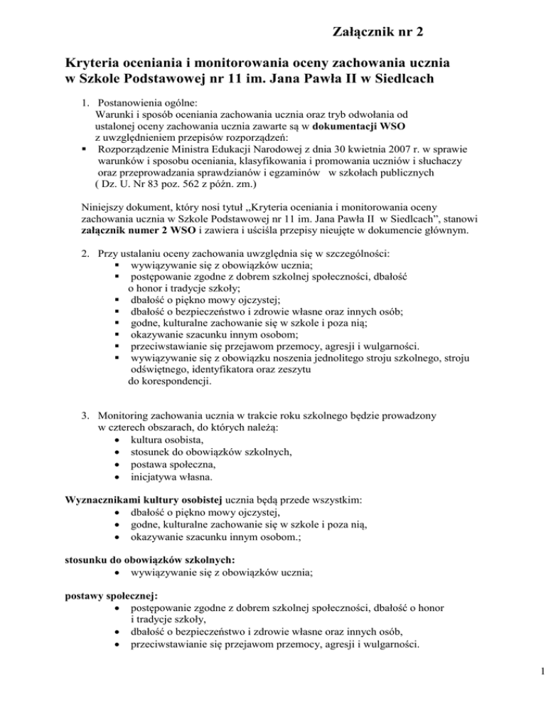 Załącznik nr 2 Kryteria oceniania i monitorowania oceny zachowania ucznia w Szkole Podstawowej nr 11 im. Jana Pawła II w Siedlcach 1. Postanowienia ogólne: Warunki i sposób oceniania zachowania ucznia oraz tryb odwołania od ustalonej oceny zachowania ucznia zawarte są w dokumentacji WSO z uwzględnieniem przepisów rozporządzeń: Rozporządzenie Ministra Edukacji Narodowej z dnia 30 kwietnia 2007 r. w sprawie warunków i sposobu oceniania, klasyfikowania i promowania uczniów i słuchaczy oraz przeprowadzania sprawdzianów i egzaminów w szkołach publicznych ( Dz. U. Nr 83 poz. 562 z późn. zm.) Niniejszy dokument, który nosi tytuł ,,Kryteria oceniania i monitorowania oceny zachowania ucznia w Szkole Podstawowej nr 11 im. Jana Pawła II w Siedlcach”, stanowi załącznik numer 2 WSO i zawiera i uściśla przepisy nieujęte w dokumencie głównym. 2. Przy ustalaniu oceny zachowania uwzględnia się w szczególności: wywiązywanie się z obowiązków ucznia; postępowanie zgodne z dobrem szkolnej społeczności, dbałość o honor i tradycje szkoły; dbałość o piękno mowy ojczystej; dbałość o bezpieczeństwo i zdrowie własne oraz innych osób; godne, kulturalne zachowanie się w szkole i poza nią; okazywanie szacunku innym osobom; przeciwstawianie się przejawom przemocy, agresji i wulgarności. wywiązywanie się z obowiązku noszenia jednolitego stroju szkolnego, stroju odświętnego, identyfikatora oraz zeszytu do korespondencji. 3. Monitoring zachowania ucznia w trakcie roku szkolnego będzie prowadzony w czterech obszarach, do których należą: kultura osobista, stosunek do obowiązków szkolnych, postawa społeczna, inicjatywa własna. Wyznacznikami kultury osobistej ucznia będą przede wszystkim: dbałość o piękno mowy ojczystej, godne, kulturalne zachowanie się w szkole i poza nią, okazywanie szacunku innym osobom.; stosunku do obowiązków szkolnych: wywiązywanie się z obowiązków ucznia; postawy społecznej: postępowanie zgodne z dobrem szkolnej społeczności, dbałość o honor i tradycje szkoły, dbałość o bezpieczeństwo i zdrowie własne oraz innych osób, przeciwstawianie się przejawom przemocy, agresji i wulgarności. 1 W ciągu semestru powinna być wystawiona przynajmniej jedna ocena w monitorowanych obszarach (dotyczy trzech pierwszych obszarów); nie podlega obowiązkowej ocenie obszar czwarty: inicjatywa własna. Podstawą oceny zachowania ucznia w poszczególnych obszarach są: Karta obserwacji ucznia Zeszyt uwag Notatki ze spotkań z rodzicami i uczniami Zapisy w dziennikach lekcyjnych 4. Szczegółowe kryteria oceniania zachowania ucznia. Jako wyjściowe - wychowawca przyjmuje zachowanie dobre. Zachowanie wzorowe otrzymuje uczeń, który spełnia wymagania na zachowanie bardzo dobre, a ponadto przynajmniej trzy warunki spośród podanych: a) Jest zawsze przygotowany do lekcji. b) Reaguje na przejawy zła, pomaga słabszym. c) Z własnej inicjatywy podejmuje działalność na rzecz innych oraz szkoły. d) Dba o dobre imię szkoły, reprezentuje ją w zawodach, konkursach, uroczystościach pozaszkolnych i umiejętnie godzi to z obowiązkami szkolnymi. Zachowanie bardzo dobre otrzymuje uczeń, który spełnia wymagania na zachowanie dobre, a ponadto: a) Angażuje się w prace społeczno- użyteczne na rzecz klasy, szkoły, środowiska. b) Bierze udział w przygotowaniu uroczystości szkolnych i klasowych. c) Wywiązuje się z powierzonego zadania. d) Pomaga kolegom w nauce. e) Wyróżnia się wysoką kulturą osobistą (zachowania, języka, ubioru). f) Nie ma uwag dotyczących niewłaściwego zachowania. g) Cieszy się szacunkiem i zaufaniem rówieśników. h) Zawsze dba o swój estetyczny wygląd: - nosi czysty, kompletny strój uczniowski -bluza + koszulka lub sama koszulka; (w semestrze dopuszcza się możliwość trzykrotnego braku stroju uczniowskiego w uzasadnionych przypadkach- wyjaśnia je wychowawca z opiekunem prawnym dziecka). Każdy nauczyciel jest zobowiązany do kontroli stroju ucznia i współpracy z wychowawcą. - przestrzega zasad higieny osobistej. i) Zawsze posiada umieszczony we właściwym miejscu identyfikator oraz nosi zeszyt do korespondencji (dopuszczalne braki- jw.) Zachowanie dobre otrzymuje uczeń, który spełnia następujące warunki: a) Aktywnie uczestniczy w lekcjach. b) Posiada odpowiednie do danego przedmiotu pomoce i przybory szkolne. c) Uzupełnia wszystkie braki wynikające z absencji. d) Przestrzega ustalonych zasad i porządku w czasie przerw. e) Jest punktualny. f) Dba o higienę osobistą, estetykę wyglądu i czystość ubioru; zmienia obuwie. g) Wypełnia polecenia pracowników szkoły. h) Przestrzega regulaminu stołówki, świetlicy i biblioteki szkolnej. i) Systematycznie uczęszcza na zajęcia szkolne i w ciągu tygodnia usprawiedliwia opuszczone godziny. j) Szanuje godność osobistą, dobre imię i własność innych. 2 k) Uczestniczy w uroczystościach szkolnych w stroju galowym i właściwie się zachowuje. l) Bierze udział w życiu kulturalnym klasy, szkoły i środowiska. ł) Systematycznie i odpowiedzialnie uczestniczy w zajęciach dodatkowych, na które się zgłosił. m) Dba o piękno mowy ojczystej, nie stosuje agresji słownej, nie używa wulgaryzmów. n) Wystrzega się uzależnień i nie namawia do tego innych. o) Jego zachowanie w czasie przerw nie stwarza zagrożenia dla zdrowia i bezpieczeństwa innych. p) Nie stosuje przemocy fizycznej i słownej wobec kolegów i pracowników szkoły. r) Dba o ład i porządek w szkole, szanuje sprzęt, meble, urządzenia i pomoce szkolne. s) Uczestniczy w zajęciach w obowiązującym stroju uczniowskim (w semestrze dopuszcza się możliwość pięciokrotnego braku stroju z przyczyn wyjaśnionych z wychowawcą klasy). t) Na uroczystości szkolne przychodzi w stroju odświętnym ( ustalonym przez wychowawcę lub organizatora uroczystości). u) Nosi identyfikator, zeszyt do korespondencji. * W szczególnych przypadkach wychowawca może 