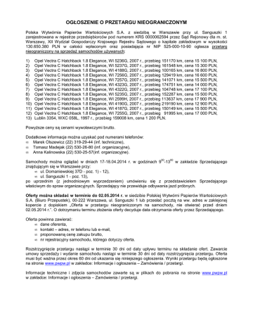 OGŁOSZENIE O PRZETARGU NIEOGRANICZONYM Polska Wytwórnia Papierów Wartościowych S.A. z siedzibą w Warszawie przy ul. Sanguszki 1 zarejestrowana w rejestrze przedsiębiorców pod numerem KRS 0000062594 przez Sąd Rejonowy dla m. st. Warszawy, XII Wydział Gospodarczy Krajowego Rejestru Sądowego o kapitale zakładowym w wysokości 130.650.380 PLN w całości wpłaconym oraz posiadająca nr NIP 525-000-10-90 ogłasza przetarg nieograniczony na sprzedaŜ samochodów uŜywanych: 1) 2) 3) 4) 5) 6) 7) 8) 9) 10) 11) 12) 13) Opel Vectra C Hatchback 1.8 Elegance, WI 5236G, 2007 r., przebieg 151170 km, cena 15 100 PLN, Opel Vectra C Hatchback 1.8 Elegance, WI 5237G, 2007 r., przebieg 161548 km, cena 15 300 PLN, Opel Vectra C Hatchback 1.8 Elegance, WI 4188G, 2007 r., przebieg 100165 km, cena 16 800 PLN, Opel Vectra C Hatchback 1.8 Elegance, WI 7256G, 2007 r., przebieg 129419 km, cena 16 600 PLN, Opel Vectra C Hatchback 1.8 Elegance, WI 7257G, 2007 r., przebieg 141071 km, cena 15 500 PLN, Opel Vectra C Hatchback 1.8 Elegance, WI 4323G, 2007 r., przebieg 174751 km, cena 14 000 PLN, Opel Vectra C Hatchback 1.8 Elegance, WI 4322G, 2007 r., przebieg 104748 km, cena 17 100 PLN, Opel Vectra C Hatchback 1.8 Elegance, WI 5235G, 2007 r., przebieg 152287 km, cena 15 500 PLN, Opel Vectra C Hatchback 1.8 Elegance, WI 2599H, 2007 r., przebieg 113637 km, cena 17 900 PLN, Opel Vectra C Hatchback 1.8 Elegance, WI 4190G, 2007 r., przebieg 219190 km, cena 12 900 PLN, Opel Vectra C Hatchback 1.8 Elegance, WI 4187G, 2007 r., przebieg 150149 km, cena 15 500 PLN, Opel Vectra C Hatchback 1.8 Elegance, WI 7255G, 2007 r., przebieg 91995 km, cena 17 000 PLN, Lublin 3354, WXC 058L, 1997 r., przebieg 159008 km, cena 1 200 PLN. PowyŜsze ceny są cenami wywoławczymi brutto. Dodatkowe informacje moŜna uzyskać pod numerami telefonów: • Marek Olszewicz (22) 319-29-44 (inf. techniczne), • Tomasz Madejak (22) 530-26-80 (inf. organizacyjne), • Anna Kalinowska (22) 530-25-57(inf. organizacyjne). 00 00 Samochody moŜna oglądać w dniach 17-18.04.2014 r. w godzinach 9 -13 w zakładzie Sprzedającego znajdującym się w Warszawie przy: • ul. Domaniewskiej 37D - poz. 1) - 12), • ul. Sanguszki 1 - poz. 13), po uprzednim (z jednodniowym wyprzedzeniem) umówieniu się z przedstawicielem Sprzedającego właściwym do spraw organizacyjnych. Sprzedający nie przewiduje odbywania jazd próbnych. Oferty moŜna składać w terminie do 02.05.2014 r. w siedzibie Polskiej Wytwórni Papierów Wartościowych S.A. (Biuro Przepustek), 00-222 Warszawa, ul. Sanguszki 1 lub przesłać pocztą na ww. adres w zaklejonej kopercie z dopiskiem „Oferta w przetargu nieograniczonym na samochody, nie otwierać przed dniem 02.05.2014 r.”. O dotrzymaniu terminu złoŜenia oferty decyduje data otrzymania oferty przez Sprzedającego. Oferta powinna zawierać: • dane oferenta, • kontakt – adres, nr telefonu lub e-mail, • proponowaną cenę zakupu brutto, • nr rejestracyjny samochodu, którego dotyczy oferta. Rozstrzygnięcie przetargu nastąpi w terminie 30 dni od daty upływu terminu na składanie ofert. Zawarcie umowy sprzedaŜy i wydanie samochodu nastąpi w terminie 30 dni od daty rozstrzygnięcia przetargu. Oferta musi być waŜna przez okres 60 dni od ukazania się niniejszego ogłoszenia. Wyniki przetargu będą ogłoszone na stronie www.pwpw.pl w zakładce: Informacje i ogłoszenia – Zamówienia / przetargi. Informacje techniczne i zdjęcia samochodów zawarte są w plikach do pobrania na stronie www.pwpw.pl w zakładce: Informacje i ogłoszenia – Zamówienia / przetargi.