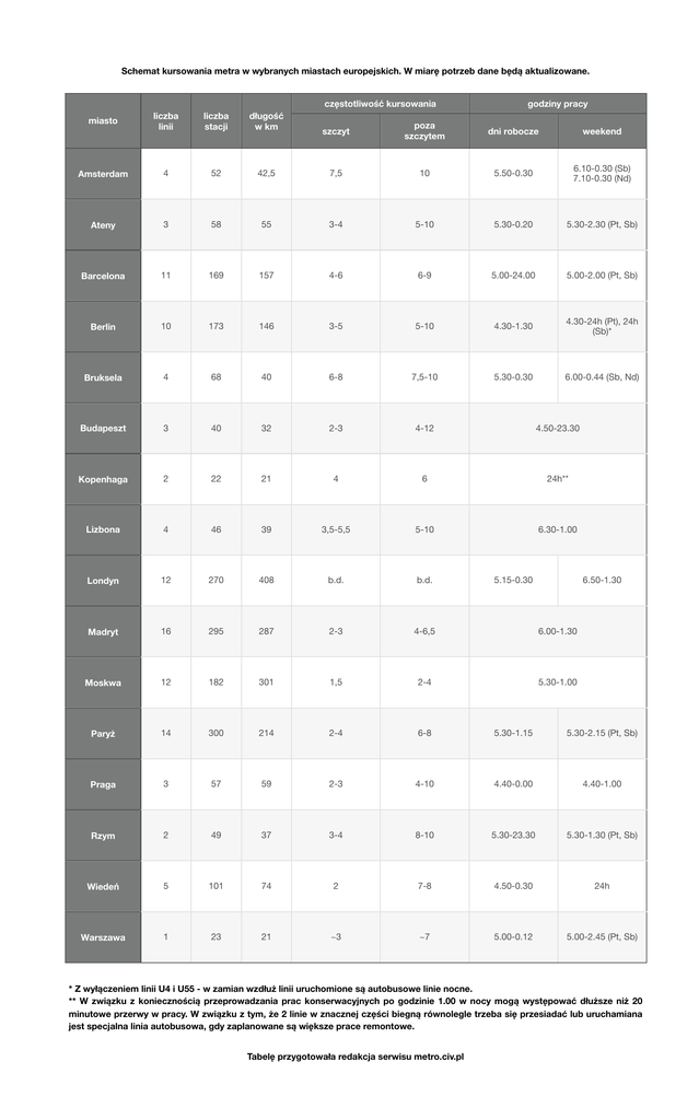 Schemat kursowania metra w wybranych miastach europejskich. W miarę potrzeb dane będą aktualizowane. częstotliwość kursowania godziny pracy miasto liczba linii liczba stacji długość w km szczyt poza szczytem dni robocze weekend Amsterdam 4 52 42,5 7,5 10 5.50-0.30 6.10-0.30 (Sb) 7.10-0.30 (Nd) Ateny 3 58 55 3-4 5-10 5.30-0.20 5.30-2.30 (Pt, Sb) Barcelona 11 169 157 4-6 6-9 5.00-24.00 5.00-2.00 (Pt, Sb) Berlin 10 173 146 3-5 5-10 4.30-1.30 4.30-24h (Pt), 24h (Sb)* Bruksela 4 68 40 6-8 7,5-10 5.30-0.30 6.00-0.44 (Sb, Nd) Budapeszt 3 40 32 2-3 4-12 4.50-23.30 Kopenhaga 2 22 21 4 6 24h** Lizbona 4 46 39 3,5-5,5 5-10 6.30-1.00 Londyn 12 270 408 b.d. b.d. Madryt 16 295 287 2-3 4-6,5 6.00-1.30 Moskwa 12 182 301 1,5 2-4 5.30-1.00 Paryż 14 300 214 2-4 6-8 5.30-1.15 5.30-2.15 (Pt, Sb) Praga 3 57 59 2-3 4-10 4.40-0.00 4.40-1.00 Rzym 2 49 37 3-4 8-10 5.30-23.30 5.30-1.30 (Pt, Sb) Wiedeń 5 101 74 2 7-8 4.50-0.30 24h Warszawa 1 23 21 ~3 ~7 5.00-0.12 5.00-2.45 (Pt, Sb) 5.15-0.30 6.50-1.30 * Z wyłączeniem linii U4 i U55 - w zamian wzdłuż linii uruchomione są autobusowe linie nocne. ** W związku z koniecznością przeprowadzania prac konserwacyjnych po godzinie 1.00 w nocy mogą występować dłuższe niż 20 minutowe przerwy w pracy. W związku z tym, że 2 linie w znacznej części biegną równolegle trzeba się przesiadać lub uruchamiana jest specjalna linia autobusowa, gdy zaplanowane są większe prace remontowe. Tabelę przygotowała redakcja serwisu metro.civ.pl