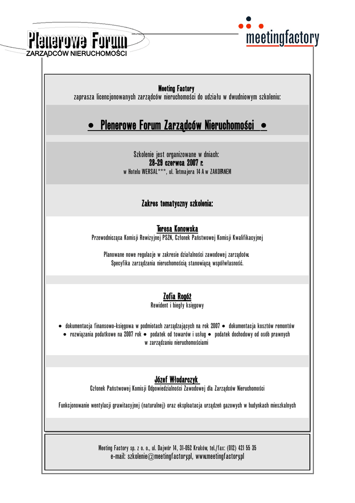 Plenerowe Forum ZARZĄDCÓW NIERUCHOMOŚCI Meeting Factory zaprasza licencjonowanych zarządców nieruchomości do udziału w dwudniowym szkoleniu: • Plenerowe Forum Zarządców Nieruchomości • Szkolenie jest organizowane w dniach: 28-29 czerwca 2007 r. w Hotelu WERSAL***, ul. Tetmajera 14 A w ZAKOPANEM Zakres tematyczny szkolenia: Teresa Konowska Przewodnicząca Komisji Rewizyjnej PSZN, Członek Państwowej Komisji Kwalifikacyjnej Planowane nowe regulacje w zakresie działalności zawodowej zarządców. Specyfika zarządzania nieruchomością stanowiącą współwłasność. Zofia Rogóż Rewident i biegły księgowy • dokumentacja finansowo-księgowa w podmiotach zarządzających na rok 2007 • dokumentacja kosztów remontów • rozwiązania podatkowe na 2007 rok • podatek od towarów i usług • podatek dochodowy od osób prawnych w zarządzaniu nieruchomościami Józef Włodarczyk Członek Państwowej Komisji Odpowiedzialności Zawodowej dla Zarządców Nieruchomości Funkcjonowanie wentylacji grawitacyjnej (naturalnej) oraz eksploatacja urządzeń gazowych w budynkach mieszkalnych Meeting Factory sp. z o. o., ul. Dajwór 14, 31-052 Kraków, tel./fax: (012) 421 55 35 e-mail: [email protected], www.meetingfactory.pl Plenerowe Forum ZARZĄDCÓW NIERUCHOMOŚCI Koszt szkolenia: 550zł/brutto • dwudniowe szkolenie (łącznie ok. 10 godz.) • materiały szkoleniowe • nocleg w pokoju dwuobobowym i posiłki 370zł/brutto opłata bez noclegu i udziału w kolacji integracyjnej Harmonogram szkolenia: 28.06.2007 r. – czwartek 9.00-9.30 rejestracja uczestników Hotel WERSAL*** , ul. Tetmajera 14 A w Zakopanem 10.00-13.00 szkolenie – cz. 1., P. Teresa Konowska 13.00- 14.00 przerwa obiadowa 14.00-17.00 szkolenie, cz. 2, P. Zofia Rogóż 20.00 kolacja integracyjna 29.06.2007 r. – piątek 9.00 śniadanie 10.30-13.30 szkolenie, cz. 3, P. Józef Włodarczyk 14.00 obiad 15.00 zakończenie szkolenia, wręczenie certyfikatów ukończenia kursu ! Jeśli są Państwo zainteresowani udziałem w szkoleniu prosimy o zapoznanie się z kartą zgłoszenia (drugi załącznik), wypełnienie i przesłanie jej faksem pod numer: (012) 421 55 35