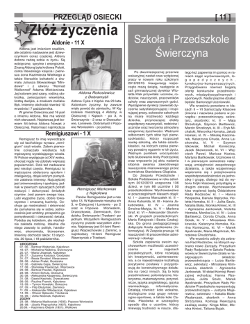 PRZEGLĄD OSIECKI ZłóŜ Ŝyczenia Aldonie - 11 X Aldona jest imieniem rzadkim, ale ostatnio nadawane jest dziewczynkom coraz częściej. Aldony dobrze radzą sobie w życiu. Są wdzięczne, sprytne i energiczne. Znaną Aldoną była królowa Polski, córka litewskiego księcia i pierwsza żona Kazimierza Wielkiego a także literackie bohaterki z dramatu Juliusza Słowackiego "Mindowe" i z utworu "Konrad Wallenrod" Adama Mickiewicza. Jej kolorem jest szary, rośliną stokrotka, zwierzęciem wiewiórka, liczbą dwójka, a znakiem zodiaku Byk. Imieniny obchodzi również 10 września i 7 października. W gminie Osieczna jest 16 pań o imieniu Aldona. Nie ma wśród nich staruszek. Najstarszą jest bowiem 54-letnia Aldona Nowak z Osiecznej. Natomiast najmłodsza Aldona Rokosiewicz z Dobramyśli Aldona Cyka z Kątów ma 23 lata. Aldonkom życzmy, by zawsze miały powód do uśmiechu. W Kąkolewie mieszkają 4 Aldony, w Osiecznej i Kątach - po 3, w Świerczynie - 2 oraz w Drzeczkowie, Łoniewie, Dobramyśli i Popowie Wonieskim - po jednej. Remigiuszowi - 1 X Remigiusz to imię wywodzące się od łacińskiego wyrazu „remigium” czyli wiosło. Zatem pierwotnie oznaczało wioślarza lub mężczyznę wyrabiającego wiosła. W Polsce występuje od XIV wieku, chociaż nigdy nie zdobyło większej popularności. Dziś też nadawane jest niezbyt często. Remigiusz to mężczyzna obdarzony sprytem i inteligencją, dzięki którym pomyślnie załatwia interesy. Najczęściej jest zrównoważony i spokojny, jednak w pewnych sytuacjach potrafi walczyć i dokonywać śmiałych czynów. Jest panem swego losu. Lubi wygodne życie, dobre towarzystwo i smaczną kuchnię. Cechuje go nieśmiałość i skłonność do zamykania się w sobie, jednocześnie jest ambitny, przepełnia go pomysłowość i ciekawość świata. Podoba się kobietom, ale niechętnie zakłada rodzinę. Idealne dla niego zawody to polityk, handlowiec, ekonomista, biznesmen. Imieniny obchodzi także: 13 stycznia, 20 lipca, i 18 października. Remigiusz Markowiak z Kąkolewa Panów Remigiuszów jest u nas tylko 13. W Kąkolewie mieszka ich 3, w Osiecznej i Łoniewie - po 2 oraz w Popowie Wonieskim, Drzeczkowie, Ziemnicach, Grodzisku, Świerczynie i Trzebani - po jednym. Wszystkim Remigiuszom życzymy przede wszystkim zdrowia. Najstarszy jest 54-letni Remigiusz Wojciechowski z Ziemnic, a najmłodszy 10-letni Remigiusz Wawrzyniak z Trzebani. URODZENIA 07. 06. - Bartosz Wojtyniak, Kąkolewo 19. 07. - Michalina Nadolna, Świerczyna 25. 07. - Maria Urbaniak, Kąkolewo 29. 07. - Zuzanna Kościarz, Grodzisko 31. 07. - Beata Sznabel, Kleszczewo 09. 08. - Adrian Prałat, Grodzisko 12. 08. - Gabriela Cepa, Świerczyna 17. 08. - Stanisław Pawlaczyk, Wojnowice 23. 08. - Bartosz Pawlak, Kąkolewo 23. 08. - Antoni Schulz, Osieczna 30. 08. - Aleksandra Kasperska, Świerczyna 31. 08. - Dawid Kasiński, Drzeczkowo 09. 09. - Paulina Franek, Kąkolewo 13. 09. – Tymon Kowalski, Osieczna 07. 09. – Filip Dłużyński, Ziemnice 11. 09. – Aleksander Włodarczyk, Kąkolewo 14. 09. – Oliwier Spławski, Trzebania 16. 09. – Zofia Woźniak, Kąkolewo ZGONY 23. 08. - Melania Maćkowiak (1933), Popowo Wonieskie 28. 08. - Józefa Pieprzyńska (1927), Kąkolewo 20.09. – Kazimiera Olejnik (1931), Wolkowo [ 11 ] Szkoła i Przedszkole Świerczyna Po dwumiesięcznej przerwie wakacyjnej nastał czas wytężonej pracy w nowym roku szkolnym 2012/2013. Inaugurację rozpoczęto mszą świętą, następnie w sali gimnastycznej dyrektor Wioletta Klak przywitała: uczniów, rodziców, nauczycieli, pracowników szkoły oraz zaproszonych gości. Wystąpienie dyrekcji zawierało życzenia satysfakcjonującej i inspirującej pracy, sukcesów szkolnych na miarę możliwości każdego dziecka, przynoszącej efekty współpracy nauczycieli, rodziców i uczniów oraz tworzenia atmosfery wzajemnej życzliwości. Ważnymi odbiorcami tych słów byli pierwszoklasiści, którzy rozpoczęli naukę szkolną, ale także szóstoklasiści, na których czeka pierwszy poważny egzamin w ich życiu. Ważnym punktem uroczystości było ślubowanie Anity Podrzyckiej oraz wręczenie jej aktu nadania stopnia awansu zawodowego nauczyciela mianowanego przez burmistrza Stanisława Glapiaka. Do Zespołu Przedszkole i Szkoła Podstawowa w roku szkolnym 2012/2013 uczęszcza 136 dzieci, w tym 86 uczniów i 50 przedszkolaków. Wychowawstwo w poszczególnych klasach objęli: kl. I – Joanna Marszałek kl. II – Anna Kubańda, kl. III - Hanna Jakubowska, kl. IV – Joanna Smolna-Matyja, kl. V – Marlena Graf, kl. VI – Aleksander Glumiński. W grupach przedszkolnych: Maria Ratajczak i Beata Czabajska. Do grona pedagogicznego dołączyła Aneta Jęcikowska (informatyka). W Zespole pracuje 16 nauczycieli i 6 pracowników administracji i obsługi. Szkoła zapewnia swoim wychowankom możliwość uczestniczenia w zajęciach pozalekcyjnych, które rozwijają ich kreatywność, zainteresowania, a co najważniejsze kształtują pozytywne postawy i przygotowują do konstruktywnego działania na rzecz innych. Są to koła przedmiotowe: polonistyczne, historyczne, matematyczne, przyrodnicze, języka angielskiego, języka niemieckiego, informatyczne. Działają również: koło wokalne, ekologiczne oraz grupy rekreacyjno-sportowe, a także koło Caritas. Placówka w szczególny sposób dba o uczniów, którzy miewają trudności w nauce, dla- tego też zapewnia im pomoc w ramach zajęć wyrównawczych, log o p e d y c z n y c h , korekcyjno-kompensacyjnych. Przygotowano również bogatą ofertę konkursów przedmiotowych, międzydyscyplinarnych i sportowych. Nadal prężnie działać będzie Samorząd Uczniowski. We wrześniu powołano w klasach II – VI Samorządy Klasowe (imiona i nazwiska podano w porządku: przewodniczący, sekretarz, skarbnik): kl. II – Maja Strzelczyk, Szymon Bartlewicz, Marcin Strzelczyk, kl. III – Eryk Michalski, Weronika Homska, Jakub Homski, kl. IV – Mikołaj Kaczmarek, Kat