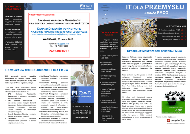 ROZWIĄZANIA DLA FMCG DLACZEGO WZIĄĆ UDZIAŁ IT DLA PRZEMYSŁU BIULETYN WARTO INFORMACYJNY ? WYDANIE • KONTAKT Z PRAKTYKAMI LUTY 2010 prezentującymi BRANŻOWE WARSZTATY MENEDŻERÓW pozytywne doświadczenia FIRM SEKTORA DÓBR KONSUMPCYJNYCH I SPOŻYCZYCH rozwoju firmy z sektora. najlepszych W TYM WYDANIU DEMAND DRIVEN SUPPLY NETWORK • UNIKALNA WIEDZA nt. BRANŻA FMCG 7 Nadchodzące wydarzenia: NAJLEPSZE PRAKTYKI PRODUKCYJNE I LOGISTYCZNE praktyk - utrzymanie zwinności rynkowej i płynnego rozwoju firmy i rozwiązań pozwalających Spotkanie menedżerów FMCG s tr . 1 ZNACZĄCA POPRAWA Demand Driven Supply Network s tr . 2 WYNIKÓW Nadchodzące wydarzenia s tr . 4 wygrywać walkę na rynku. WARSZAWA, 30 marca 2010 r. • WYMIANA DOŚWIADCZEŃ własnych wyników KONTAKT: [email protected] TEL. + 48 71 380 3000 oraz badań ze znawcami branż. ZAPRASZAMY ! • wzrost produktywności o 20 - 50%, • wzrost trafności prognozy rynku, • skrócenie średniego R OZWIĄZANIA TECHNOLOGICZNE IT DLA FMCG QAD skutecznie dopasowane do rozwija strategii narzędzia DDSN, dzięki czemu znacznie efektywniej niż do tej pory czasu dostaw, • zwiększenie promocji • QAD Supply Visualization – usprawnione zarządzanie dostawami i kontaktami Planning – planowanie zyskownych, z dostawcami, można wykorzystywać najlepsze praktyki. • Requirments Firma • QAD Distributed Order Management – • spadek ilości braków asortymentowych, wymagań i komunikowanie ich dostawcom QAD oferuje zintegrowany zestaw narzędzi, które z powodzeniem mogą zostać synchronizacja i integracja przychodzących w tym celu zastosowane. Są to m.in.: zleceń i alokacja zasobów dla nich, • QAD Customer Relationship Management – efektywne zarządzanie • QAD Demand Management – – Inventory produktcie Planning) do skutecznego do wycofania oraz z standaryzowanym środowiskiem projektowania produktu, • QAD Lean Manufacturing, Kanban, Flow Scheduling – pakiet umożliwiający pracę planowanie sprzedaży i operacji, w systemie szczupłej produkcji, konfigurowalnych – produktów przyjmowania zamówień, tworzenie w trakcie • Consignment Inventory – zapasów towarowych, rynku; Sales & Operations Planning – wydajne Configurator • zmniejszenie o 1/3 zarządzanie cyklem życia produktu od zarządzanie wszystkimi informacjami o zarządzania popytem, • Management Management Engine, Collaborative Portal, Capacity • Lifecycle pomysłu Rough-Cut perfekcyjnie realizowanych zamówień, procesami handlowymi i promocjami, rozbudowany zestaw narzędzi (Demand Optimization, • ponad 20% więcej • QAD Trade Management – zarządzanie • Product relacjami z klientami, wspieranie zarządzania zapasami powierzonymi, oraz wiele innych dedykowanych sektorowi. Rozwiązania dla FMCG str . 4 Przyjęcie strategii działania w sieci dostaw sterowanej popytem Demand Driven Supply Network powoduje m.in.: DOWIEDZ SIĘ WIĘCEJ tel. +48 71 380 30 00 fax +48 71 380 31 99 www.qad.com • niższe koszty łańcucha dostaw do 5% przychodów. • redukcja kar za nieterminowść o 50-95%. SPOTKANIE MENEDŻERÓW SEKTORA FMCG Szanowni Państwo, mamy przyjemność zaprosić Państwa warsztatach dóbr do Menedżerów konsumpcyjnych udziału firm i w sektora W trakcie warsztatów eksperci przedstawią również rozwiązania wspierające i pozwalające wypracować najlepsze praktyki branżowe przetwórstwa producenta na rynku konsumpcyjnym. Omówią spożywczego, by zaprezentować najlepsze takie zagadnienia jak: zarządzanie popytem, praktyki produkcyjne i logistyczne dla szczupła sektora. sprzedaży i operacji (S&OP), zarządzanie Nasze spotkanie wypełni dyskusja na temat klientem (CRM), konfigurowanie produktu, najlepszych zarządzanie produkcja promocjami, doświadczeń i praktyk organizacyjnych gwarantujących skuteczny produktu (Lean), zarządzanie rozwojem i planowanie relacjami cyklem (PDM/PLM), z życia zarządzanie rozwój w skali międzynarodowej. Gościem transportem, optymalizacja łańcucha dostaw specjalnym będzie Dariusz Wierzbicki, CIO (Supply Visualization) czy analiz biznesowych firmy Farm Frites, dostawcy m.in. sieci (środowisko Business Intelligence). McDonald’s, informatyzacji ekspert firmy z produkcyjnej dziedziny sektora FMCG. W trakcie sesji strategicznej zostaną przedstawione rozwiązania stosowane m.in. wśród firm: Cykoria, FoodCare (Gellwe), Nutricia, HFP (Sonko), Farm Frites czy Kraft, stanowiące istotny krok w rozwoju własnego łańcucha dostaw wg DDSN. Będzie to także okazja, aby uzyskać unikalną wiedzę na temat działań pozwalających wygrywać walkę na rynku, a także wymienić doświadczenia z innymi przedstawicielami swojej branży. Patronat medialny objął serwis: ZDANIEM EKSPERTÓW WARTO WIEDZIEĆ… DDSN optymalizuje wykorzystanie oraz DEMAND DRIVEN SUPPLY NETWORK kapitału rentowność, cześnie jedno- maksymalną satysfakcję klienta. Inaczej Aby poradzić sobie ze stale i szybko zmieniającymi się wymaganiami mówiąc, rynku przedsiębiorstwa muszą połączyć wszystkich swoich dostawców, podejście sterowania znacząco popytem obniża towarowe, braki ekspert z dziedziny zrównoważonego rozwoju firmny oraz propagator strategii DDSN w USA i innych krajach świata SIEĆ DOSTAW STEROWANA POPYTEM pozwalając osiągnąć PHIL FRIEDMAN „Zmiana sposobu myślenia producentów, partnerów handlowych i klientów w jedną, wspólną sieć. to jedyne sensowne wyjście jednocześnie usuwając z dostaw łańcucha nadmiarowe dla producentów, by nie Szansy na sukces upatruje się w nowej Dostęp organizacji trzebowania rynku, skoncentrowanej na do danych klientów, dotyczących zapo- marnowali swoich zasobów dostarczanych przez ani nie produkowali do zapasy, co razem prowadzi kliencie i sterowanej popytem. Firmy nie sprzedawców prosto z punktów sprzedaży, magazynu. Nie chodzi o do rentowności są w stanie dłużej prosperować w oparciu pozwala wyprodukowanie działania. Nie je