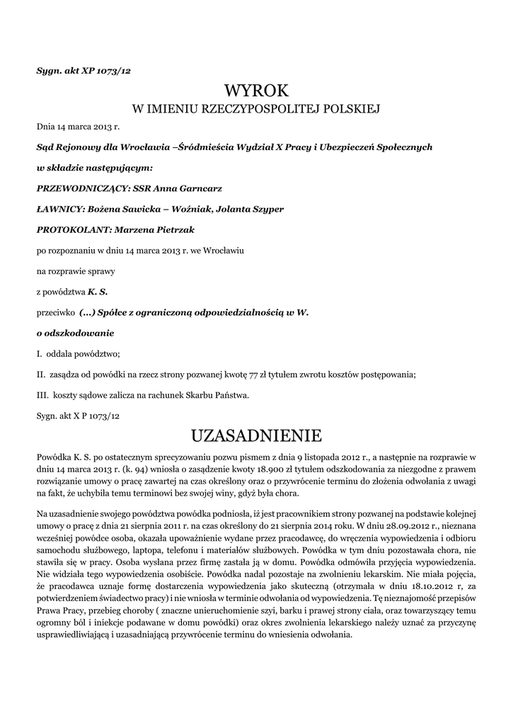 Sygn. akt XP 1073/12 WYROK W IMIENIU RZECZYPOSPOLITEJ POLSKIEJ Dnia 14 marca 2013 r. Sąd Rejonowy dla Wrocławia –Śródmieścia Wydział X Pracy i Ubezpieczeń Społecznych w składzie następującym: PRZEWODNICZĄCY: SSR Anna Garncarz ŁAWNICY: Bożena Sawicka – Woźniak, Jolanta Szyper PROTOKOLANT: Marzena Pietrzak po rozpoznaniu w dniu 14 marca 2013 r. we Wrocławiu na rozprawie sprawy z powództwa K. S. przeciwko (...) Spółce z ograniczoną odpowiedzialnością w W. o odszkodowanie I. oddala powództwo; II. zasądza od powódki na rzecz strony pozwanej kwotę 77 zł tytułem zwrotu kosztów postępowania; III. koszty sądowe zalicza na rachunek Skarbu Państwa. Sygn. akt X P 1073/12 UZASADNIENIE Powódka K. S. po ostatecznym sprecyzowaniu pozwu pismem z dnia 9 listopada 2012 r., a następnie na rozprawie w dniu 14 marca 2013 r. (k. 94) wniosła o zasądzenie kwoty 18.900 zł tytułem odszkodowania za niezgodne z prawem rozwiązanie umowy o pracę zawartej na czas określony oraz o przywrócenie terminu do złożenia odwołania z uwagi na fakt, że uchybiła temu terminowi bez swojej winy, gdyż była chora. Na uzasadnienie swojego powództwa powódka podniosła, iż jest pracownikiem strony pozwanej na podstawie kolejnej umowy o pracę z dnia 21 sierpnia 2011 r. na czas określony do 21 sierpnia 2014 roku. W dniu 28.09.2012 r., nieznana wcześniej powódce osoba, okazała upoważnienie wydane przez pracodawcę, do wręczenia wypowiedzenia i odbioru samochodu służbowego, laptopa, telefonu i materiałów służbowych. Powódka w tym dniu pozostawała chora, nie stawiła się w pracy. Osoba wysłana przez firmę zastała ją w domu. Powódka odmówiła przyjęcia wypowiedzenia. Nie widziała tego wypowiedzenia osobiście. Powódka nadal pozostaje na zwolnieniu lekarskim. Nie miała pojęcia, że pracodawca uznaje formę dostarczenia wypowiedzenia jako skuteczną (otrzymała w dniu 18.10.2012 r, za potwierdzeniem świadectwo pracy) i nie wniosła w terminie odwołania od wypowiedzenia. Tę nieznajomość przepisów Prawa Pracy, przebieg choroby ( znaczne unieruchomienie szyi, barku i prawej strony ciała, oraz towarzyszący temu ogromny ból i iniekcje podawane w domu powódki) oraz okres zwolnienia lekarskiego należy uznać za przyczynę usprawiedliwiającą i uzasadniającą przywrócenie terminu do wniesienia odwołania. W odpowiedzi na pozew strona pozwana wniosła o oddalenie powództwa w całości oraz o zasadzenie od powoda kosztów procesu, w tym kosztów zastępstwa procesowego według norm przepisanych. W uzasadnieniu swojego stanowiska, strona pozwana w pierwszej kolejności zarzuciła, iż powódka nie wykazała istnienia podstaw do przywrócenia terminu do złożenia odwołania do sądu od wręczonego jej wypowiedzenia. Zgodnie z treścią art. 61 kodeksu cywilnego, stosowanego w zakresie prawa pracy na podstawie art. 300 kodeksu pracy, oświadczenie woli, które ma być złożone innej osobie, jest złożone z chwilą, gdy doszło do niej w taki sposób, że mogła zapoznać się z jego treścią. W niniejszej sprawie powódka przyznała, iż w dniu 28 września 2012 r. upoważniona przez pozwanego osoba wręczyła jej wypowiedzenie umowy o pracę, zaś powódka odmówiła przyjęcia. W związku z powyższym, powódka miała możliwość zapoznania się z treścią wypowiedzenia, co wywołało skutek w postaci skutecznego złożenia przez pracodawcę oświadczenia woli w przedmiocie wypowiedzenia umowy o pracę. W konsekwencji złożone oświadczenie wywołało skutki prawne i od daty 28 września 2012 r. należy liczyć bieg terminu do złożenia odwołania do sądu pracy, któremu to terminowi powódka bezsprzecznie uchybiła. Powoływanie się zaś na nieznajomość prawa nie stanowi skutecznej przesłanki do przywrócenia terminu. Ponadto, strona pozwana podniosła, że powódka w chwili wręczania jej oświadczenia o wypowiedzeniu umowy nie korzystała z ochrony uniemożliwiającej takie działanie ze strony pozwanego, albowiem w chwili wręczenia oświadczenia o wypowiedzeniu, pozwany nie został poinformowany o chorobie powódki poświadczonej zwolnieniem lekarskim. Zgodnie z orzecznictwem Sądu Najwyższego, nie podlega ochronie przed wypowiedzeniem pracownik, któremu pracodawca wręczył wypowiedzenie umowy o pracę, a następnie pracownik przyniósł zwolnienie lekarskie. Naganną praktyką jest przynoszenie przez pracowników zwolnień lekarskich ze skutkiem wstecznym, obejmującym dzień poprzedzający wypowiedzenie umowy o pracę. Niezależnie od tego w takim przypadku pracownik nie korzysta z ochrony. W niniejszej sprawie chronologia była następująca: w pierwszej kolejności zostało powódce wręczone wypowiedzenie umowy o pracę, a następnie udała się ona do lekarza i uzyskała zwolnienie lekarskie. Sąd Rejonowy ustalił następujący stan faktyczny: Powódka K. S. była pracownikiem strony pozwanej (...) spółka z o.o. w W. w okresie od 26.04.2010 r., początkowo na podstawie umowy o pracę na czas określony do 21.08.2011 r. a następnie na podstawie drugiej umowy o pracę na czas określony od 22 sierpnia 2011 r. do 21 sierpnia 2014 r. w pełnym wymiarze czasu pracy, na stanowisku Przedstawiciela Medycznego, za wynagrodzeniem zasadniczym w wysokości 6.000,00 zł brutto miesięcznie. Średnie miesięczne wynagrodzenie powódki liczone jak za ekwiwalent za urlop wynosiło 6.300 zł. W celu wykonywania przez powódkę swoich obowiązków pracowniczych, strona pozwana powierzyła powódce służbowy samochód, służbowy telefon, laptop oraz inne materiały służbowe. Dowody: akta osobowe powódki zaświadczenie o zarobkach k. 61 Dzień pracy powódki wyglądał tak, że tydzień wcześniej był ustalany dla powódki harmonogram pracy na cały tydzień pracy. Pod koniec września 2012 r. tydzień pracy powódki miał wyglądać tak, że powódka miała jechać na dwa dni: poniedziałek, wtorek do P., w środę miała być w Z., w czwarte