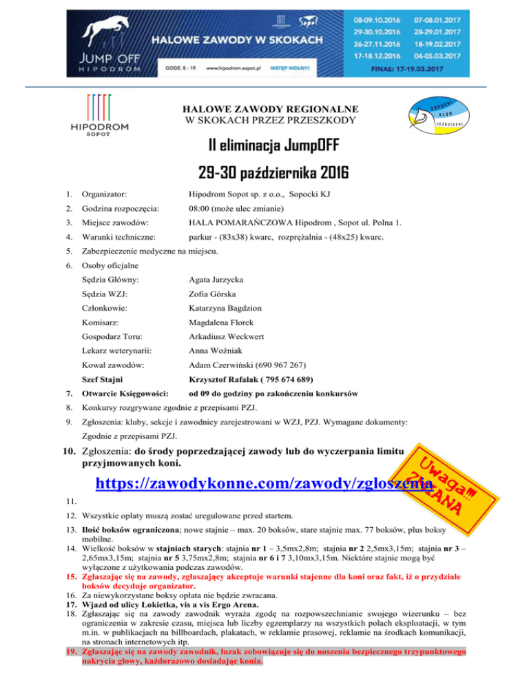 HALOWE ZAWODY REGIONALNE W SKOKACH PRZEZ PRZESZKODY II eliminacja JumpOFF 29-30 października 2016 1. Organizator: Hipodrom Sopot sp. z o.o., Sopocki KJ 2. Godzina rozpoczęcia: 08:00 (może ulec zmianie) 3. Miejsce zawodów: HALA POMARAŃCZOWA Hipodrom , Sopot ul. Polna 1. 4. Warunki techniczne: parkur - (83x38) kwarc, rozprężalnia - (48x25) kwarc. 5. Zabezpieczenie medyczne na miejscu. 6. Osoby oficjalne Sędzia Główny: Agata Jarzycka Sędzia WZJ: Zofia Górska Członkowie: Katarzyna Bagdzion Komisarz: Magdalena Florek Gospodarz Toru: Arkadiusz Weckwert Lekarz weterynarii: Anna Woźniak Kowal zawodów: Adam Czerwiński (690 967 267) Szef Stajni Krzysztof Rafalak ( 795 674 689) 7. Otwarcie Księgowości: od 09 do godziny po zakończeniu konkursów 8. Konkursy rozgrywane zgodnie z przepisami PZJ. 9. Zgłoszenia: kluby, sekcje i zawodnicy zarejestrowani w WZJ, PZJ. Wymagane dokumenty: Zgodnie z przepisami PZJ. 10. Zgłoszenia: do środy poprzedzającej zawody lub do wyczerpania limitu przyjmowanych koni. https://zawodykonne.com/zawody/zgloszenia 11. 12. Wszystkie opłaty muszą zostać uregulowane przed startem. 13. Ilość boksów ograniczona; nowe stajnie – max. 20 boksów, stare stajnie max. 77 boksów, plus boksy mobilne. 14. Wielkość boksów w stajniach starych: stajnia nr 1 – 3,5mx2,8m; stajnia nr 2 2,5mx3,15m; stajnia nr 3 – 2,65mx3,15m; stajnia nr 5 3,75mx2,8m; stajnia nr 6 i 7 3,10mx3,15m. Niektóre stajnie mogą być wyłączone z użytkowania podczas zawodów. 15. Zgłaszając się na zawody, zgłaszający akceptuje warunki stajenne dla koni oraz fakt, iż o przydziale boksów decyduje organizator. 16. Za niewykorzystane boksy opłata nie będzie zwracana. 17. Wjazd od ulicy Łokietka, vis a vis Ergo Arena. 18. Zgłaszając się na zawody zawodnik wyraża zgodę na rozpowszechnianie swojego wizerunku – bez ograniczenia w zakresie czasu, miejsca lub liczby egzemplarzy na wszystkich polach eksploatacji, w tym m.in. w publikacjach na billboardach, plakatach, w reklamie prasowej, reklamie na środkach komunikacji, na stronach internetowych itp. 19. Zgłaszając się na zawody zawodnik, luzak zobowiązuje się do noszenia bezpiecznego trzypunktowego nakrycia głowy, każdorazowo dosiadając konia. 20. Noclegi: • Pokoje Gościnne na terenie Hipodromu • Hostel Stacja Plaża; -15% na hasło Hipodrom • Partner „Plac Rybaków INN”; -15% na hasło Hipodrom 21. Opłaty Konkursy otwarte: wpisowe - 60 zł za dzień; startowe - zgodnie z klasą konkursu; Boksy: zawody 2 dniowe: nowe stajnie 250zł, stare stajnie 200zł Zawody 3 dniowe: nowe stajnie 300zł, stare stajnie 250zł Prąd do koniowozu: 60 zł/dzień. Płatne z góry przelewem. Namiot: 30zł / zawody Zmiany na listach: 20pln od konia. Psy na terenie obiektu muszą być trzymane na smyczy, niestosowanie się do tego wymogu będzie karane kwotą 500 zł. 22. Zwroty opłat a wycofanie z zawodów • Wycofanie do 72 h przed rozpoczęciem zawodów – zwrot opłaty za boks, wpisowego i startowego • Wycofanie do 48 h przed rozpoczęciem zawodów – zwrot wpisowego i startowego • Wycofanie mniej niż 48 h przed rozpoczęciem zawodów – opłaty nie zostają zwrócone 23. Organizator zastrzega sobie prawo do zmian w programie zawodów oraz ich odwołania. 24. Za ewentualne kradzieże, wypadki, szkody i zdarzenia losowe powstałe w trakcie trwania zawodów lub podczas transportu organizator nie ponosi odpowiedzialności. 25. Konkursy zostaną rozegrane przy minimum 3 zgłoszonych koniach 26. W przypadku dużej ilości koni, w drugim przejeździe konia w klasie L 2fazowej ogranicza się start tylko do 1 fazy. 27. Nagrody finansowe należy odebrać najpóźniej 21 dni po zakończeniu zawodów, w przeciwnym wypadku zostaną one przeksięgowane na poczet organizacji kolejnych zawodów. 28. Koniowozy i auta z trailerami parkować mogą tylko na parkinkgu do tego wyznaczonym. PROGRAM ZAWODÓW SOBOTA Nr Klasa Artykuł Startowe 1. Mini LL 238.1.1 Towarzyski – dokładności 10 zł 2. LL 238.1.1 Towarzyski – dokładności 10 zł 3. L 274.5.3 Dwufazowy 20 zł 4. P 274.5.3 Dwufazowy 30 zł 5. N 238.2.1. Zwykły 40 zł 6. C 238.2.1 Zwykły 50 zł 7. CC 238.2.1 Zwykły 50 zł NIEDZIELA Nr Klasa Artykuł Startowe 8. Mini LL 238.1.1 Towarzyski – dokładności 10 zł 9. LL 238.1.1 Towarzyski – dokładności z trafieniem w normę czasu 10 zł 10. L 238.1.1 Zwykły 20 zł 11. P 238.2.1 Zwykły 30 zł 12. N 274.5.3 Dwufazowy 40 zł 13. C 274.5.3 Dwufazowy 50 zł 14. CC 238.2.1 Zwykły 50 zł Nagrody: klasa LL – flo, puchary; klasa L – CC do podziału 100% ze startowego Propozycje Zatwierdzone przez Pomorski ZJ 07.10.2016, kor. 10.10
