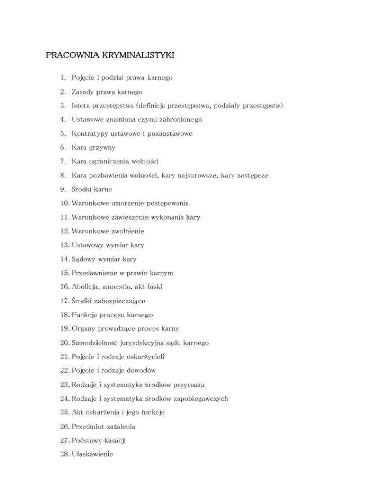 PRACOWNIA KRYMINALISTYKI 1. Pojęcie i podział prawa karnego 2. Zasady prawa karnego 3. Istota przestępstwa (definicja przestępstwa, podziały przestępstw) 4. Ustawowe znamiona czynu zabronionego 5. Kontratypy ustawowe i pozaustawowe 6. Kara grzywny 7. Kara ograniczenia wolności 8. Kara pozbawienia wolności, kary najsurowsze, kary zastępcze 9. Środki karne 10. Warunkowe umorzenie postępowania 11. Warunkowe zawieszenie wykonania kary 12. Warunkowe zwolnienie 13. Ustawowy wymiar kary 14. Sądowy wymiar kary 15. Przedawnienie w prawie karnym 16. Abolicja, amnestia, akt łaski 17. Środki zabezpieczające 18. Funkcje procesu karnego 19. Organy prowadzące proces karny 20. Samodzielność jurysdykcyjna sądu karnego 21. Pojęcie i rodzaje oskarżycieli 22. Pojęcie i rodzaje dowodów 23. Rodzaje i systematyka środków przymusu 24. Rodzaje i systematyka środków zapobiegawczych 25. Akt oskarżenia i jego funkcje 26. Przedmiot zażalenia 27. Podstawy kasacji 28. Ułaskawienie 29. Efektywność kary pozbawienia wolności 30. Organy postępowania wykonawczego i ich właściwość 31. Sądowa kontrola decyzji organów postępowania wykonawczego, nadzór penitencjarny 32. Pojęcie skazanego na gruncie KKW a zasada podmiotowego traktowania 33. Zasady swoiste dla prawa karnego wykonawczego 34. Środki oddziaływania penitencjarnego 35. Środki probacyjne 36. Istota systemów AFIS 37. Metody i etapy przeprowadzania oględzin 38. Funkcje kryminalistyki 39. Podział śladów ze względu na ich zewnętrzną postać i na dział techniki kryminalistycznej 40. Podobieństwa i różnice między wizją lokalną a oględzinami 41. Istota pojęcia okazanie miejsca, wskazanie miejsca; podobieństwa i różnice 42. Znamiona śmierci biologicznej całego ustroju możliwe do ustalenia na miejscu zdarzenia 43. Przedmiot i definicja kryminalistyki 44. Kryminalistyczne funkcje śladów 45. Przestępczość jako zjawisko społeczne w aspekcie statycznym jak i dynamicznym 46. Pojęcie kryminologii oraz jej działy; etiologia i symptomatologia przestępczości i zjawisk ze sfery patologii życia społecznego