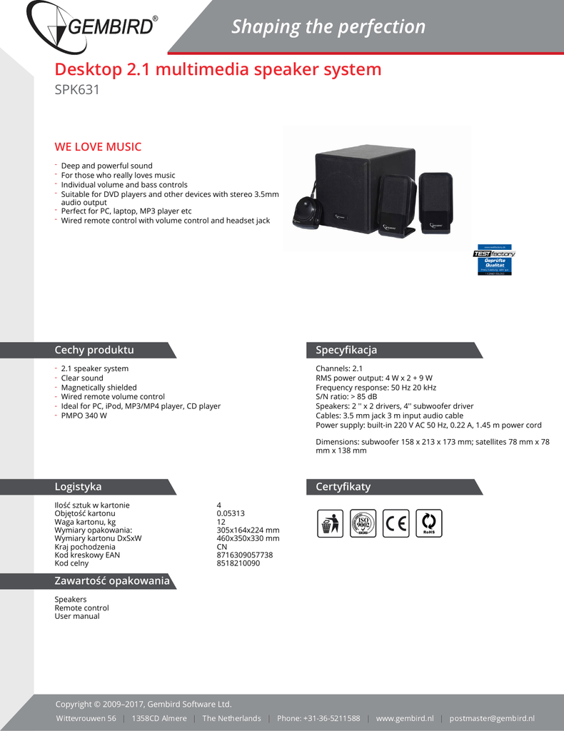 Desktop 2.1 multimedia speaker system SPK631 WE LOVE MUSIC - Deep and powerful sound For those who really loves music Individual volume and bass controls Suitable for DVD players and other devices with stereo 3.5mm audio output - Perfect for PC, laptop, MP3 player etc - Wired remote control with volume control and headset jack Cechy produktu Specyfikacja - Channels: 2.1 RMS power output: 4 W x 2 + 9 W Frequency response: 50 Hz 20 kHz S/N ratio: > 85 dB Speakers: 2 '' x 2 drivers, 4'' subwoofer driver Cables: 3.5 mm jack 3 m input audio cable Power supply: built-in 220 V AC 50 Hz, 0.22 A, 1.45 m power cord 2.1 speaker system Clear sound Magnetically shielded Wired remote volume control Ideal for PC, iPod, MP3/MP4 player, CD player PMPO 340 W Dimensions: subwoofer 158 x 213 x 173 mm; satellites 78 mm x 78 mm x 138 mm Logistyka Certyfikaty Ilość sztuk w kartonie Objętość kartonu Waga kartonu, kg Wymiary opakowania: Wymiary kartonu DxSxW Kraj pochodzenia Kod kreskowy EAN Kod celny 4 0.05313 12 305x164x224 mm 460x350x330 mm CN 8716309057738 8518210090 Zawartość opakowania Speakers Remote control User manual Copyright © 2009–2017, Gembird Software Ltd. ! " # $ ! "
