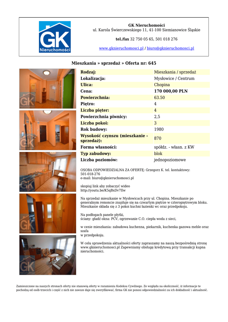 GK Nieruchomości ul. Karola Świerczewskiego 11, 41-100 Siemianowice Śląskie tel./fax 32 750 05 65, 501 018 276 www.gknieruchomosci.pl / [email protected] Mieszkania » sprzedaż » Oferta nr: 645 Rodzaj: Mieszkania / sprzedaż Lokalizacja: Mysłowice / Centrum Ulica: Chopina Cena: 170 000,00 PLN Powierzchnia: 63.50 Piętro: 4 Liczba pięter: 4 Powierzchnia piwnicy: 2,5 Liczba pokoi: 3 Rok budowy: 1980 Wysokość czynszu (mieszkanie sprzedaż): 870 Forma własności: spółdz. - własn. z KW Typ zabudowy: blok Liczba poziomów: jednopoziomowe OSOBA ODPOWIEDZIALNA ZA OFERTĘ: Grzegorz K. tel. kontaktowy: 501-018-276 e-mail: [email protected] skopiuj link aby zobaczyć wideo http://youtu.be/K5qBxDv7Ilw Na sprzedaż mieszkanie w Mysłowicach przy ul. Chopina. Mieszkanie po generalnym remoncie znajduje się na czwartym piętrze w czteropiętrowym bloku. Mieszkanie składa się z 3 pokoi kuchni łazienki wc oraz przedpokoju. Na podłogach panele płytki, ściany: gładź okna: PCV, ogrzewanie C.O. ciepła woda z sieci, w cenie mieszkania: zabudowa kuchenna, piekarnik, kuchenka gazowa meble oraz szafa w przedpokoju. W celu sprawdzenia aktualności oferty zapraszamy na naszą bezpośrednią stronę www.gknieruchomosci.pl Zapewniamy obsługę kredytową przy transakcji kupna nieruchomości. Zamieszczone na naszych stronach oferty nie stanowią oferty w rozumieniu Kodeksu Cywilnego. Ze względu na okoliczność, iż informacje te pochodzą od osób trzecich i część z nich nie zawsze daje się zweryfikować, firma GK nie ponosi odpowiedzialności za ich dokładność i aktualność.