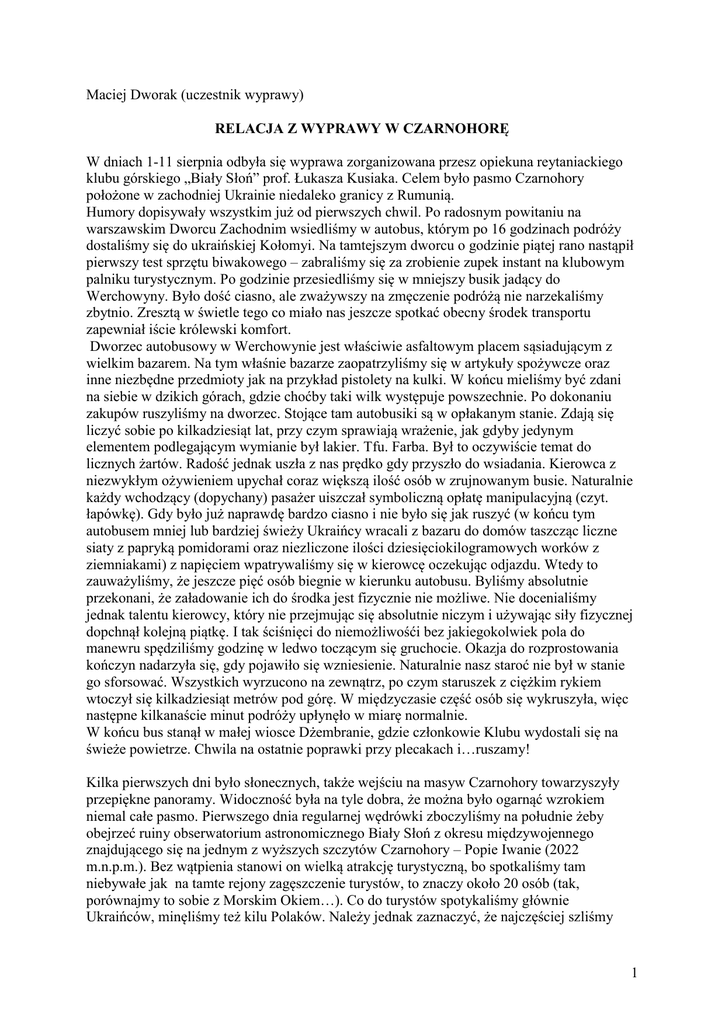 Maciej Dworak (uczestnik wyprawy) RELACJA Z WYPRAWY W CZARNOHORĘ W dniach 1-11 sierpnia odbyła się wyprawa zorganizowana przesz opiekuna reytaniackiego klubu górskiego „Biały Słoń” prof. Łukasza Kusiaka. Celem było pasmo Czarnohory położone w zachodniej Ukrainie niedaleko granicy z Rumunią. Humory dopisywały wszystkim już od pierwszych chwil. Po radosnym powitaniu na warszawskim Dworcu Zachodnim wsiedliśmy w autobus, którym po 16 godzinach podróży dostaliśmy się do ukraińskiej Kołomyi. Na tamtejszym dworcu o godzinie piątej rano nastąpił pierwszy test sprzętu biwakowego – zabraliśmy się za zrobienie zupek instant na klubowym palniku turystycznym. Po godzinie przesiedliśmy się w mniejszy busik jadący do Werchowyny. Było dość ciasno, ale zważywszy na zmęczenie podróżą nie narzekaliśmy zbytnio. Zresztą w świetle tego co miało nas jeszcze spotkać obecny środek transportu zapewniał iście królewski komfort. Dworzec autobusowy w Werchowynie jest właściwie asfaltowym placem sąsiadującym z wielkim bazarem. Na tym właśnie bazarze zaopatrzyliśmy się w artykuły spożywcze oraz inne niezbędne przedmioty jak na przykład pistolety na kulki. W końcu mieliśmy być zdani na siebie w dzikich górach, gdzie choćby taki wilk występuje powszechnie. Po dokonaniu zakupów ruszyliśmy na dworzec. Stojące tam autobusiki są w opłakanym stanie. Zdają się liczyć sobie po kilkadziesiąt lat, przy czym sprawiają wrażenie, jak gdyby jedynym elementem podlegającym wymianie był lakier. Tfu. Farba. Był to oczywiście temat do licznych żartów. Radość jednak uszła z nas prędko gdy przyszło do wsiadania. Kierowca z niezwykłym ożywieniem upychał coraz większą ilość osób w zrujnowanym busie. Naturalnie każdy wchodzący (dopychany) pasażer uiszczał symboliczną opłatę manipulacyjną (czyt. łapówkę). Gdy było już naprawdę bardzo ciasno i nie było się jak ruszyć (w końcu tym autobusem mniej lub bardziej świeży Ukraińcy wracali z bazaru do domów taszcząc liczne siaty z papryką pomidorami oraz niezliczone ilości dziesięciokilogramowych worków z ziemniakami) z napięciem wpatrywaliśmy się w kierowcę oczekując odjazdu. Wtedy to zauważyliśmy, że jeszcze pięć osób biegnie w kierunku autobusu. Byliśmy absolutnie przekonani, że załadowanie ich do środka jest fizycznie nie możliwe. Nie docenialiśmy jednak talentu kierowcy, który nie przejmując się absolutnie niczym i używając siły fizycznej dopchnął kolejną piątkę. I tak ściśnięci do niemożliwośći bez jakiegokolwiek pola do manewru spędziliśmy godzinę w ledwo toczącym się gruchocie. Okazja do rozprostowania kończyn nadarzyła się, gdy pojawiło się wzniesienie. Naturalnie nasz staroć nie był w stanie go sforsować. Wszystkich wyrzucono na zewnątrz, po czym staruszek z ciężkim rykiem wtoczył się kilkadziesiąt metrów pod górę. W międzyczasie część osób się wykruszyła, więc następne kilkanaście minut podróży upłynęło w miarę normalnie. W końcu bus stanął w małej wiosce Dżembranie, gdzie członkowie Klubu wydostali się na świeże powietrze. Chwila na ostatnie poprawki przy plecakach i…ruszamy! Kilka pierwszych dni było słonecznych, także wejściu na masyw Czarnohory towarzyszyły przepiękne panoramy. Widoczność była na tyle dobra, że można było ogarnąć wzrokiem niemal całe pasmo. Pierwszego dnia regularnej wędrówki zboczyliśmy na południe żeby obejrzeć ruiny obserwatorium astronomicznego Biały Słoń z okresu międzywojennego znajdującego się na jednym z wyższych szczytów Czarnohory – Popie Iwanie (2022 m.n.p.m.). Bez wątpienia stanowi on wielką atrakcję turystyczną, bo spotkaliśmy tam niebywałe jak na tamte rejony zagęszczenie turystów, to znaczy około 20 osób (tak, porównajmy to sobie z Morskim Okiem…). Co do turystów spotykaliśmy głównie Ukraińców, minęliśmy też kilu Polaków. Należy jednak zaznaczyć, że najczęściej szliśmy 1 kilkanaście godzin nie spotykając żywego ducha. Ot urok dzikich gór. Wraz z dalszą wędrówką na północ pogoda niestety pogarszała się. Z czasem przelotne deszcze przekształcały się w całodzienne ulewy, a gęsta mgła ograniczała widoczność do około 30 metrów. Bardzo trudne warunki pogodowe, oraz zmęczenie (Czarnohora charakteryzuje się ciągłymi stromymi zejściami i podejściami) spowodowały, że zmuszeni byliśmy zejść z głównego masywu i szukać schronienia przed wichurą i deszczem między drzewami. Trafiliśmy tam na wiatę, pod którą zorganizowaliśmy długi postój w czasie którego intensywnie suszyliśmy ubrania przy ognisku. Nasza kuchnia pomimo oczywistych ograniczeń (kilkudniowe zapasy jedzenia nosiliśmy w plecakach) była w miarę urozmaicona, jednak podstawą wszelkich posiłków był ryż lub makaron. Przyrządzanie posiłków odbywało się na ognisku i dostarczało nam wiele frajdy. W tym miejscu wypada wspomnieć o naszej życiodajnej wodzie. Otóż gotowanie czy parzenie herbaty bez wody jest wbrew pozorom nie możliwe. Dlatego też wszelkie miejsca biwaków wybierane były pod kątem występowania strumienia. Spaliśmy w namiotach, dwóch dwuosobowych i jednym trzyosobowym. Ze względu na to, że przed snem zawsze przyrządzaliśmy posiłki wieczorem zawsze paliło się ognisko. Siedząc przy nim graliśmy w mafię, pokera oraz rozmawialiśmy i śmialiśmy się. W noszeniu namiotów obowiązywał system rotacyjny w obrębie jego mieszkańców, co gwarantowało sprawiedliwy podział ciężaru. Troszkę mniej sprawiedliwy był system podziału żywności, ponieważ jeśli ktoś włożył do plecaka cztery bochenki chleba, deklarował, że nie ma więcej miejsca, i wszystkie „małe” puszki musi wziąć kto inny. Zawsze jednak staraliśmy się być obiektywni i na bieżąco korygować przydziały wagowo, nie objętościowo. W deszczu i mgle zdobyliśmy najwyższy pas Czar