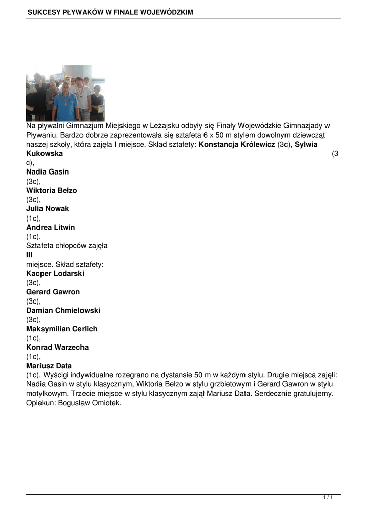 SUKCESY PŁYWAKÓW W FINALE WOJEWÓDZKIM Na pływalni Gimnazjum Miejskiego w Leżajsku odbyły się Finały Wojewódzkie Gimnazjady w Pływaniu. Bardzo dobrze zaprezentowała się sztafeta 6 x 50 m stylem dowolnym dziewcząt naszej szkoły, która zajęła I miejsce. Skład sztafety: Konstancja Królewicz (3c), Sylwia Kukowska (3 c), Nadia Gasin (3c), Wiktoria Bełzo (3c), Julia Nowak (1c), Andrea Litwin (1c). Sztafeta chłopców zajęła III miejsce. Skład sztafety: Kacper Lodarski (3c), Gerard Gawron (3c), Damian Chmielowski (3c), Maksymilian Cerlich (1c), Konrad Warzecha (1c), Mariusz Data (1c). Wyścigi indywidualne rozegrano na dystansie 50 m w każdym stylu. Drugie miejsca zajęli: Nadia Gasin w stylu klasycznym, Wiktoria Bełzo w stylu grzbietowym i Gerard Gawron w stylu motylkowym. Trzecie miejsce w stylu klasycznym zajął Mariusz Data. Serdecznie gratulujemy. Opiekun: Bogusław Omiotek. 1/1