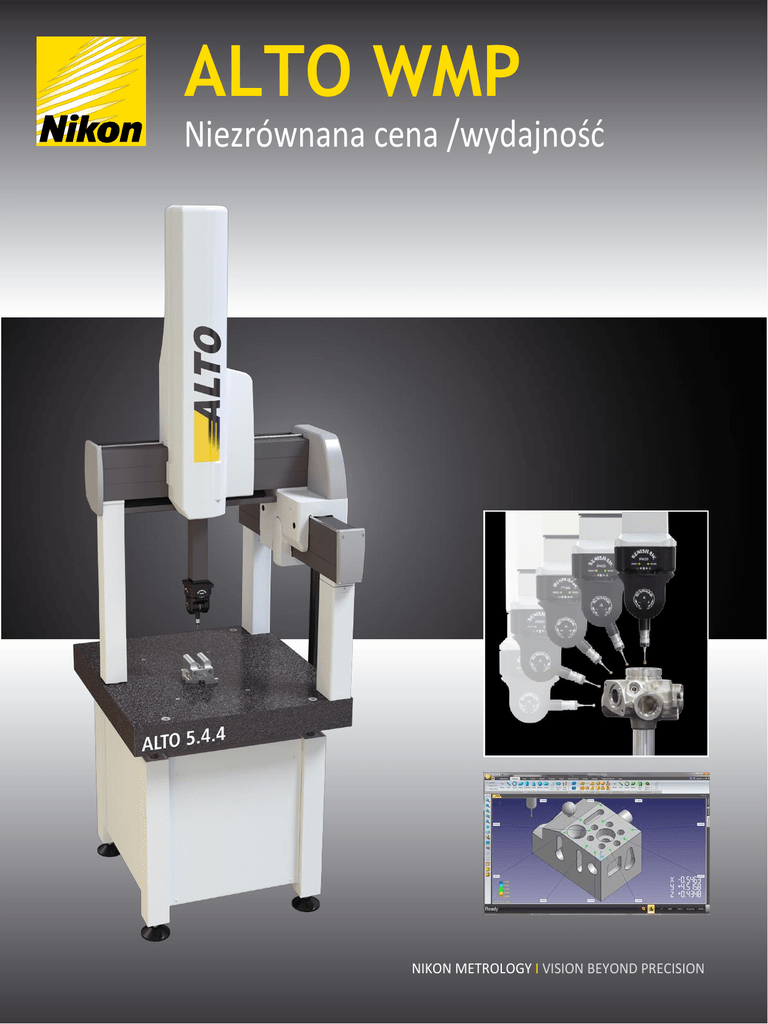ALTO WMP Niezrównana cena /wydajnośd NIKON METROLOGY I VISION BEYOND PRECISION EKONOMICZNA METROLOGIA SPRAWDZONA JAKOŚĆ ALTO jest idealnym rozwiązaniem dla producentów poszukujących ekonomicznej WMP z łatwym w użyciu oprogramowaniem do wielu zastosowao. • Łatwe w użyciu oprogramowanie Od pojedynczych pomiarów do całkowitej kontroli, od kalibracji narzędzi do ich diagnostyki, ALTO jest idealnym narzędziem kontroli jakości zarówno do działów produkcji jak i profesjonalnych laboratoriów pomiarowych. • Uniwersalne rozwiązanie Mały półbramowy projekt łączy w sobie aluminiową konstrukcję, łożyskowanie powietrzne i supernowoczesną elektronikę z obecnie najbardziej inteligentnym oprogramowaniem do maszyn współrzędnościowych w celu uzyskania najlepszej wydajności. Każda maszyna ALTO zbudowana jest zgodne z rygorystycznymi standardami jakości i podparta jest gwarancją producenta oraz wsparciem serwisowym na najwyższym światowym poziomie. • Prowadnica oraz pinola wykonana z precyzyjnie obrobionego stopu aluminium pozwalają na uzyskanie dużej dokładności • Niewymagające konserwacji łożyska powietrzne zapewniają wysoką stabilnośd • Brak histerezy napędu zapewnia płynne sterowanie ruchem maszyny. • Wysokiej jakości skala optyczna o rozdzielczości 0.1 µm • Maszyna dostępna także w wersji manualnej z możliwością modernizacji do wersji automatycznej. 2 • Jakość w przystępnej cenie • Wyjątkowa wydajność • Automatyczna lub manualna • Małe rozmiary INTELIGENTE OPROGRAMOWANIE BARDZO INTUICYJNA OBSŁUGA CMM Manager jest łatwy do opanowania dla użytkowników na wszystkich poziomach zaawansowania zaledwie w kilka godzin. Inteligentne narzędzia programowe takie jak szybie mierzenie czy zmierzenie zaznaczonego elementu na rysunku CAD prowadzą użytkownika przez proces inspekcji i zwiększają produktywnośd. Raporty graficzne błyskawicznie dostarczają zwięzłą analizę danych i mogą byd łatwo przekazywane innym za pośrednictwem raportowania Web. Zintegrowane środowisko. • • • • • Łatwy do nauczenia interfejs użytkownika Efektywne procedury „kliknij i zmierz” Prosta ścieżka kontroli elementów Wirtualna symulacja i weryfikacja ścieżki w czasie rzeczywistym. Program wspierający części DIMS Zaawansowanie planowanie ścieżki • • • • Automatyczny dobór kąta głowicy Inteligentne unikanie kolizji Automatyczne wykrywanie kolizji Optymalizacja ścieżki inspekcji Wygodne raportowanie • • • • • Pełne wsparcie dla ASME Y14.5 GD&T Graficzne ukazanie definicji tolerancji Graficzne narzędzie do szybkiego raportowania wymiarów Raporty w formacie HTML Kompatybilnośd z Excelem i AS9102 3 GŁOWICE ALTO MH20i PH20* • Manualna głowica ze zintegrowaną sondą stykową • Obrót ±180°, pochylenie 0-90°, 168 powtarzalnych pozycji, ze sokiem co 15° • Powtarzalna zmiana sond • Zaawansowana automatyczna głowica 5osiowa ze zintegrowaną sondą stykową • Nieograniczony obrót, pochylenie od 115° do 105°, nieograniczona liczba pozycji • Powtarzalna zmiana sond RTP20 • Ekonomiczna automatyczna głowica ze zintegrowaną sondą stykową • Obrót ±180°, pochylenie 0-90°, 168 powtarzalnych pozycji, ze sokiem co 15° • Powtarzalna zmiana sond changers PH10 PLUS* • Standardowa przemysłowa automatyczna głowica ze zintegrowaną sondą pomiarową. • Obrót ±180°, pochylenie 0-105°, 720 powtarzalnych pozycji, ze sokiem co 7,5° • Powtarzalna zmiana sond *SPECJANA PROMOCJA Darmowa zamiana głowic wszystkich automatycznych głowic Renishaw, gdy zostaną zakupione jako częśd pakietu WMP ALTO ROZMIARY MODELI Zakres pomiarowy X Y Z ALTO 5.4.4 500 mm (19.7”) 400 mm (15.7”) 440 mm (17.3”) 929 mm (36.6”) 888 mm (35.0”) ALTO 6.5.4 600 mm (23.6”) 500 mm (19.7”) 440 mm (17.3”) 1044 mm (41.1”) 1018 mm (40.0”) Szerokośd Długośd Wysokośd NIKON METROLOGY NV NIKON CORPORATION Geldenaaksebaan 329 B-3001 Leuven, Belgium phone: +32 16 74 01 00 fax: +32 16 74 01 03 [email protected] Shinagawa Intercity Tower C, 2-15-3, Konan, Minato-ku, Tokyo 108-6290 Japan phone: +81-3-6433-3701 fax: +81-3-6433-3784 www.nikon-instruments.jp/eng/ Centrum Prezentacji i Pomiarów ul. Kupiecka 11 03-046 Warszawa Tel. 22 5041979 [email protected] Masa Wymiary zewnętrzne Centrum Prezentacji 3D Wydział Mechaniczny PK al. Jana Pawła II 37 31-864 Kraków Części Maszyny 2411 mm (94.9”) 300 kg (660 lbs) 300 kg (660 lbs) 2411 mm (94.9”) 300 kg (660 lbs) 390 kg (860 lbs) Centrum Prezentacji i Pomiarów Wrocławski Park Technologiczny Ul. Duńska 13, 54-424 Wrocław Translation by Smart Solutions 2016.06.30. All right reserved. More offices and resellers at www.nikonmetrology.com ALTO_EN_0415– Copyright Nikon Metrology NV 2015. All rights reserved. The materials presented here are summary in nature, subject to change and intended for general information only. CONFIGURACJE