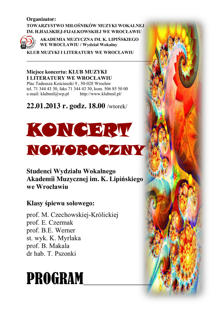 Organizator: TOWARZYSTWO MIŁOŚNIKÓW MUZYKI WOKALNEJ IM. H.HALSKIEJ-FIJAŁKOWSKIEJ WE WROCŁAWIU AKADEMIA MUZYCZNA IM. K. LIPIŃSKIEGO WE WROCŁAWIU / Wydział Wokalny KLUB MUZYKI I LITERATURY WE WROCŁAWIU __________________________________________________________________ Miejsce koncertu: KLUB MUZYKI I LITERATURY WE WROCŁAWIU Plac Tadeusza Kościuszki 9 , 50-028 Wrocław tel. 71 344 43 30, faks 71 344 43 30, kom. 506 85 50 00 e-mail: [email protected] http://www.klubmil.pl/ 22.01.2013 r. godz. 18.00 /wtorek/ KONCERT NOWOROCZNY Studenci Wydziału Wokalnego Akademii Muzycznej im. K. Lipińskiego we Wrocławiu Klasy śpiewu solowego: prof. M. Czechowskiej-Królickiej prof. E. Czermak prof. B.E. Werner st. wyk. K. Myrlaka prof. B. Makala dr hab. T. Pszonki PROGRAM__________________ WYKONAWCY KONCERTU_____________________ soliści śpiewacy: A. BARTNIK N. HALICKA A. LISOWSKA S. RETERSKA A. DRYGLAS J. LECH -sopran -sopran -sopran -sopran -tenor -baryton M. BEUCHER T. HAWRO A. MALISZ K. STAROŃ P. ZDEBSKI -sopran -sopran -sopran -sopran -tenor pianiści: M. CZECHOWSKA-KRÓLICKA, M. KOKOTAJŁO J. LITWIN-FENC A. ORŁUKOWICZ, J. SKOCZEK PROGRAM______________________________________ W.A. Mozart N. Dostala - An Chloe - aria Clivii z operetki „Clivia” Wykonawcy: Aleksandra Lisowska –sopran Maria Czechowska-Królicka –fortepian W. A. Mozart W. A. Mozart - Czarodziej - rec. i aria Zuzanny z opery „Wesele Figara” Wykonawca: Sylwia Reterska –sopran Joanna Litwin-Fenc –fortepian L. de Libes - duet kwiatów „Dôme épais le jasmin” z op. „Lakmé” Wykonawcy: Marcelina Beucher –sopran Aleksandra Lisowska –sopran Maria Czechowska-Królicka –fortepian R. Schumann J. Brahms - Dein Augesicht Op.127 nr 2 - Wie bist du, mein Königin Op.32 nr 9 Wykonawcy: Jakub Lech –baryton Maria Kokotajło –fortepian W.A. Mozart W.A. Mozart - aria Aspazji z I aktu „Al destin” z opery „Mitridate, re di Ponto” KV 87 - aria Modemoiselle Silberklang „Beste Jungling” z opery „Dyrektor Teatru” KV 486 Wykonawcy: Aleksandra Malisz –sopran Aleksandra Orłukowicz –fortepian Fr. Lehar L. Różycki - aria Anny Elizy „Liebe du himmel auf Erden” z operetki „Paganini” - pieśń Caton „To dawny mój znajomy” z operetki „Casanowa” Wykonawcy: Marcelina Beucher –sopran Maria Czechowska-Królicka –fortepian S. Madeyski P. Lincke - Krakowiak - Lecą świetliki - gawot z operetki „Lizystrata” Wykonawca: Teresa Hawro –sopran Joanna Litwin-Fenc –fortepian J. Offenbach - barkarola z operetki „Opowieści Hoffman” Wykonawcy: Aleksandra Lisowska –sopran Marcelina Beucher –sopran Maria Czechowska-Królicka –fortepian J. Strauss - aria Adeli „Mein Herr Marquis” z operetki „Zemsta Nietoperza” Wykonawcy: Aldona Bartnik –sopran Justyna Skoczek – fortepian F. Lehár - duet Hanny i Danily „Usta milczą dusza śpiewa…” z operetki „Die lustige Witwe” Wykonawcy: Katarzyna Staroń –sopran Paweł Zdebski –tenor Joanna Litwin-Fenc –fortepian F. Loewe Ch. Gounod - aria „Przetańczyć całą noc” z musical'u „My Fair Lady” - aria Małgorzaty z opery „Faust” Wykonawcy: Natalia Halicka –sopran Aleksandra Orłukowicz –fortepian R. Stolz I. Kálmán - aria „Spiel auf deiner Geige Zigeuner” z operetki „Venus in Seide” - aria Sylwy „Czardasz, czardasz” z operetki „Die Csárdásfürstin” Wykonawca: Katarzyna Staroń –sopran Joanna Litwin-Fenc –fortepian I. Kálmán - duet „Co się dzieje oszaleję” z opery „Księżniczka Czardasza” Wykonawcy: Natalia Halicka –sopran Aleksander Dryglas –tenor Aleksandra Orłukowicz –fortepian KLUB MUZYKI I LITERATURY WE WROCŁAWIU Plac Tadeusza Kościuszki 9 , 50-028 Wrocław tel. 71 344 43 30, faks 71 344 43 30, kom. 506 85 50 00 e-mail: [email protected] http://www.klubmil.pl/ _________________________________________________________________ Wykonawcy koncertu serdecznie dziękują Dyrekcji Klubu Muzyki i Literatury we Wrocławiu za możliwość zorganizowania koncertu i stworzenie wyjątkowo miłej, twórczej atmosfery !