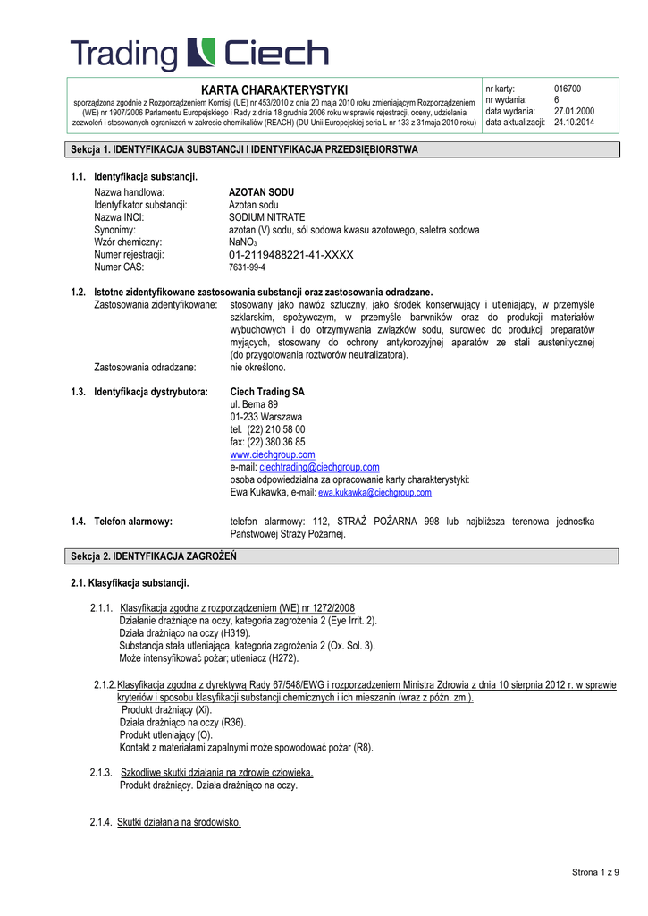 KARTA CHARAKTERYSTYKI sporządzona zgodnie z Rozporządzeniem Komisji (UE) nr 453/2010 z dnia 20 maja 2010 roku zmieniającym Rozporządzeniem (WE) nr 1907/2006 Parlamentu Europejskiego i Rady z dnia 18 grudnia 2006 roku w sprawie rejestracji, oceny, udzielania zezwoleń i stosowanych ograniczeń w zakresie chemikaliów (REACH) (DU Unii Europejskiej seria L nr 133 z 31maja 2010 roku) nr karty: nr wydania: data wydania: data aktualizacji: 016700 6 27.01.2000 24.10.2014 Sekcja 1. IDENTYFIKACJA SUBSTANCJI I IDENTYFIKACJA PRZEDSIĘBIORSTWA 1.1. Identyfikacja substancji. Nazwa handlowa: Identyfikator substancji: Nazwa INCI: Synonimy: Wzór chemiczny: Numer rejestracji: Numer CAS: AZOTAN SODU Azotan sodu SODIUM NITRATE azotan (V) sodu, sól sodowa kwasu azotowego, saletra sodowa NaNO3 01-2119488221-41-XXXX 7631-99-4 1.2. Istotne zidentyfikowane zastosowania substancji oraz zastosowania odradzane. Zastosowania zidentyfikowane: stosowany jako nawóz sztuczny, jako środek konserwujący i utleniający, w przemyśle szklarskim, spożywczym, w przemyśle barwników oraz do produkcji materiałów wybuchowych i do otrzymywania związków sodu, surowiec do produkcji preparatów myjących, stosowany do ochrony antykorozyjnej aparatów ze stali austenitycznej (do przygotowania roztworów neutralizatora). Zastosowania odradzane: nie określono. 1.3. Identyfikacja dystrybutora: Ciech Trading SA ul. Bema 89 01-233 Warszawa tel. (22) 210 58 00 fax: (22) 380 36 85 www.ciechgroup.com e-mail: [email protected] osoba odpowiedzialna za opracowanie karty charakterystyki: Ewa Kukawka, e-mail: [email protected] 1.4. Telefon alarmowy: telefon alarmowy: 112, STRAŻ POŻARNA 998 lub najbliższa terenowa jednostka Państwowej Straży Pożarnej. Sekcja 2. IDENTYFIKACJA ZAGROŻEŃ 2.1. Klasyfikacja substancji. 2.1.1. Klasyfikacja zgodna z rozporządzeniem (WE) nr 1272/2008 Działanie drażniące na oczy, kategoria zagrożenia 2 (Eye Irrit. 2). Działa drażniąco na oczy (H319). Substancja stała utleniająca, kategoria zagrożenia 2 (Ox. Sol. 3). Może intensyfikować pożar; utleniacz (H272). 2.1.2. Klasyfikacja zgodna z dyrektywą Rady 67/548/EWG i rozporządzeniem Ministra Zdrowia z dnia 10 sierpnia 2012 r. w sprawie kryteriów i sposobu klasyfikacji substancji chemicznych i ich mieszanin (wraz z późn. zm.). Produkt drażniący (Xi). Działa drażniąco na oczy (R36). Produkt utleniający (O). Kontakt z materiałami zapalnymi może spowodować pożar (R8). 2.1.3. Szkodliwe skutki działania na zdrowie człowieka. Produkt drażniący. Działa drażniąco na oczy. 2.1.4. Skutki działania na środowisko. Strona 1 z 9 nr karty: nr wydania: data wydania: data aktualizacji: KARTA CHARAKTERYSTYKI AZOTAN SODU 016700 6 27.01.2000 24.10.2014 Produkt nie jest klasyfikowany jako niebezpieczny dla środowiska. 2.1.5. Skutki działania związane z właściwościami fizykochemicznymi. Może intensyfikować pożar; utleniacz. 2.2. Elementy oznakowania. Zgodne z rozporządzeniem (WE) nr 1272/2008: Piktogramy: Hasło ostrzegawcze: Uwaga Zwroty wskazujące rodzaj zagrożenia: H272 - Może intensyfikować pożar; utleniacz. H319 - Działa drażniąco na oczy. Zwroty wskazujące środki ostrożności: Zapobieganie: P210 - Przechowywać z dala od źródeł ciepła/iskrzenia/otwartego ognia/gorących powierzchni. Palenie wzbronione. P220 - Trzymać/przechowywać z dala od odzieży/materiałów zapalnych. P270 - Nie jeść, nie pić i nie palić podczas używania produktu. P280 - Stosować ochronę oczu/ochronę twarzy. Reagowanie: P305+P351+P338 - W przypadku dostania się do oczu: Ostrożnie płukać wodą przez kilka minut. Wyjąć soczewki kontaktowe, jeżeli są i można je łatwo usunąć. Nadal płukać. P370+P378 - W przypadku pożaru: użyć odpowiednich środków gaśniczych (woda) dla materiałów będących w pobliżu do gaszenia. Przechowywanie: Nie ma szczególnych zaleceń. Usuwanie: Nie ma szczególnych zaleceń. 2.3. Inne zagrożenia. Brak informacji na temat spełnienia kryteriów PBT lub vPvB zgodnie z załącznikiem XIII rozporządzenia REACH. Odpowiednie badania nie były przeprowadzone. Sekcja 3. SKŁAD / INFORMACJA O SKŁADNIKACH Skład Azotan sodu Nr EINECS Nr WE 231-554-3 Nr CAS Nr indeksowy Zawartość 7631-99-4 — >99 % Sekcja 4. ŚRODKI PIERWSZEJ POMOCY 4.1. Opis środków pierwszej pomocy. Wdychanie: Wyprowadzić lub wynieść poszkodowanego z miejsca narażenia, ułożyć w wygodnej pozycji półleżącej lub siedzącej, zapewnić spokój, chronić przed utratą ciepła. Zdjąć zanieczyszczoną odzież. W razie potrzeby wezwać lekarza. Kontakt ze skórą: Zdjąć zanieczyszczoną odzież. Zanieczyszczoną skórę natychmiast przemyć dużą ilością wody z mydłem. W przypadku wystąpienia podrażnienia skonsultować się z lekarzem. Strona 2 z 9 KARTA CHARAKTERYSTYKI AZOTAN SODU nr karty: nr wydania: data wydania: data aktualizacji: 016700 6 27.01.2000 24.10.2014 Kontakt z oczami: Natychmiast płukać dużą ilością letniej wody, najlepiej bieżącej, przez co najmniej 15 min. Usunąć szkła kontaktowe. Unikać silnego strumienia wody ze względu na ryzyko mechanicznego uszkodzenia rogówki. Skonsultować się z lekarzem-okulistą w przypadku utrzymującego się podrażnienia. Przewód pokarmowy: Jeżeli nastąpi połknięcie, nie prowokować wymiotów. Wypłukać usta wodą, a następnie wypić 2-3 szklanki wody. Natychmiast skonsultować się z lekarzem. Pokazać opakowanie lub etykietę. 4.2. Najważniejsze ostre i opóźnione objawy oraz skutki narażenia. Może powodować podrażnienie spojówek, zaczerwienienie, ból. Po spożyciu większych ilości mogą wystąpić nudności, wymioty, bóle żołądka, biegunka, zasinienie warg lub paznokci, skóry, bóle i zawroty głowy, utrata przytomności. Inhalacja może wywołać podrażnienie błon śluzowych, kaszel. 4.3. Wskazania dotyczące wszelkiej natychmiastowej pomocy lekarskiej i szczególnego postępowania z poszkodowanym. Leczenie objawowe. 