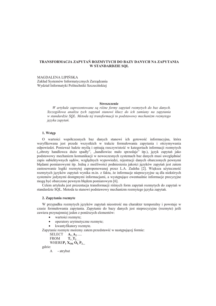 TRANSFORMACJA ZAPYTA ROZMYTYCH DO BAZY DANYCH NA ZAPYTANIA W STANDARDZIE SQL MAGDALENA LIPI SKA Zakład Systemów Informatycznych Zarzdzania Wydział Informatyki Politechniki Szczeciskiej Streszczenie W artykule zaprezentowane są róĪne formy zapytaĔ rozmytych do baz danych. Szczegółowa analiza tych zapytaĔ stanowi klucz do ich zamiany na zapytania w standardzie SQL. Metoda tej transformacji to podstawowy mechanizm rozmytego jĊzyka zapytaĔ. 1. Wstp O wartoci współczesnych baz danych stanowi ich gotowo informacyjna, która weryfikowana jest przede wszystkich w trakcie formułowania zapytania i otrzymywania odpowiedzi. Poniewa ludzie myl i opisuj rzeczywisto w kategoriach informacji rozmytych („obroty handlowca duo spadły”, „handlowiec mało sprzedaje” itp.), jzyk zapyta jako podstawowy mechanizm komunikacji w nowoczesnych systemach baz danych musi uwzgldnia zapis subiektywnych sdów, wzgldnych wypowiedzi, rejestracji danych obarczonych pewnymi błdami pomiarowymi itp. Jedn z moliwoci podniesienia jakoci jzyków zapyta jest zatem zastosowanie logiki rozmytej zaproponowanej przez L.A. Zadeha [2]. Wiksza uyteczno rozmytych jzyków zapyta wynika m.in. z faktu, e informacje nieprecyzyjne s dla niektórych systemów jedynymi dostpnymi informacjami, a wystpujce ewentualnie informacje precyzyjne mog by obarczone pewnym błdem pomiarowym [6]. Celem artykułu jest prezentacja transformacji rónych form zapyta rozmytych do zapyta w standardzie SQL. Metoda ta stanowi podstawowy mechanizm rozmytego jzyka zapyta. 2. Zapytania rozmyte W przypadku rozmytych jzyków zapyta nieostro ma charakter temporalny i powstaje w czasie formułowania zapytania. Zapytanie do bazy danych jest nieprecyzyjne (rozmyte) jeli zawiera przynajmniej jeden z poniszych elementów: • wartoci rozmyte; • operatory arytmetyczne rozmyte; • kwantyfikatory rozmyte. Zapytanie rozmyte moemy zatem przedstawi w nastpujcej formie: SELECT A1 ,A2 ..... FROM T1 ,T2 ...... WHEREP1 XOK OL P2.... gdzie: A - atrybut POLSKIE STOWARZYSZENIE ZARZĄDZANIA WIEDZĄ Seria: Studia i Materiały, nr 2, 2004 51 T - tabela P - predykat prosty OL - operator logiczny (AND, OR) XOK - współczynnik operatora kompensacyjnego (waga, próg reakcji) Natomiast predykat prosty moemy zdefiniowa nastpujco: P = XK KA XO O XW W gdzie: XK – warto podobiestwa dla kwantyfikatora K K- kwantyfikator twardy (istnieje, wszyscy, aden) lub rozmyty (prawie wszyscy, prawie aden) XO – warto podobiestwa dla operatora arytmetycznego O O – operator arytmetyczny twardy (=, !=, <, >, =>, =<) lub rozmyty (prawie =, prawie !=, prawie <, prawie >) XW– warto wg rozkładu moliwoci/podobiestw dla warunku W – konkretna warto lub zmienna lingwistyczna. Tabela 1 Tablica ODDZIAŁ rejestrujca odziały firmy Nr_od Oddział Pozostałe dane 001 Warszawa ...... 002 Szczecin ...... 003 Katowice ...... Tabela 2 Tablica HANDLOWCY rejestrujca dane zatrudnionych w działach handlowych pracowników Nr_h Nazwisko Imi Płe Pozostałe dane Nr_od 001 Jurgiewicz Robert M ...... 001 002 Runiewicz Jan M ...... 003 003 Zalewski Sławomir M ...... 001 004 Kulczycka Joanna K ...... 003 005 Biekowski Wojciech M ...... 002 006 Matczak Regina K ...... 003 007 Rapcewicz Rafał M ...... 002 008 Stanisławski Jan M ...... 001 009 Kowalski Piotr M ...... 001 010 Jasiski Krzysztof M ...... 003 011 Tomczak Edmund M ...... 002 012 Wójtowicz Adam M ...... 002 52 Magdalena LipiĔska Transformacja zapytaĔ rozmytych do bazy danych na zapytania w standardzie SQL Tabela 3 Tablica OBROTY rejestrujca obroty i ich spadek w porównaniu z poprzednim okresem Nr_h Obroty[zł] Spadek [%] 001 10340,00 1 002 4500,00 3 003 2870,00 12 004 5540,00 5 005 9070,00 2 006 3000,00 10 007 6600,00 7 008 2540,00 3 009 9100,00 1 010 1500,00 8 011 2250,00 9 012 3710,00 6 Dla zilustrowania problemu rozwaymy zapytania do przykładowej bazy danych pewnej firmy handlowej, która ma trzy oddziały w Polsce i zatrudnia łcznie 12 handlowców (tab.1,2,3). Podstawowym kryterium oceny pracowników działów handlowych jest poziom ich obrotów oraz jego zmiany w czasie. 2.1. Nieprecyzyjne (rozmyte) wartoci Warto stanowi podstawowy składnik predykatu i w zapytaniu rozmytym moe by zapisana jako konkretna liczba, tekst czy data albo w postaci zmiennej lingwistycznej. Dla atrybutów zapisanych w formacie liczbowym, jakim jest np. poziom obrotów, taka zmienna moe przyjmowa róne wartoci w zalenoci od wysokoci obrotów, co przedstawia tab. 4. W przykładowej bazie danych zamiast szuka handlowców o konkretnym poziomie obrotów szukamy handlowców, których poziom obrotów był bardzo słaby. W miejscu wartoci liczbowej pojawia si zmienna lingwistyczna „bardzo słaby”. Jeeli w rozwaanym zapytaniu przyjmiemy warto wg rozkładu moliwoci na poziomie 0,6 (XW=0,6) to zapytanie rozmyte bdzie miało nastpujc posta : SELECT A.IMIE, A.NAZWISKO FROM HANDLOWCY A, OBROTY B WHEREA.NR_H=B.NR_H AND B.OBROTY = 0.6 „BARDZO SŁABY” Wanym zadaniem w realizacji zapytania jest rozumienie poj, zmiennych lingwistycznych (w tym przypadku „bardzo słaby”) w kategoriach liczbowych i zapamitywanie ich w bazie danych. Niestety proces rejestrowania rozmytych informacji w tradycyjnej bazie danych cile wie si z ich defuzyfikacj (wyostrzaniem) (tab.4). Jednym z rozwiza, które pozwala na otrzymanie dobrych wyników działania jzyka zapyta, jest okrelenie dla przyjtych wskaników funkcji przynalenoci [6] do zbioru. W tym przykładzie naley zdefiniowa funkcj przynalenoci obrotów do rozmytego zbioru obrotów o POLSKIE STOWARZYSZENIE ZARZĄDZANIA WIEDZĄ Seria: Studia i Materiały, nr 2, 2004 53 bardzo słabym poziomie i obliczy wartoci dla poszczególnych poziomów obrotów. Wiemy, e wszystkie obroty równe i mniejsze od 2000,00 zł traktujemy jako złe lub krytyczne, a równe i wiksze od 4000,00zł s obrotami lepszymi od bardzo słabych, zatem F1 - funkcja okrelajca stopie przynalenoci obrotów do zbioru obrotów O o "bardzo słabym" poziomie przyjmuje dla 