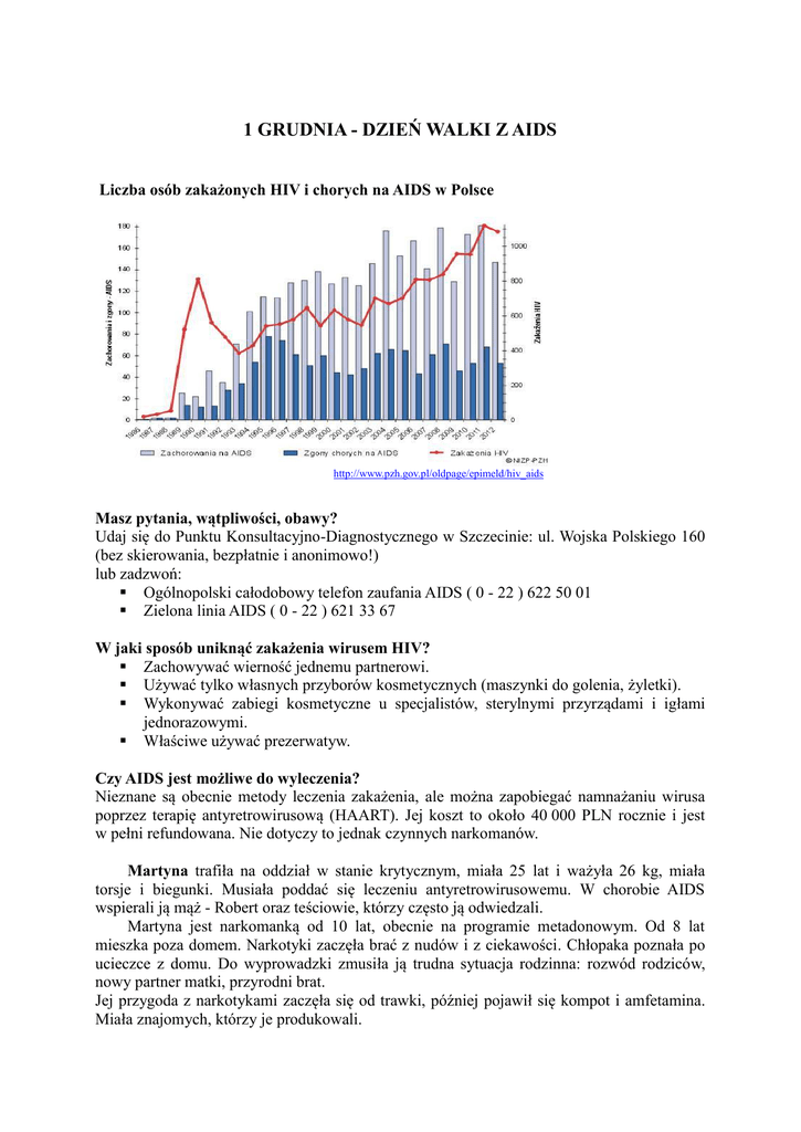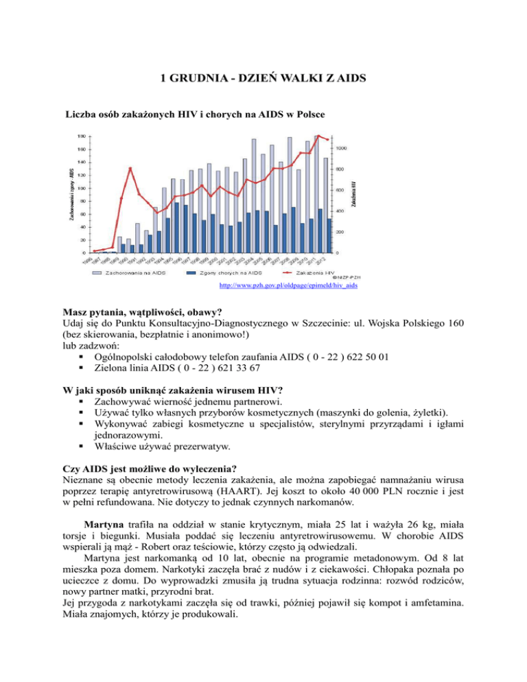 1 GRUDNIA - DZIEŃ WALKI Z AIDS Liczba osób zakażonych HIV i chorych na AIDS w Polsce http://www.pzh.gov.pl/oldpage/epimeld/hiv_aids Masz pytania, wątpliwości, obawy? Udaj się do Punktu Konsultacyjno-Diagnostycznego w Szczecinie: ul. Wojska Polskiego 160 (bez skierowania, bezpłatnie i anonimowo!) lub zadzwoń: Ogólnopolski całodobowy telefon zaufania AIDS ( 0 - 22 ) 622 50 01 Zielona linia AIDS ( 0 - 22 ) 621 33 67 W jaki sposób uniknąć zakażenia wirusem HIV? Zachowywać wierność jednemu partnerowi. Używać tylko własnych przyborów kosmetycznych (maszynki do golenia, żyletki). Wykonywać zabiegi kosmetyczne u specjalistów, sterylnymi przyrządami i igłami jednorazowymi. Właściwe używać prezerwatyw. Czy AIDS jest możliwe do wyleczenia? Nieznane są obecnie metody leczenia zakażenia, ale można zapobiegać namnażaniu wirusa poprzez terapię antyretrowirusową (HAART). Jej koszt to około 40 000 PLN rocznie i jest w pełni refundowana. Nie dotyczy to jednak czynnych narkomanów. Martyna trafiła na oddział w stanie krytycznym, miała 25 lat i ważyła 26 kg, miała torsje i biegunki. Musiała poddać się leczeniu antyretrowirusowemu. W chorobie AIDS wspierali ją mąż - Robert oraz teściowie, którzy często ją odwiedzali. Martyna jest narkomanką od 10 lat, obecnie na programie metadonowym. Od 8 lat mieszka poza domem. Narkotyki zaczęła brać z nudów i z ciekawości. Chłopaka poznała po ucieczce z domu. Do wyprowadzki zmusiła ją trudna sytuacja rodzinna: rozwód rodziców, nowy partner matki, przyrodni brat. Jej przygoda z narkotykami zaczęła się od trawki, później pojawił się kompot i amfetamina. Miała znajomych, którzy je produkowali.