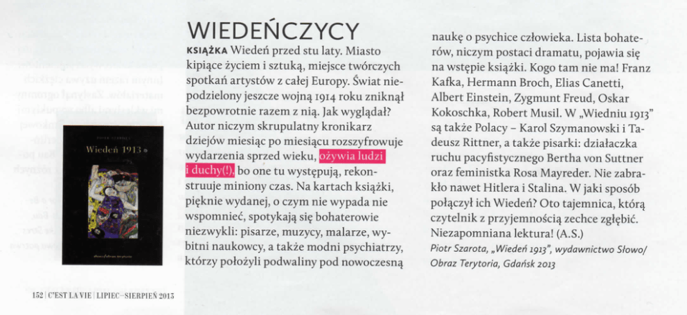 WIEDENCZYCY K S I ^ Z K A Wiederi przed stu laty. Miasto kipiace zyciem i sztukq, miejsce tworczych spotkari artystow z calej Europy. Swiat niepodzielony jeszcze wojna 1914 roku zniknal bezpowrotnie razem z niq. Jak wygladal? Autor niczym skrupulatny kronikarz dziejow miesiac po miesiacu rozszyfrowuje wydarzenia sprzed wieku, Q iBBHtHtil bo one tu wystepujq, rekonstruuje miniony czas. Na kartach ksiazki, pi^knie wydanej, o czym nie wypada nie wspomniec, spotykajq sie bohaterowie niezwykli: pisarze, muzycy, malarze, wybitni naukowcy, a takze modni psychiatrzy, ktorzy polozyli podwaliny pod nowoczesnq nauk§ o psychice czlowieka. Lista bohaterow, niczym postaci dramatu, pojawia sie na wstepie ksiazki. Kogo tam nie ma! Franz Kafka, Hermann Broch, Elias Canetti, Albert Einstein, Zygmunt Freud, Oskar Kokoschka, Robert Musil. W „Wiedniu 1913" sq takze Polacy - Karol Szymanowski i Tadeusz Rittner, a takze pisarki: dzialaczka ruchu pacyfistycznego Bertha von Suttner oraz feministka Rosa Mayreder. Nie zabraklo nawet Hitlera i Stalina. W jaki sposob polaczyl ich Wiederi? Oto tajemnica, ktora czytelnik z przyjemnosciq zechce zgiebic. Niezapomniana lektura! (A.S.) Piotr Szarota, Obraz „Wieden Terytoria, 1913", wydawnictwo Gdansk 2013 Stowo/