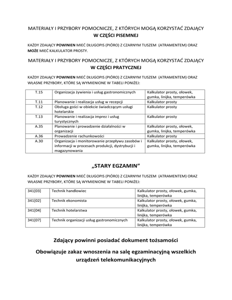 MATERIAŁY I PRZYBORY POMOCNICZE, Z KTÓRYCH MOGĄ KORZYSTAĆ ZDAJĄCY W CZĘŚCI PISEMNEJ KAŻDY ZDAJĄCY POWINIEN MIEĆ DŁUGOPIS (PIÓRO) Z CZARNYM TUSZEM (ATRAMENTEM) ORAZ MOŻE MIEĆ KALKULATOR PROSTY. MATERIAŁY I PRZYBORY POMOCNICZE, Z KTÓRYCH MOGĄ KORZYSTAĆ ZDAJĄCY W CZĘŚCI PRATYCZNEJ KAŻDY ZDAJĄCY POWINIEN MIEĆ DŁUGOPIS (PIÓRO) Z CZARNYM TUSZEM (ATRAMENTEM) ORAZ WŁASNE PRZYBORY, KTÓRE SĄ WYMIENIONE W TABELI PONIŻEJ: T.15 Organizacja żywienia i usług gastronomicznych T.11 T.12 Planowanie i realizacja usług w recepcji Obsługa gości w obiekcie świadczącym usługi hotelarskie Planowanie i realizacja imprez i usług turystycznych Planowanie i prowadzenie działalności w organizacji Prowadzenie rachunkowości Organizacja i monitorowanie przepływu zasobów i informacji w procesach produkcji, dystrybucji i magazynowania T.13 A.35 A.36 A.30 Kalkulator prosty, ołowek, gumka, linijka, temperówka Kalkulator prosty Kalkulator prosty Kalkulator prosty Kalkulator prosty, ołowek, gumka, linijka, temperówka Kalkulator prosty Kalkulator prosty, ołowek, gumka, linijka, temperówka „STARY EGZAMIN” KAŻDY ZDAJĄCY POWINIEN MIEĆ DŁUGOPIS (PIÓRO) Z CZARNYM TUSZEM (ATRAMENTEM) ORAZ WŁASNE PRZYBORY, KTÓRE SĄ WYMIENIONE W TABELI PONIŻEJ: 341[03] Technik handlowiec 341[02] Technik ekonomista 341[04] Technik hotelarstwa 341[07] Technik organizacji usług gastronomicznych Kalkulator prosty, ołowek, gumka, linijka, temperówka Kalkulator prosty, ołowek, gumka, linijka, temperówka Kalkulator prosty, ołowek, gumka, linijka, temperówka Kalkulator prosty, ołowek, gumka, linijka, temperówka Zdający powinni posiadać dokument tożsamości Obowiązuje zakaz wnoszenia na salę egzaminacyjną wszelkich urządzeń telekomunikacyjnych